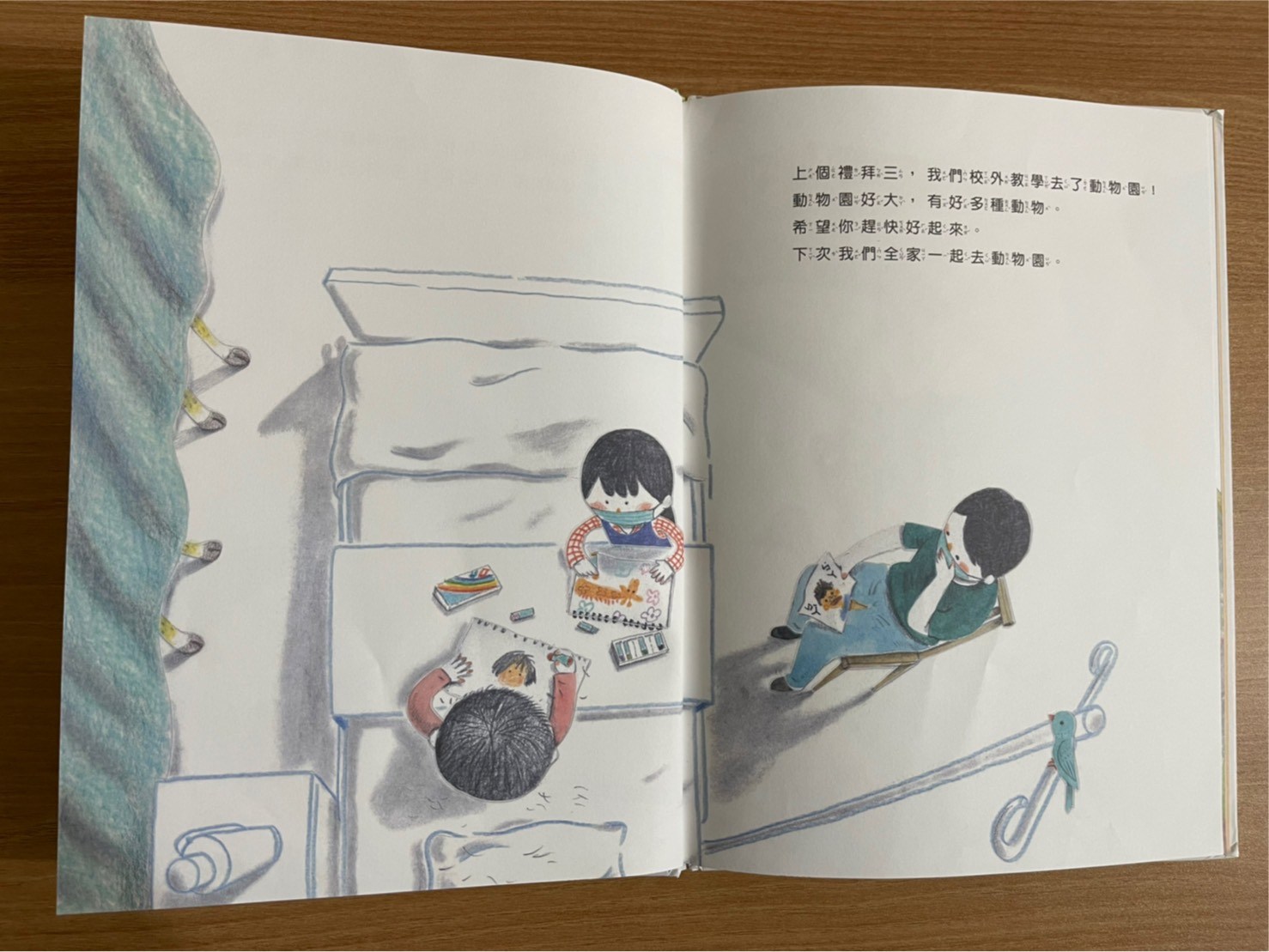 大部分的孩子很幸運,都能夠健健康康的長大,但是世界上卻也還是有很多辛苦的孩子,因為疾病的關係必須長期住在醫院裡,我們常常會把重心放在生病的孩子上,深怕他冷、深怕他不舒服,希望能竭盡所能的讓孩子痊癒,這是人之常情,但這本書的作者用了手足的角度畫出了手足對病童的期望,也讓我在看這本書的時候忽然間驚覺「對!那個健康的手足心裡是怎麼想的呢」