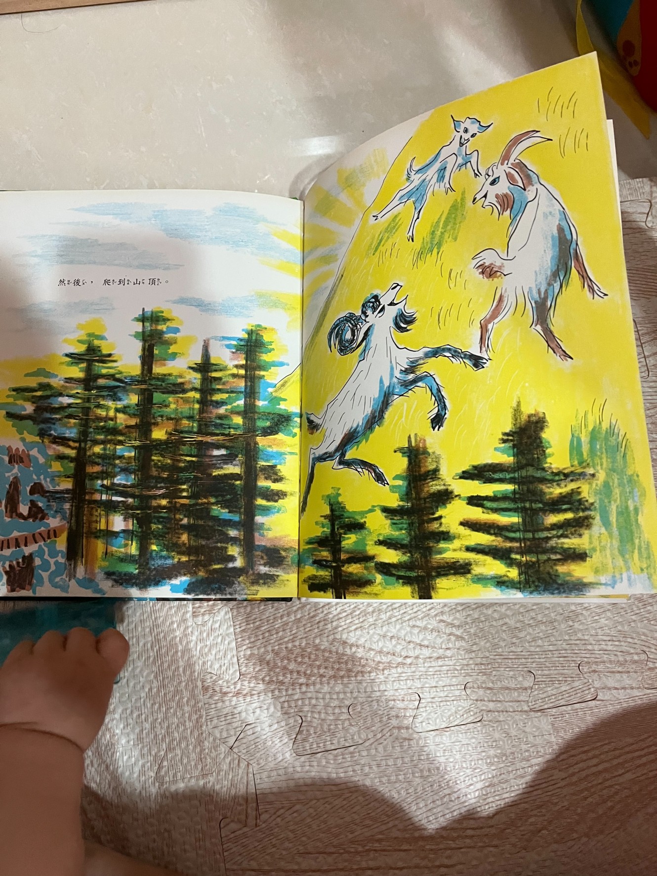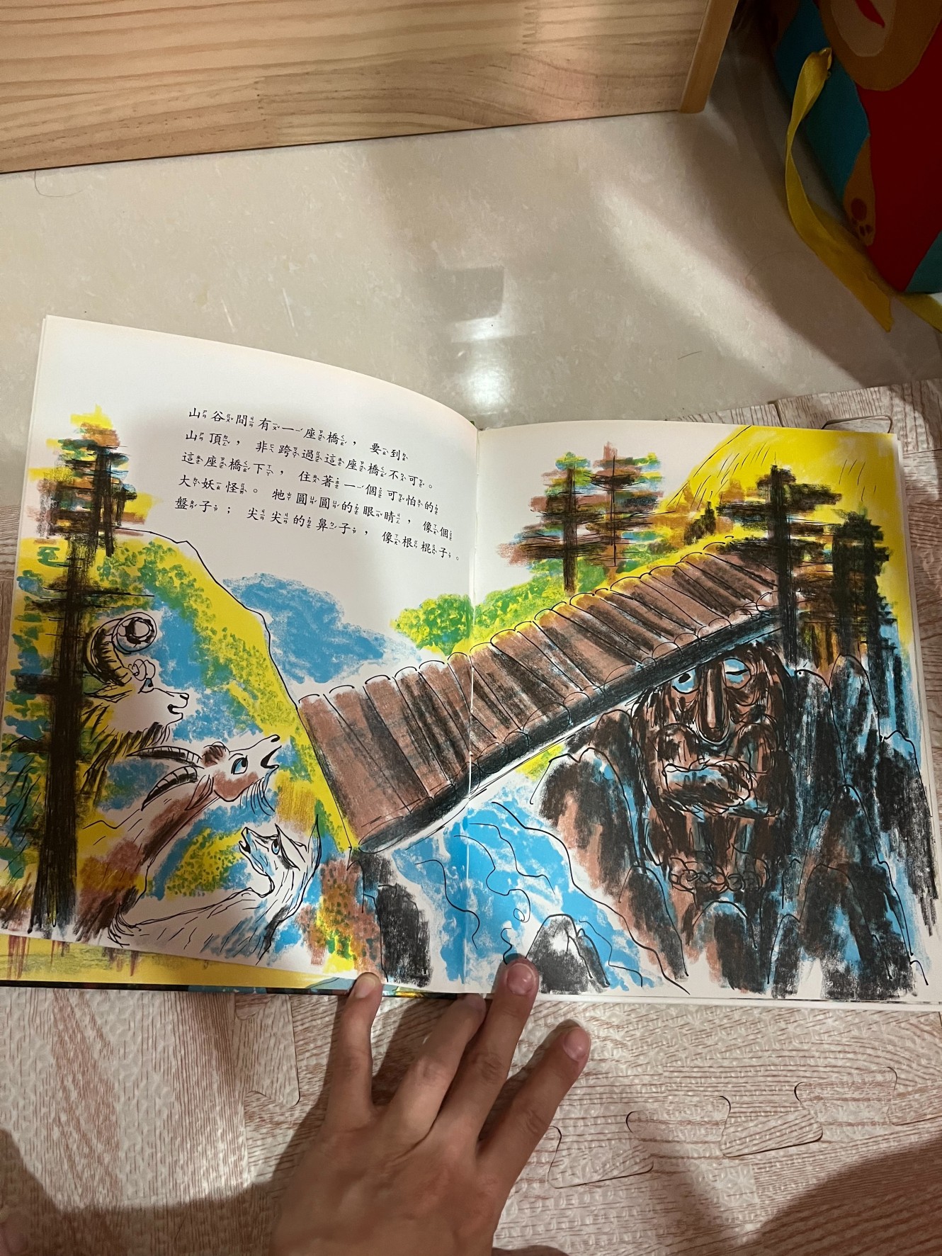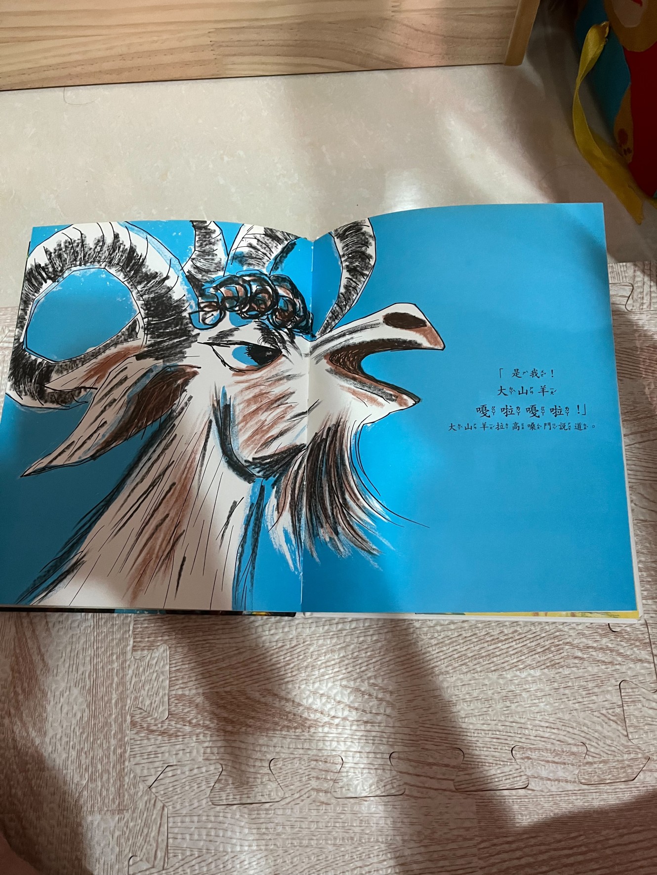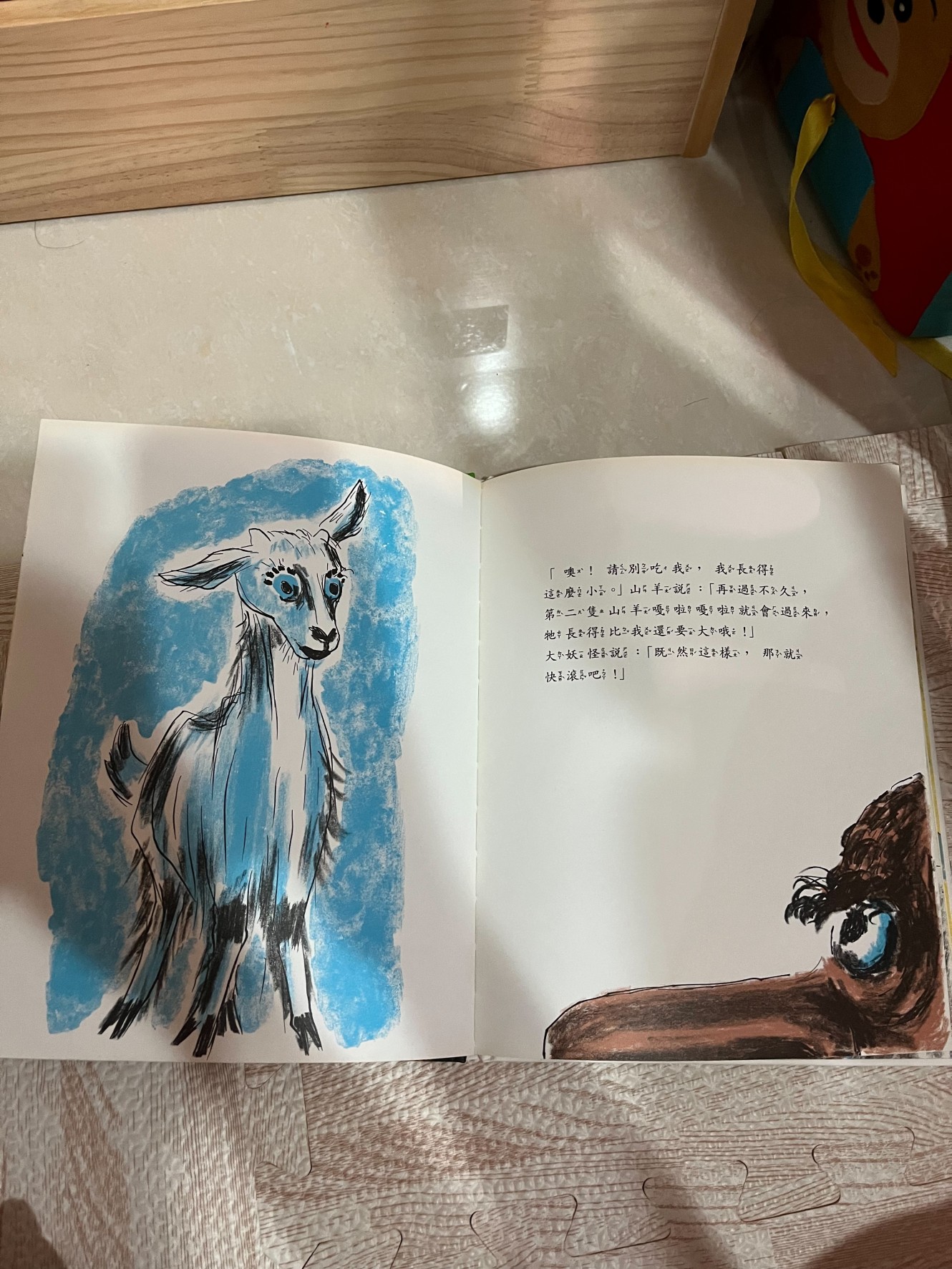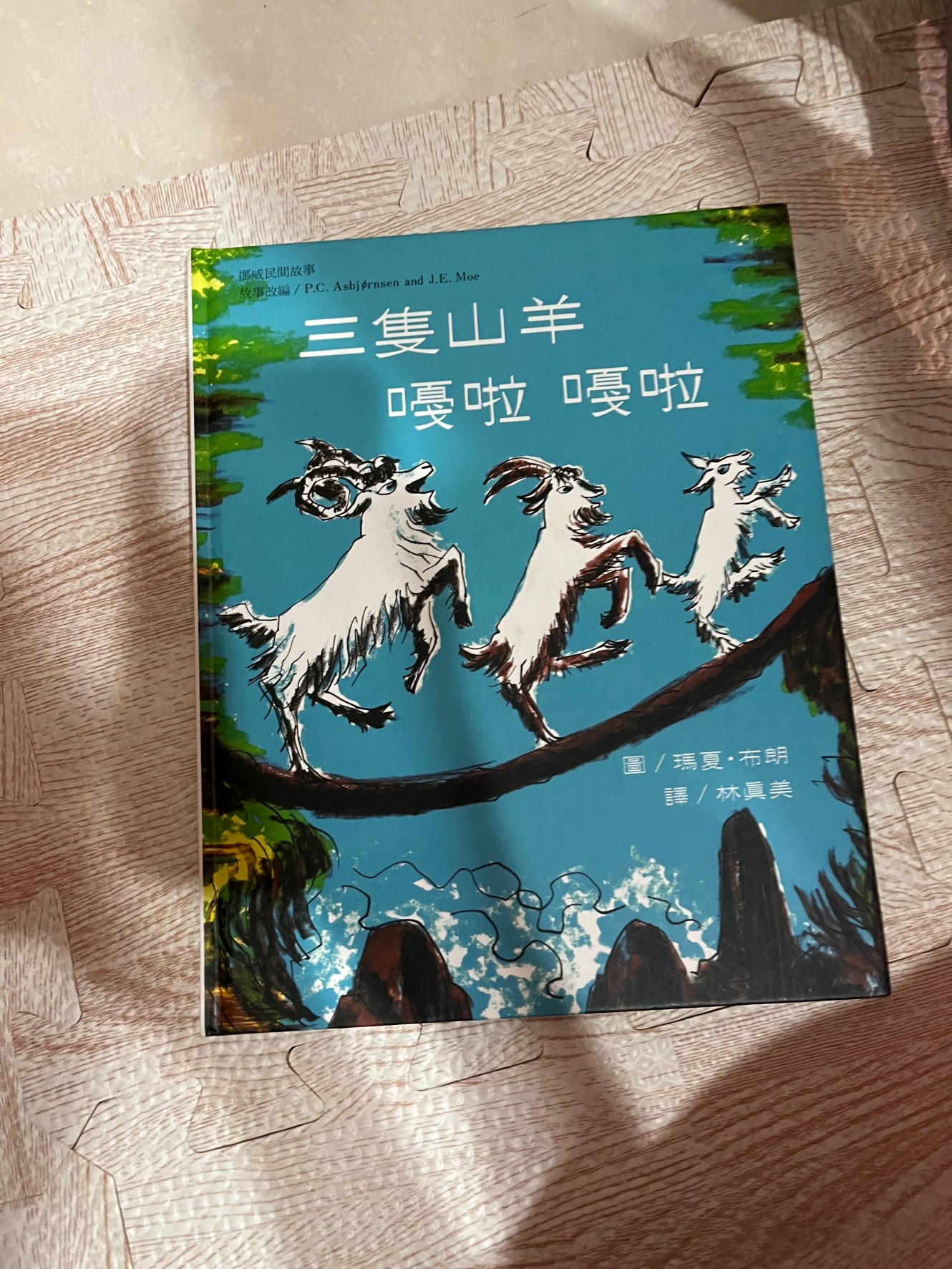 這是挪威口耳相傳的寓言故事,看完之後跟安十有很多問答聊天,問她為什麼第一隻山羊說不要吃我,她說因為我要吃肉很多的。