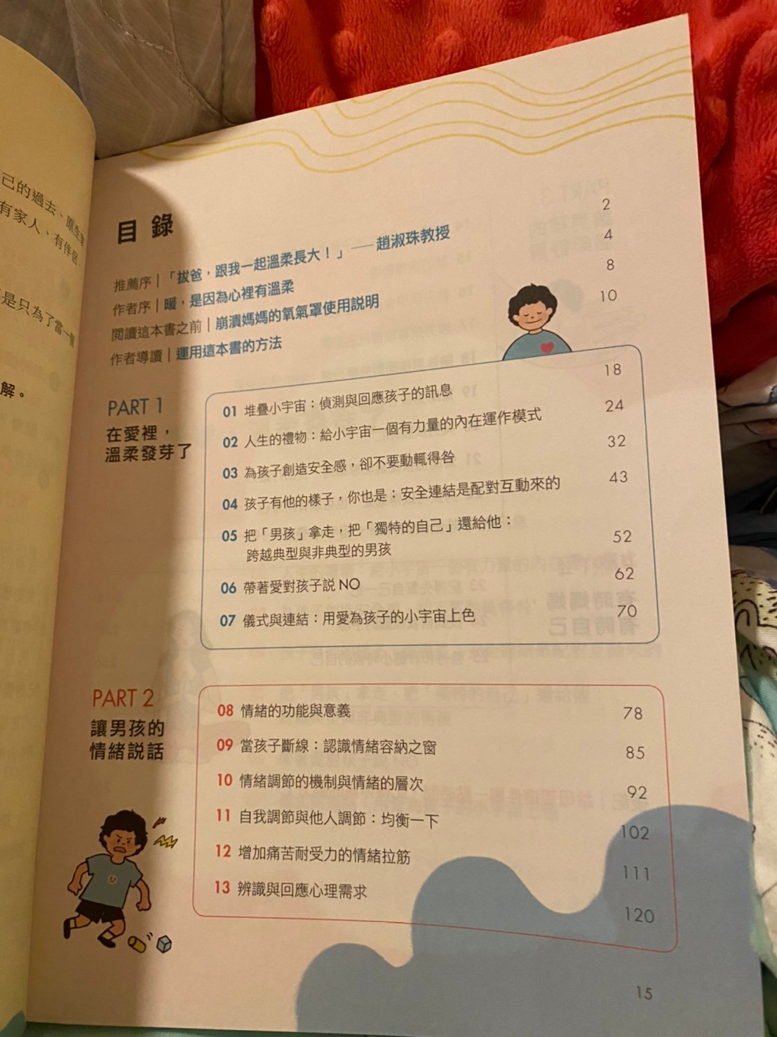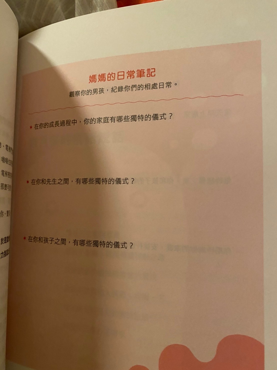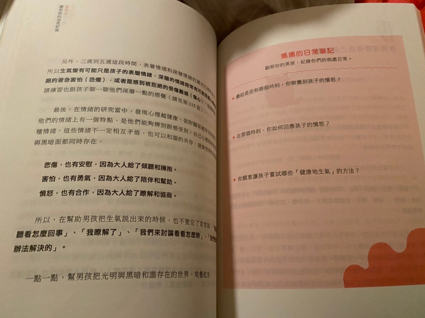 作者是心理師,書中蠻多中肯的建議與實際的作法,作者也提供她自身的經驗來分享如何跟孩子互動(其實我覺得這本書不限於只有兒子),每個章節後面有一個小小的單元:「媽媽的日常筆記」,這個單元會問一些問題,提供讀者思考一下自己的困境或是釐清一些想法。最讓我印象深刻的是:其中有一個小章節叫做「儀式與連結」,他的日常筆記裡,讓我也重新檢視了自己與另一半的生活狀態是否因為這些瑣事所以漸漸忘記了那些讓彼此感動的儀式感?在步入育兒生活的日子裏,我們是否因此忘記了那份喜歡對方、欣賞對方、感謝對方的感覺?