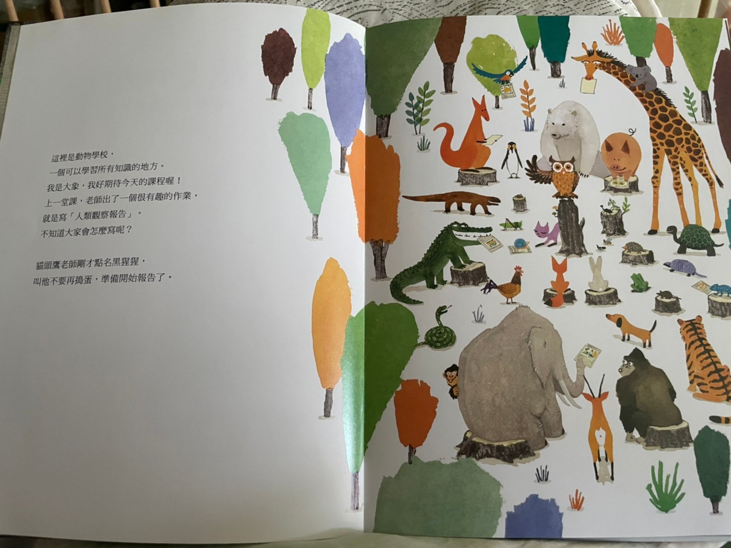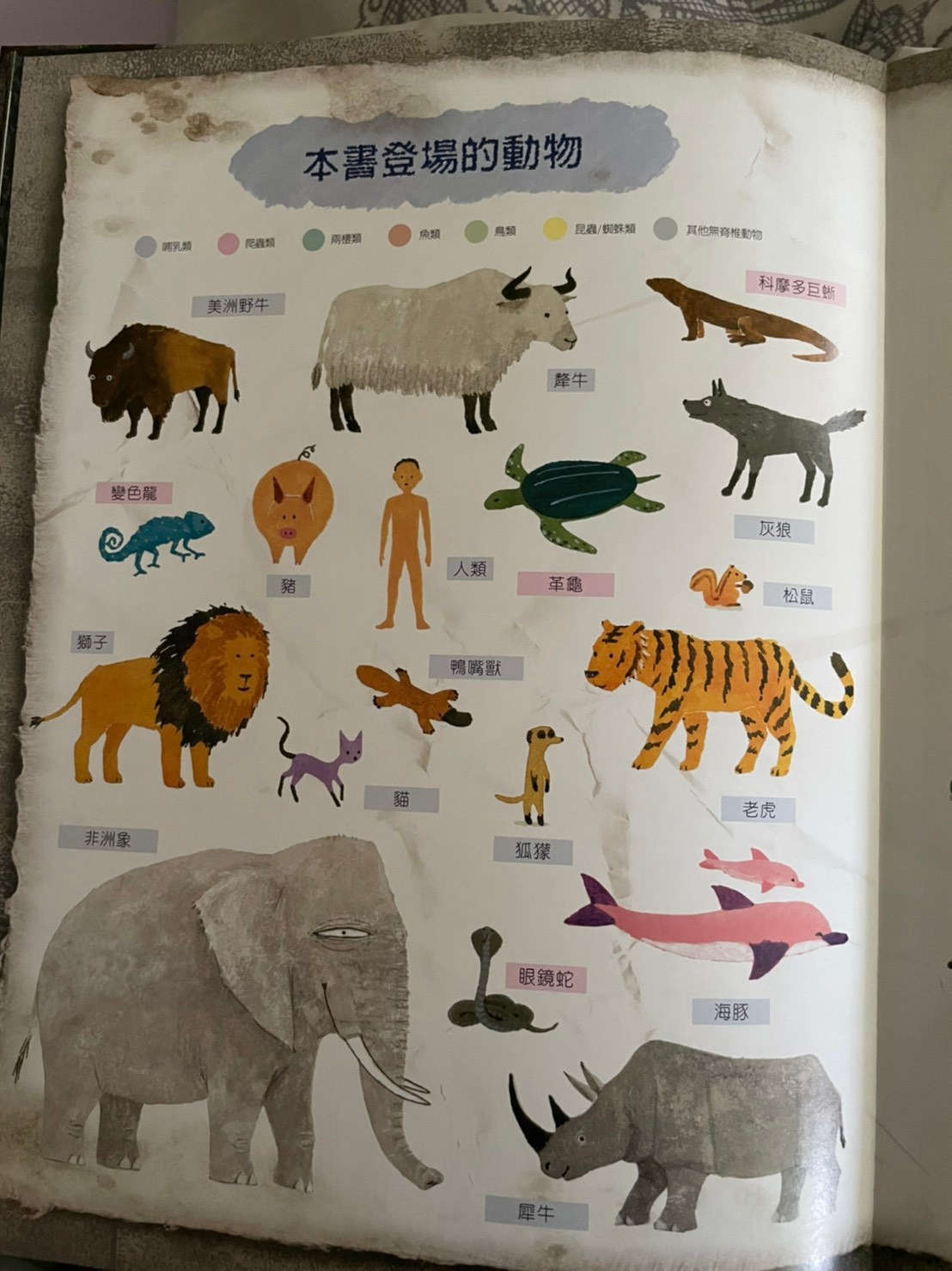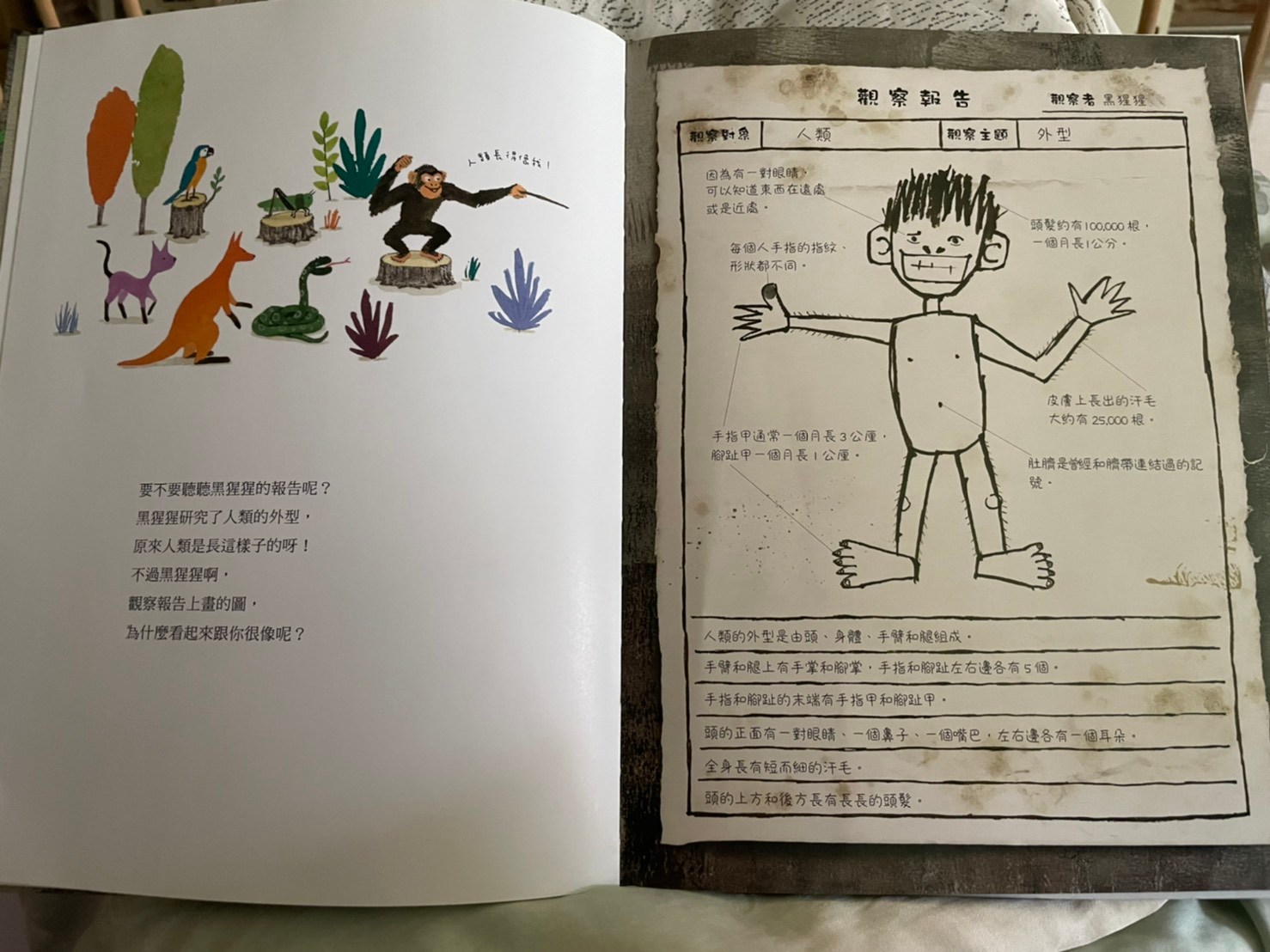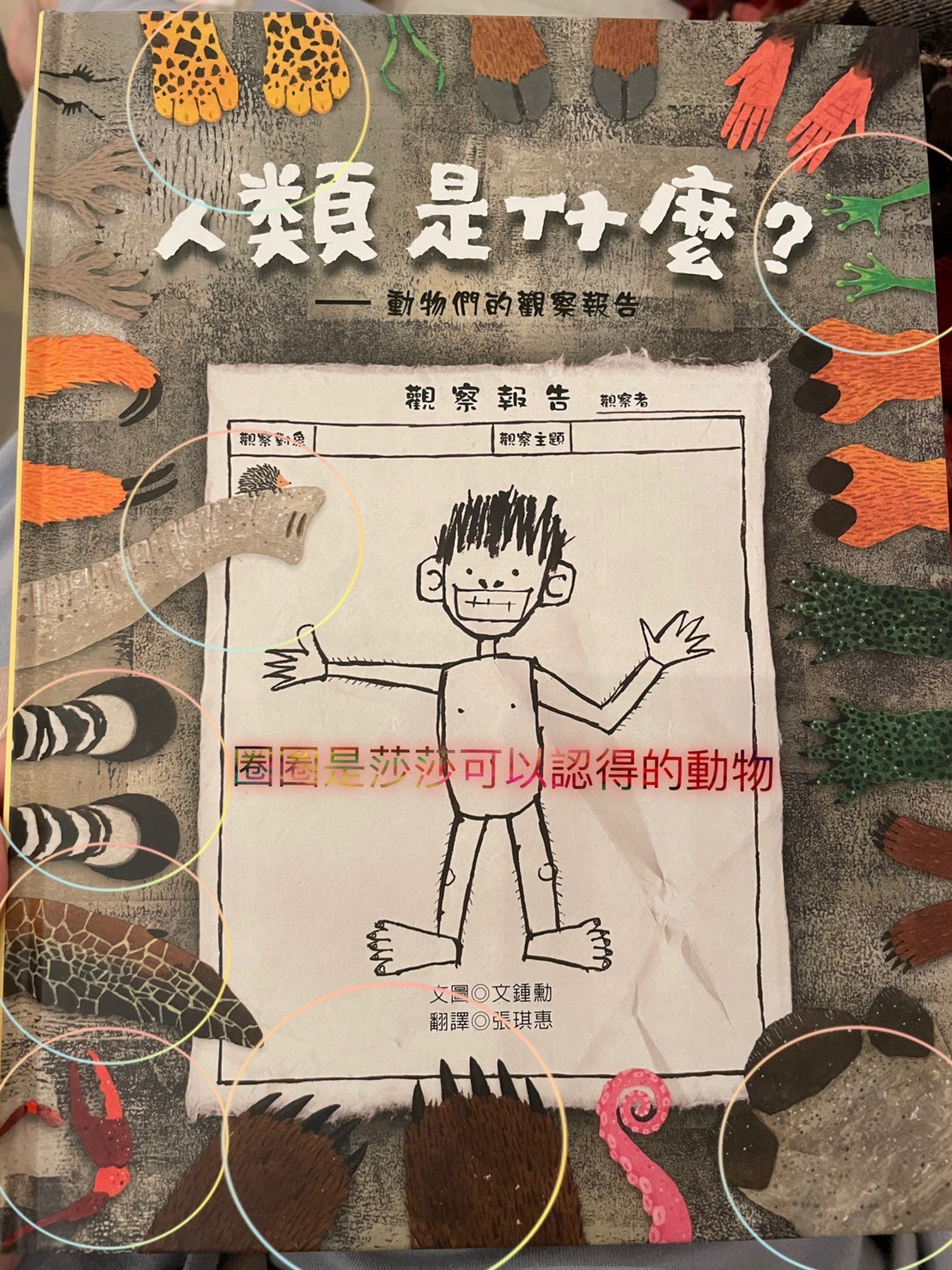 上週鄭豐喜書展中媽媽最喜歡的一本,封面標題就很吸引三類媽媽,書展已經沒剩下幾本,有幾本書況也不好了,畫風十分鮮明活動,莎莎很喜歡艾瑞卡爾風格,所以媽媽直接這本他也會很喜歡,果然有得莎莎青睞,他幾乎可以聽完一整本內容,其實內容偏難,我也不知道她懂多少,但覺得他願意坐在我腳上聽完,媽媽就非常感動了,這本書從封面就可以開始介紹,莎莎這個年紀已經認得大多數特徵明顯的動物,封面出現許多動物的手腳,我就一個個問他這是誰的腳,出乎意料之外他很多都認得,表示平常他都有注意動物的小細節,最讓媽媽壓抑是海龜的腳他也認得喔,封底是各種動物腳印👣,莎莎也認得出幾種喔,剛好最近他們學校春聯是用👣製作,他也會說哪一個是莎莎的腳印。內容是敘述動物學校針對人類的觀察,每個動物介紹不同層面,有的是外觀,骨骼,膚色,飲食喜好,生殖方式,居住方式….等等!其中講到女生的時候,他會說男生是爸爸女生是媽媽,我問他說那莎莎呢!他竟然指著女生的肚子,不知道是真的知道他曾經住在媽媽肚子還是不小心指到😅非常的詳細和有趣,媽媽也從裡面學到一些小知識,比如信天翁,海豚只用半邊腦睡覺,所以可以邊飛行(游泳)邊睡覺。最後也提到人類出現的這段期間也傷害了地球,但人類也努力在幫助地球,是一本兼具知識與教育性質的好繪本,分享給大家。也覺得跟孩子共讀真的不用受限內容,雖然內容沒那麼簡單,但不同年齡層可以學習到不同層面喔(這絕對不是媽媽想亂買各種書的藉口)