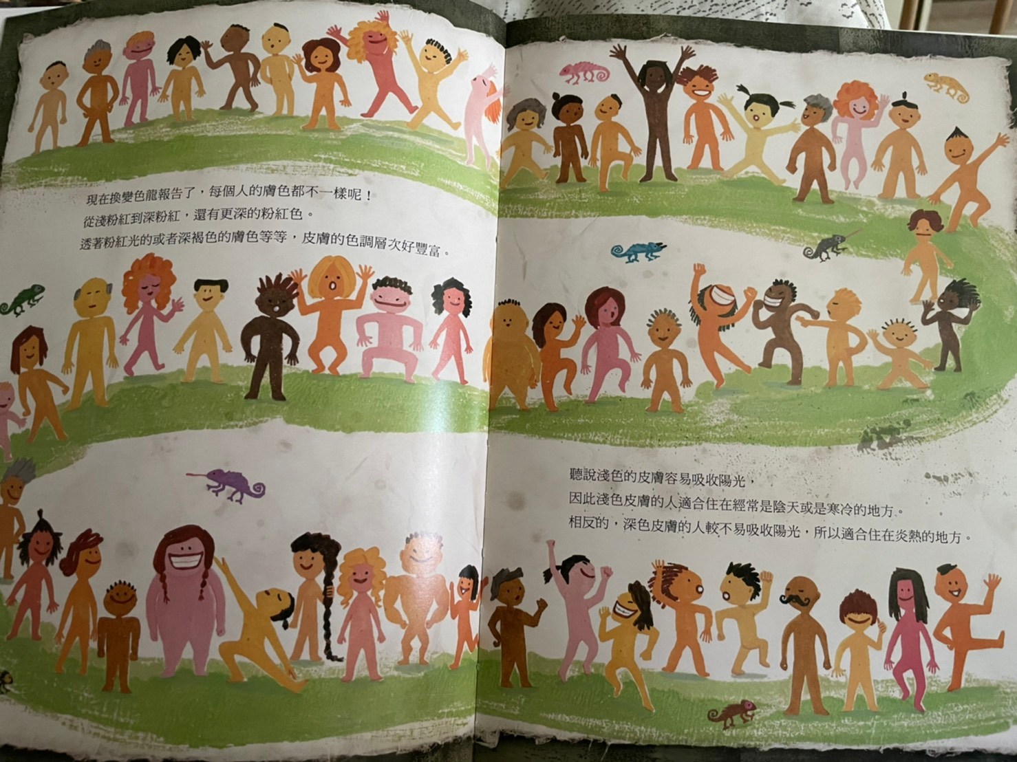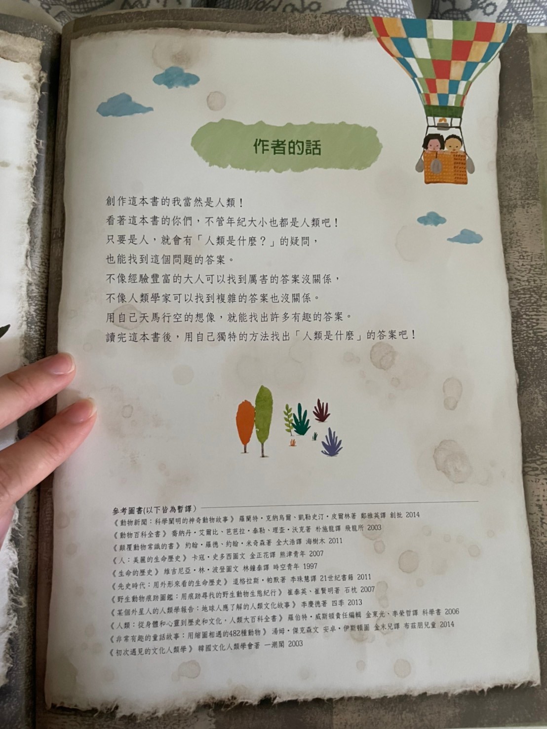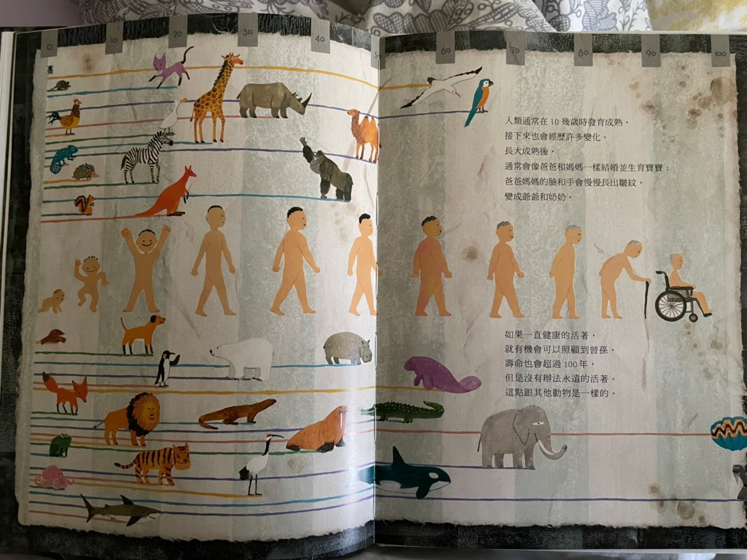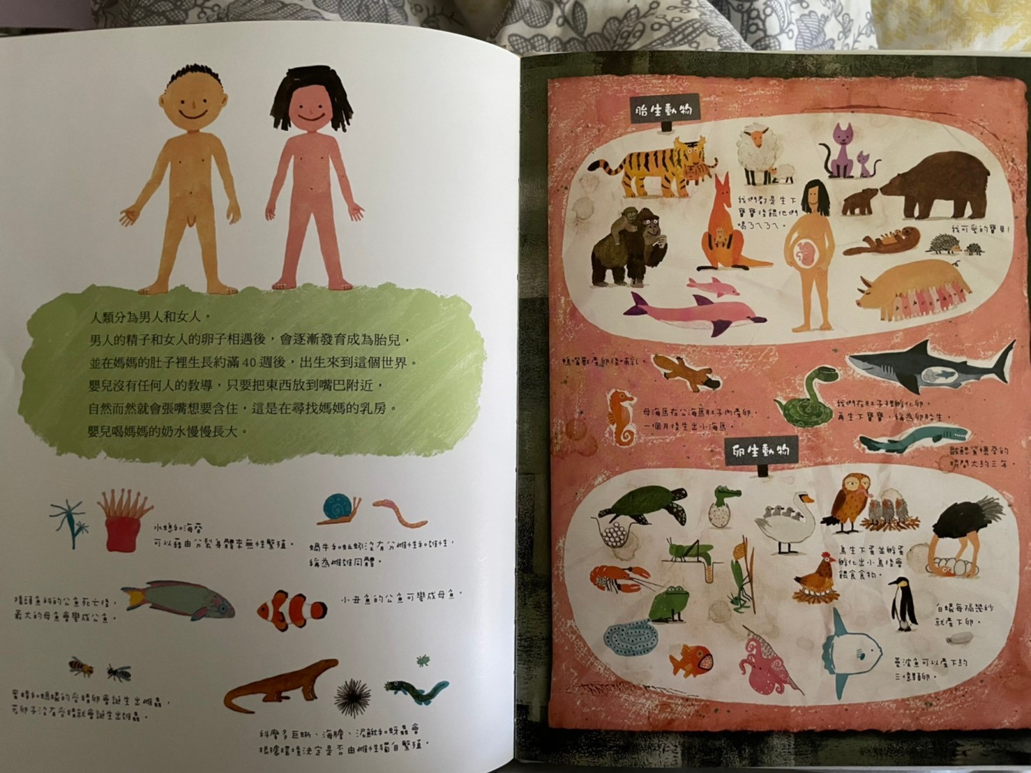上週鄭豐喜書展中媽媽最喜歡的一本,封面標題就很吸引三類媽媽,書展已經沒剩下幾本,有幾本書況也不好了,畫風十分鮮明活動,莎莎很喜歡艾瑞卡爾風格,所以媽媽直接這本他也會很喜歡,果然有得莎莎青睞,他幾乎可以聽完一整本內容,其實內容偏難,我也不知道她懂多少,但覺得他願意坐在我腳上聽完,媽媽就非常感動了,這本書從封面就可以開始介紹,莎莎這個年紀已經認得大多數特徵明顯的動物,封面出現許多動物的手腳,我就一個個問他這是誰的腳,出乎意料之外他很多都認得,表示平常他都有注意動物的小細節,最讓媽媽壓抑是海龜的腳他也認得喔,封底是各種動物腳印👣,莎莎也認得出幾種喔,剛好最近他們學校春聯是用👣製作,他也會說哪一個是莎莎的腳印。內容是敘述動物學校針對人類的觀察,每個動物介紹不同層面,有的是外觀,骨骼,膚色,飲食喜好,生殖方式,居住方式….等等!其中講到女生的時候,他會說男生是爸爸女生是媽媽,我問他說那莎莎呢!他竟然指著女生的肚子,不知道是真的知道他曾經住在媽媽肚子還是不小心指到😅非常的詳細和有趣,媽媽也從裡面學到一些小知識,比如信天翁,海豚只用半邊腦睡覺,所以可以邊飛行(游泳)邊睡覺。最後也提到人類出現的這段期間也傷害了地球,但人類也努力在幫助地球,是一本兼具知識與教育性質的好繪本,分享給大家。也覺得跟孩子共讀真的不用受限內容,雖然內容沒那麼簡單,但不同年齡層可以學習到不同層面喔(這絕對不是媽媽想亂買各種書的藉口)