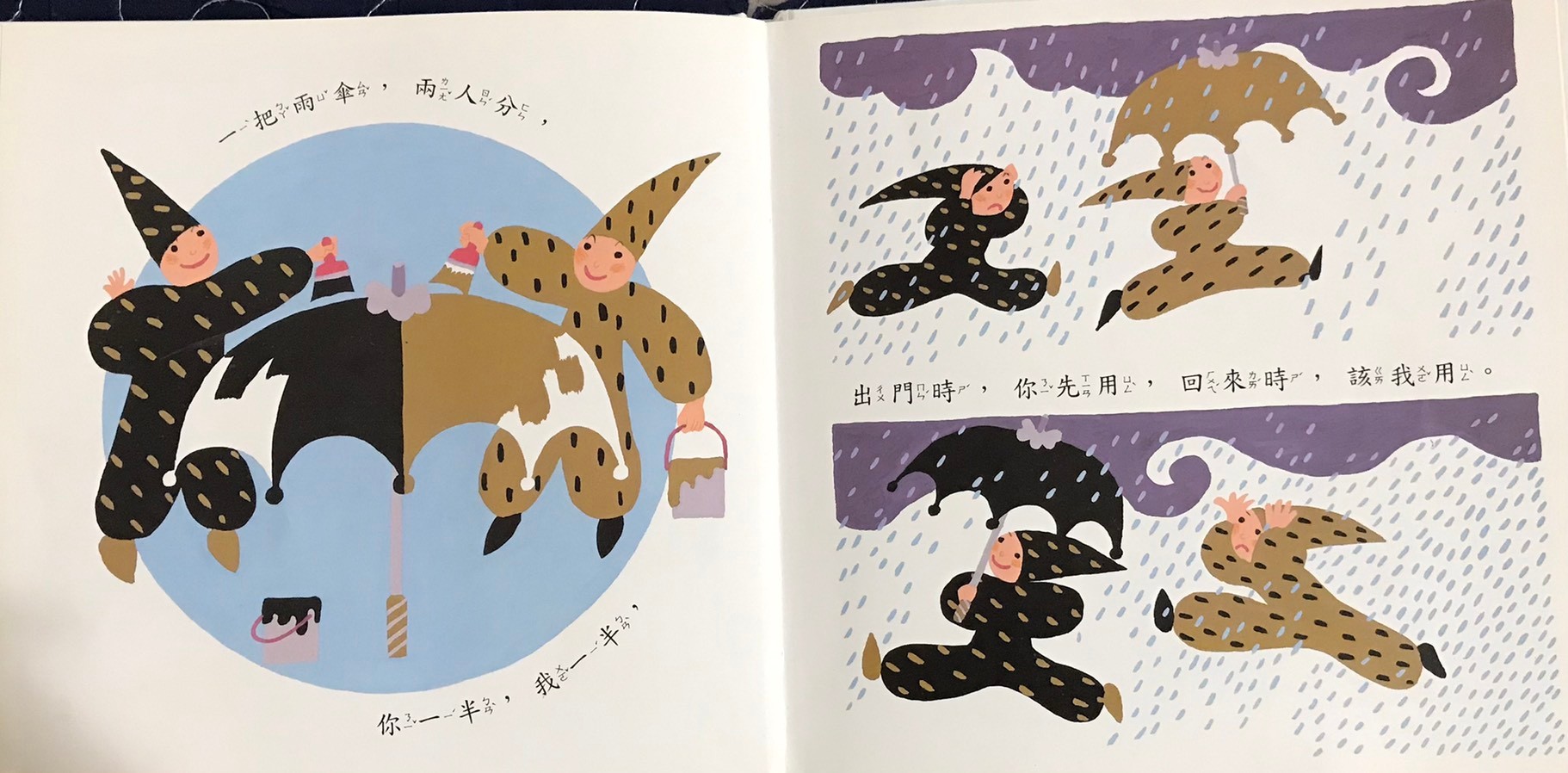 這本書當初只有大寶一個人的時候還沒有這麼大感受,有了二寶加入「戰局」之後,繪本裡分享各種東西的方式,在兩寶吵架爭奪玩具/書本/媽媽的時候,都能適時的發揮作用。
