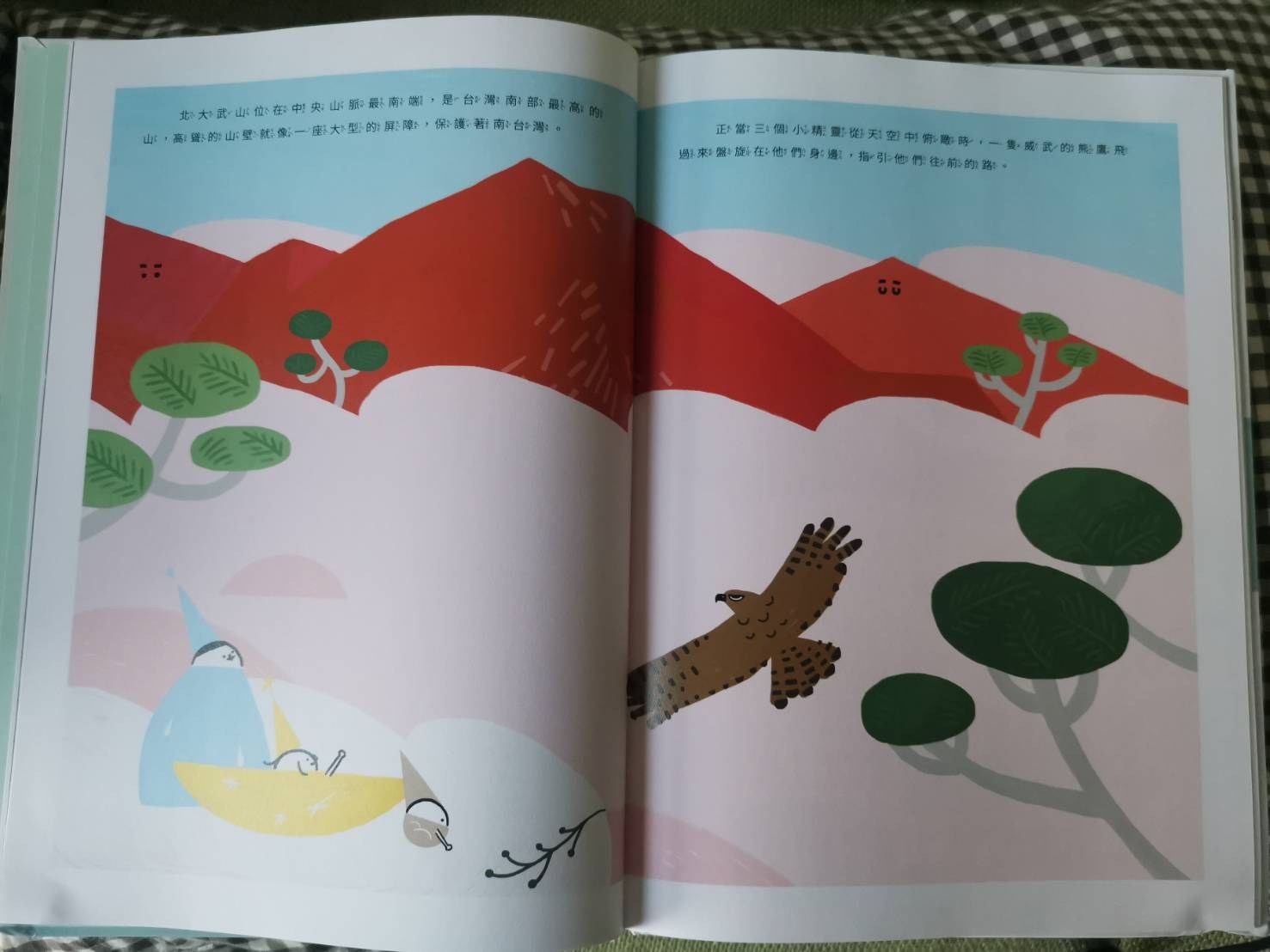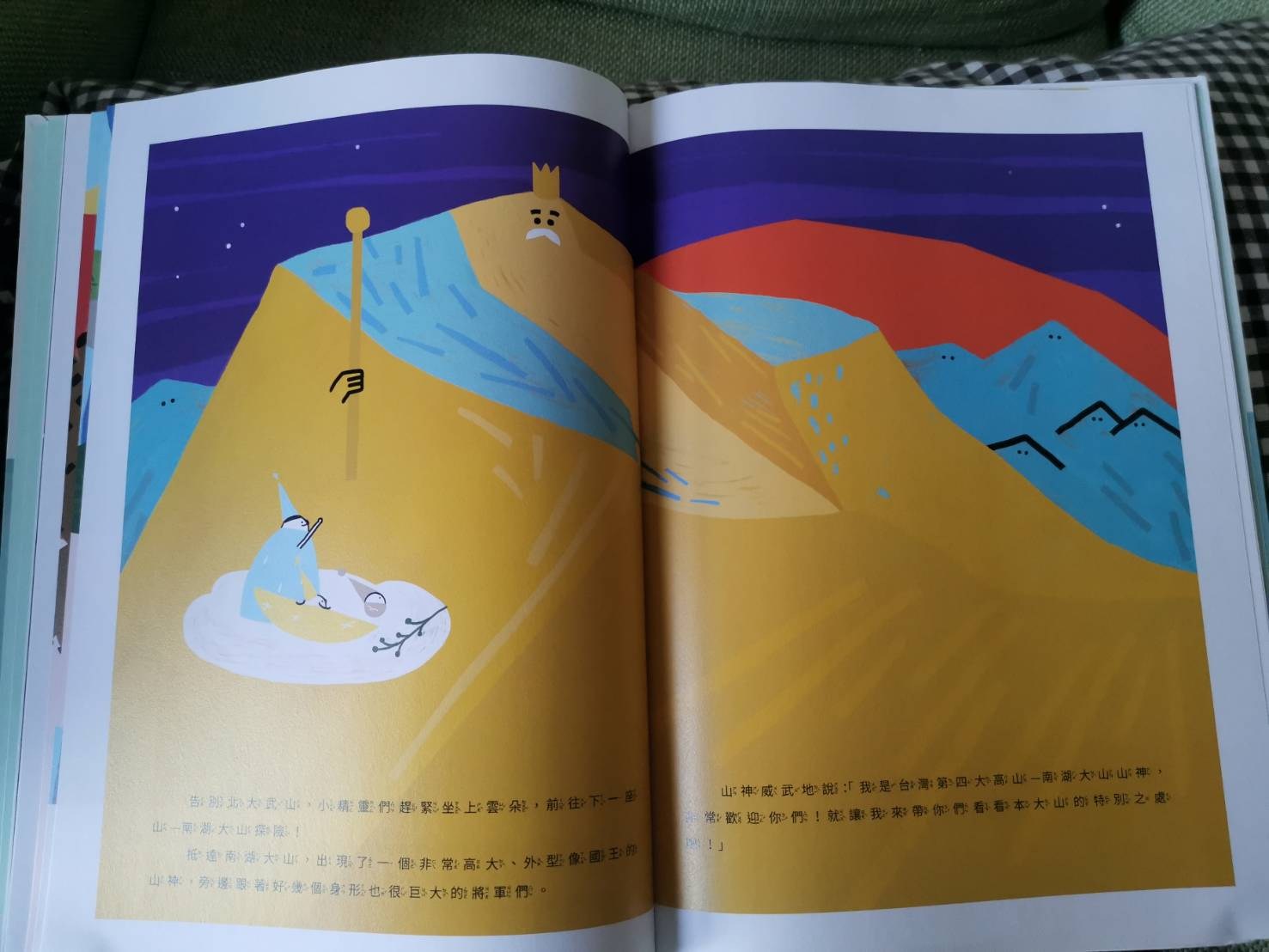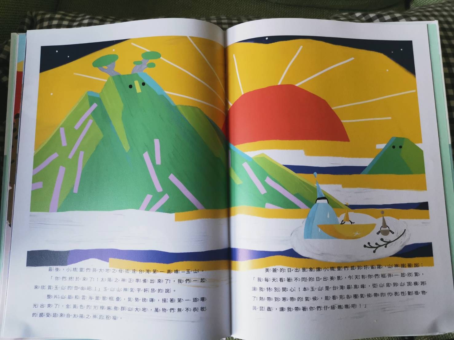 作者把台灣五大山分別用五種亮麗的顏色表現,像玉山就是綠色.雪山就是白色,擬人化的方式讓寶寶理解,不然以呆門這個年紀,把山頭的照片給他看,他只會告訴你:「樹!樹!」