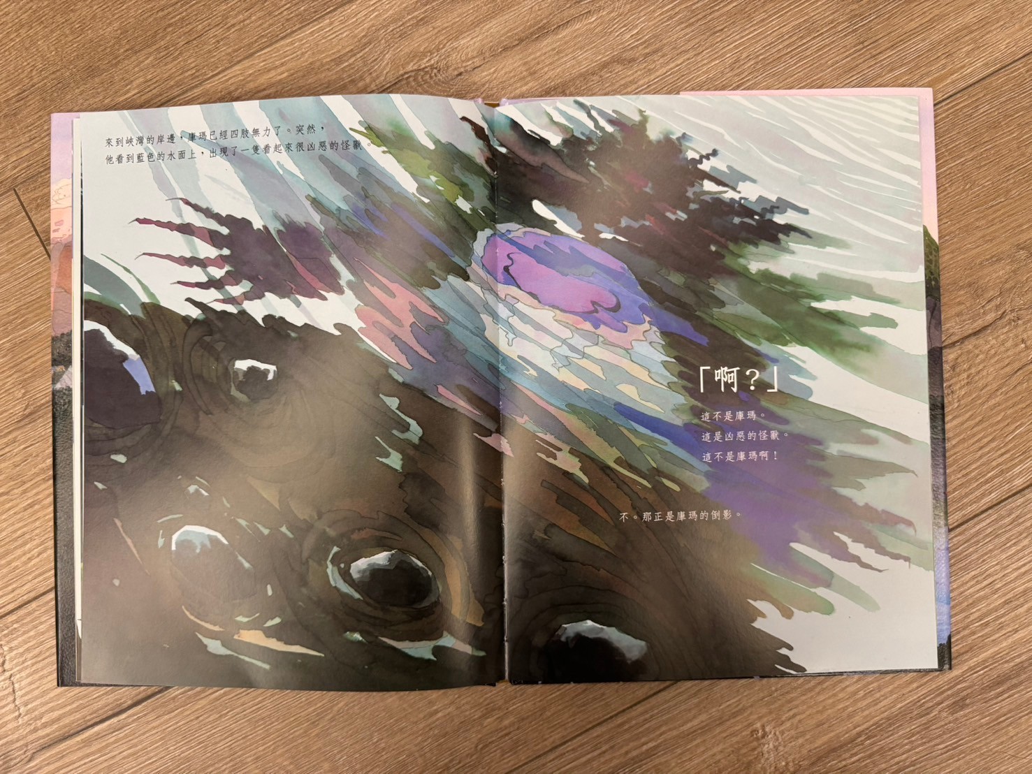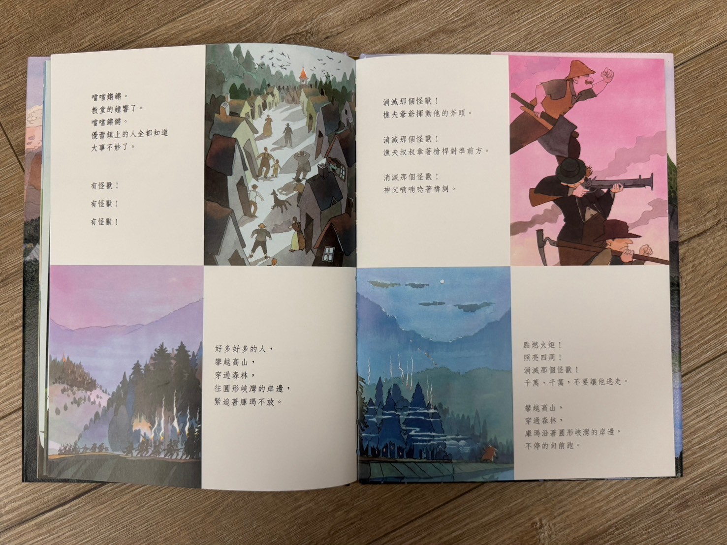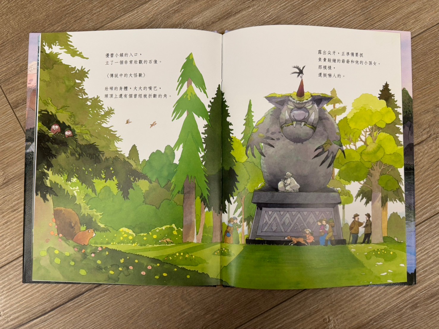 這本書的畫風真的很美!讓我想到了之前去的哈修塔特,湖景倒影的山色特別魔幻,搭配這個故事,與孩子們共讀後其實我的第一個感受有點小小沈重,(保護村莊的好怪獸被人類以為是壞怪獸而最後沉沒於湖中,人類甚至有點沾沾自喜,真相永遠沒有人知道)其實故事的涵義很深沉,用想像力的故事來對照真實發生的世界,會有一種獨有的悲涼。