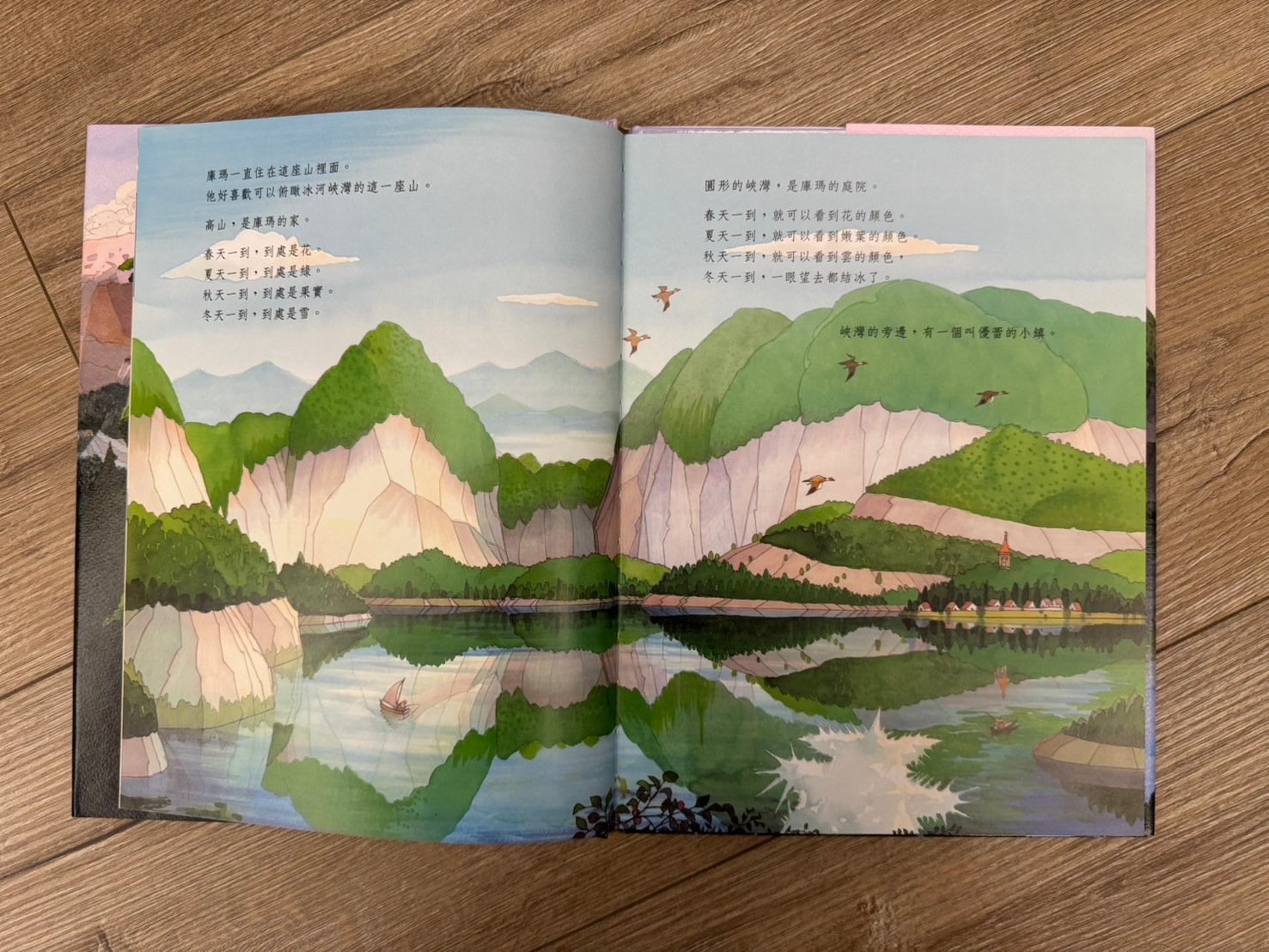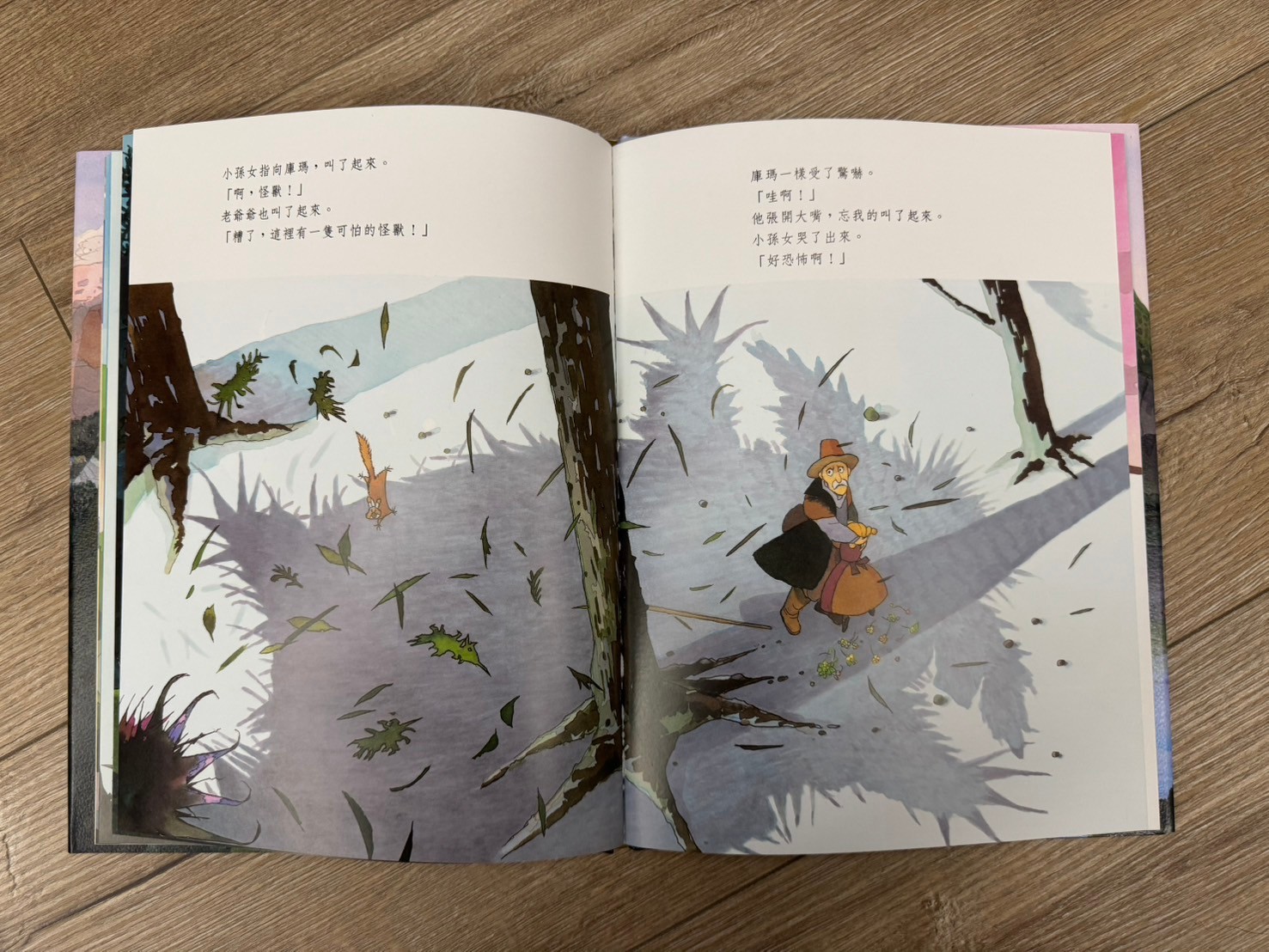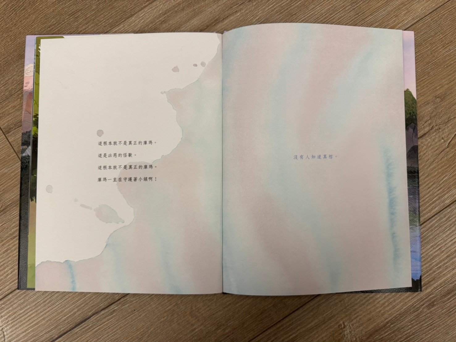 這本書的畫風真的很美!讓我想到了之前去的哈修塔特,湖景倒影的山色特別魔幻,搭配這個故事,與孩子們共讀後其實我的第一個感受有點小小沈重,(保護村莊的好怪獸被人類以為是壞怪獸而最後沉沒於湖中,人類甚至有點沾沾自喜,真相永遠沒有人知道)其實故事的涵義很深沉,用想像力的故事來對照真實發生的世界,會有一種獨有的悲涼。