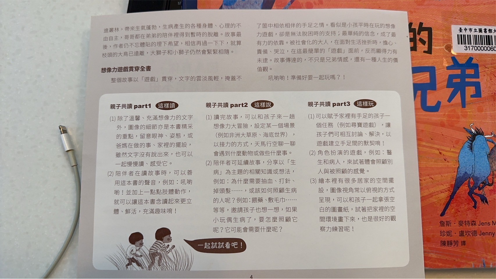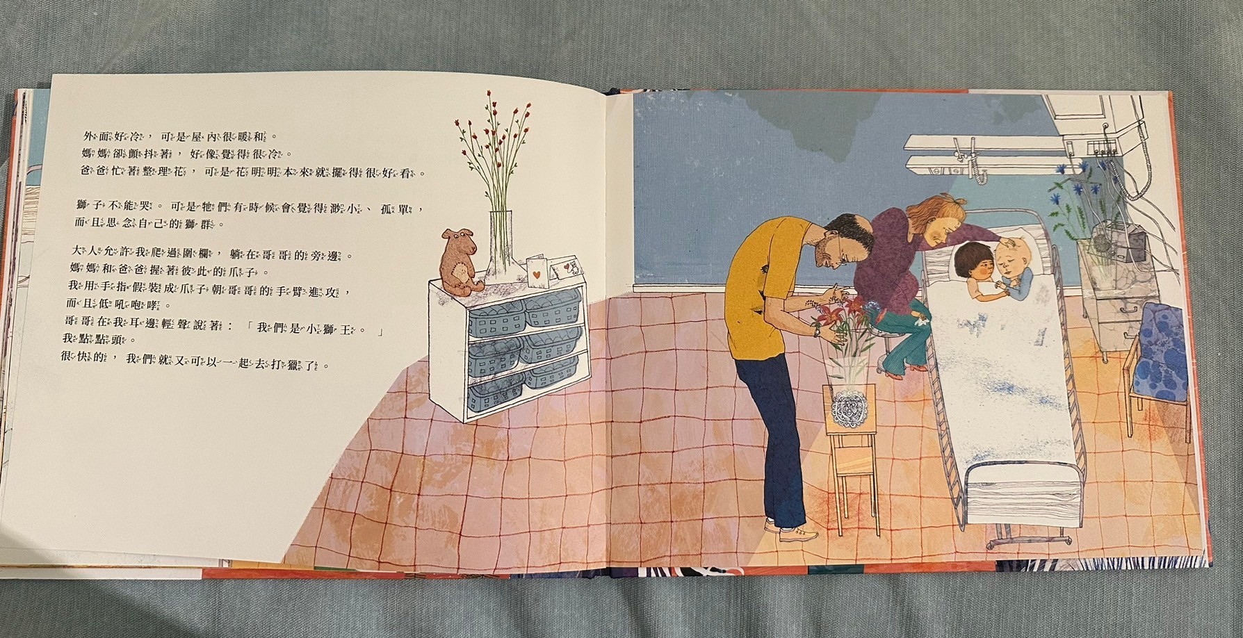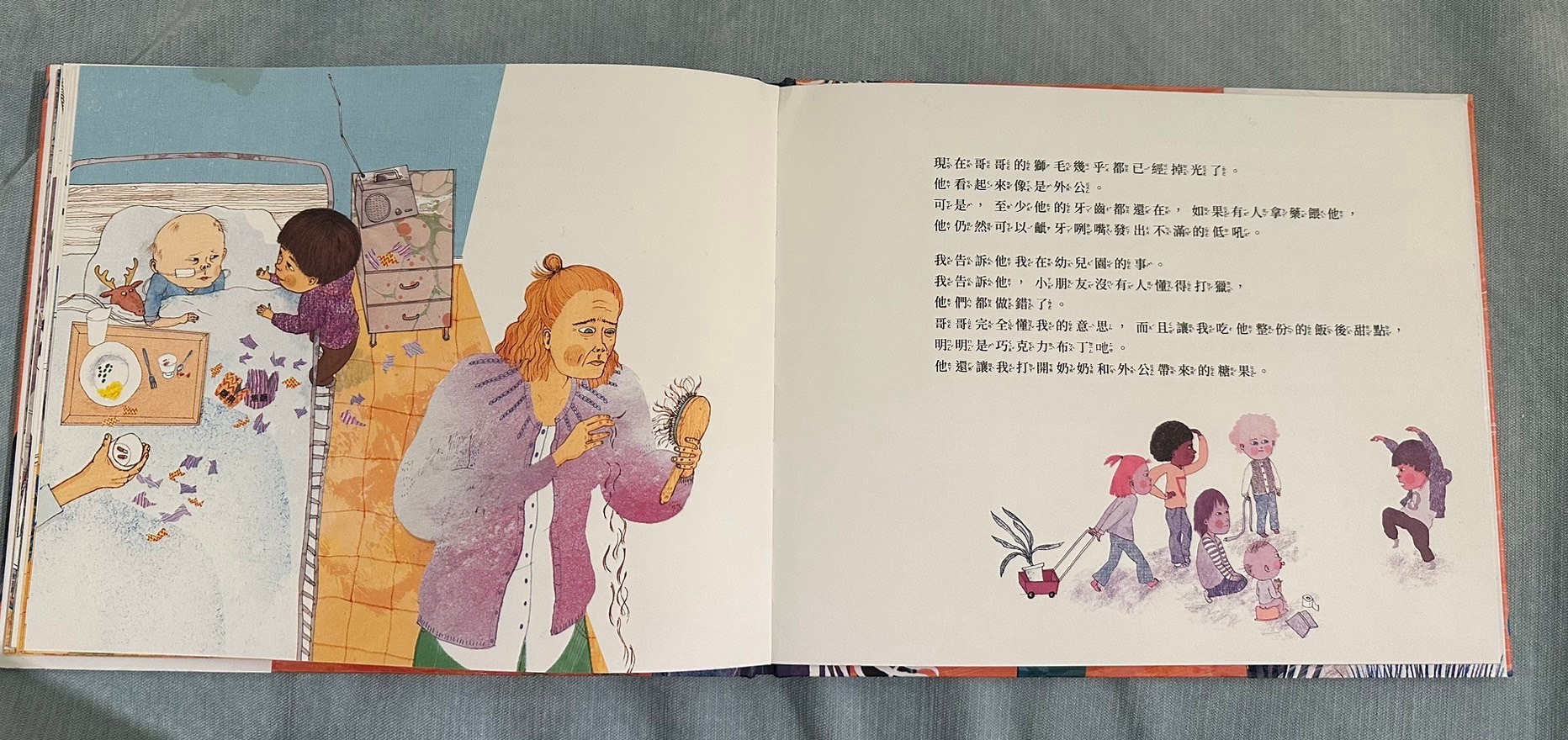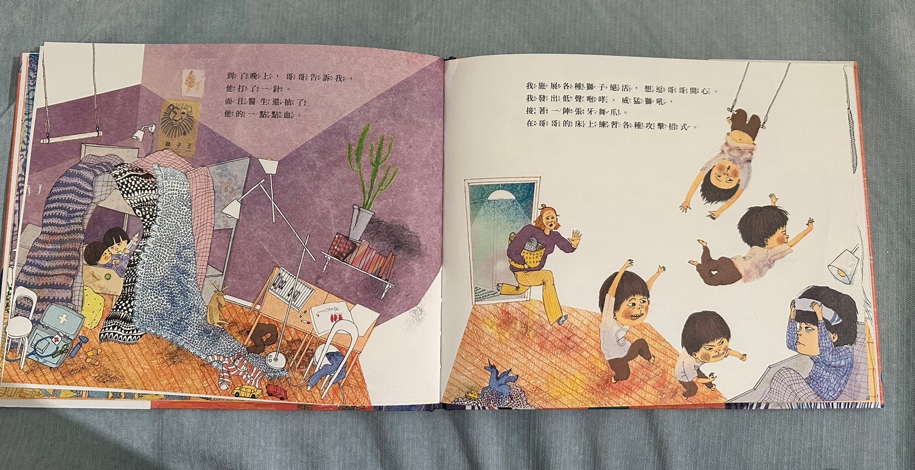 回到書的本身,覺得這本書用了孩子觀點看哥哥生病這件事情,讓遊戲貫穿整本書,沒有過多敘述生病狀況,但書中的呈現也讓孩子很清楚書中獅子哥哥因為生病沒有辦法在到處奔跑,弟弟帶著哥哥想重溫當獅子的感覺,看得出來兩兄弟深厚的友誼,我好喜歡最後一面兩隻獅子並肩奔跑的畫面,莎莎問我為什麼他們變成獅子,我告訴他說「或許在他們的夢中,他們真的就變成兩隻小獅子一起奔跑喔」在夢裡沒有病痛了,所以哥哥不需要身上帶著好多管線,餓可以自由自在了