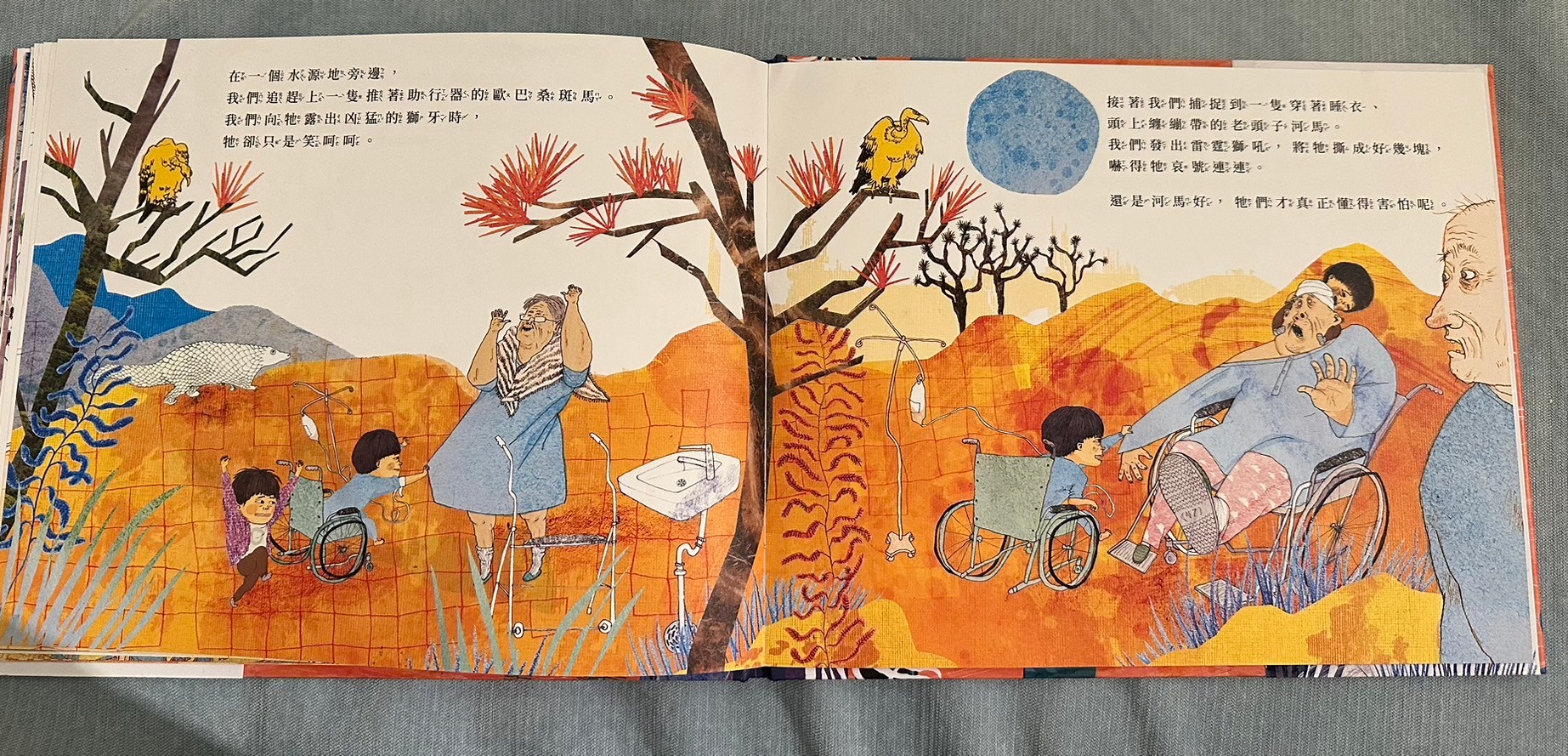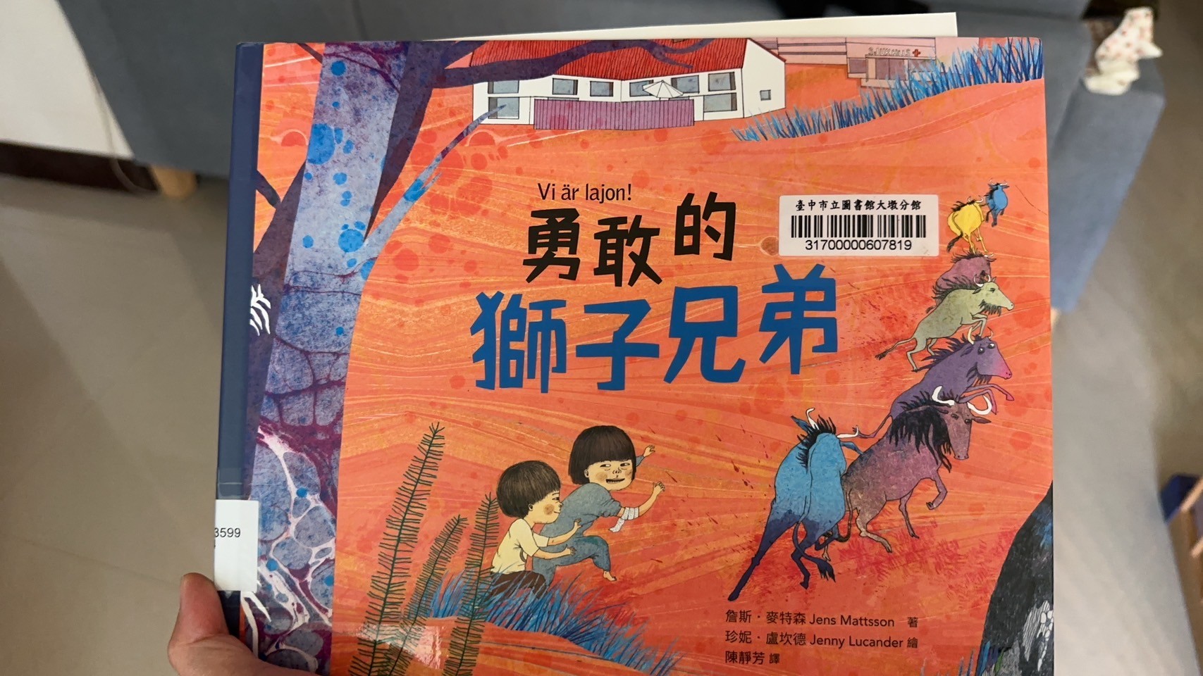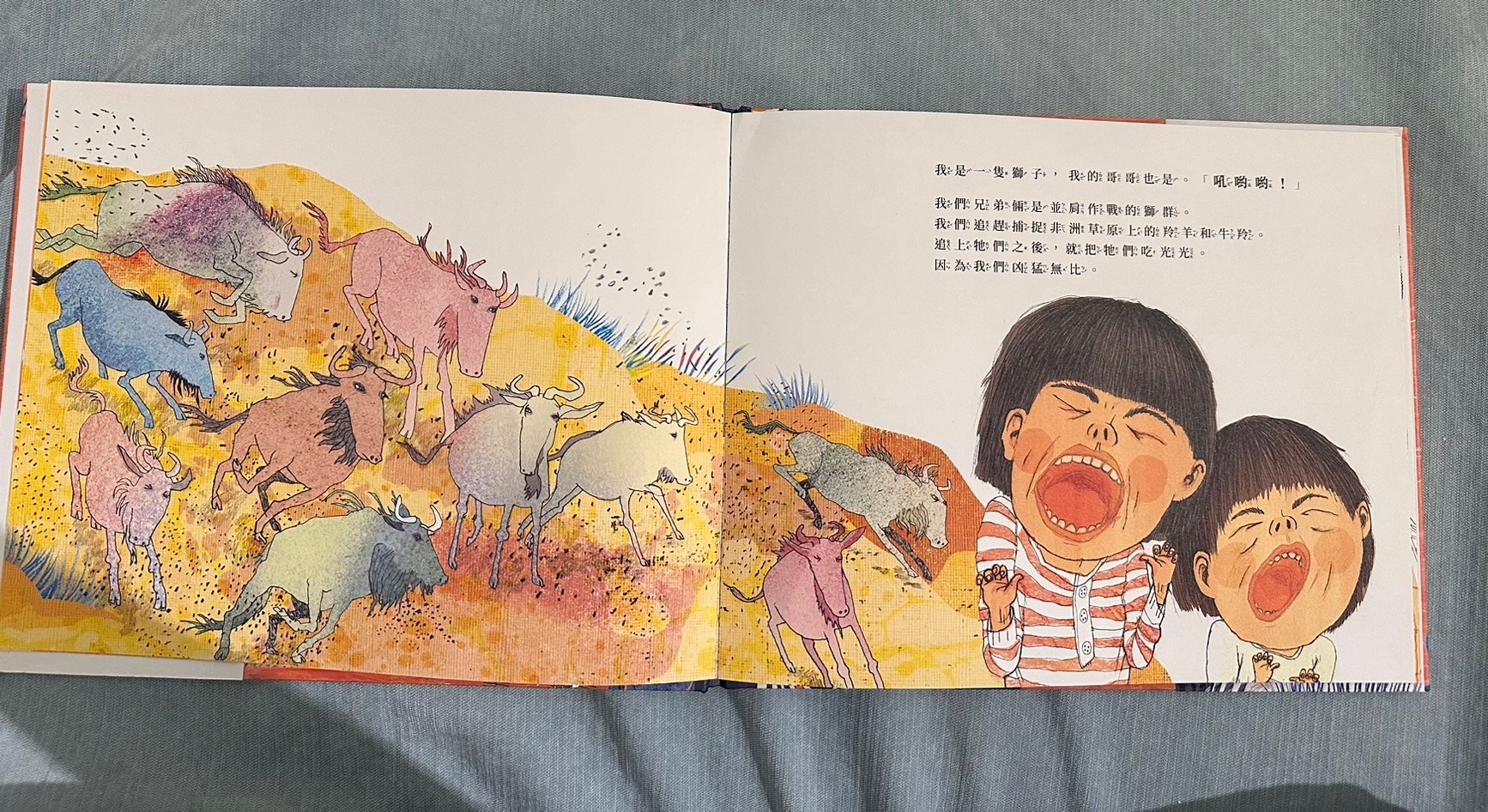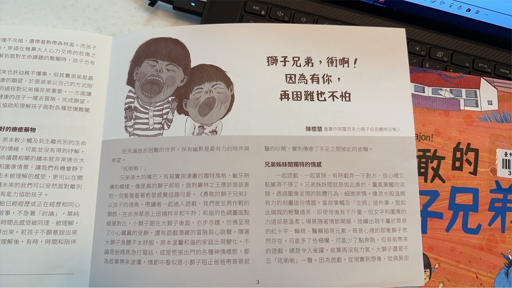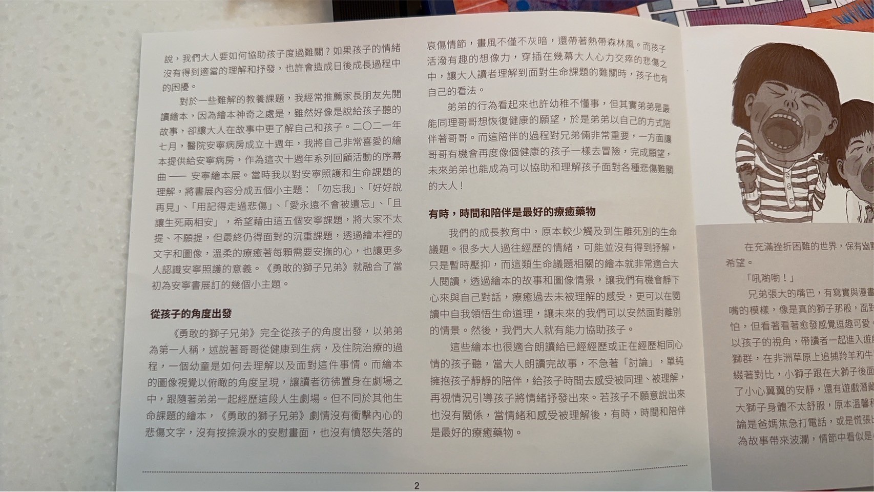 回到書的本身,覺得這本書用了孩子觀點看哥哥生病這件事情,讓遊戲貫穿整本書,沒有過多敘述生病狀況,但書中的呈現也讓孩子很清楚書中獅子哥哥因為生病沒有辦法在到處奔跑,弟弟帶著哥哥想重溫當獅子的感覺,看得出來兩兄弟深厚的友誼,我好喜歡最後一面兩隻獅子並肩奔跑的畫面,莎莎問我為什麼他們變成獅子,我告訴他說「或許在他們的夢中,他們真的就變成兩隻小獅子一起奔跑喔」在夢裡沒有病痛了,所以哥哥不需要身上帶著好多管線,餓可以自由自在了