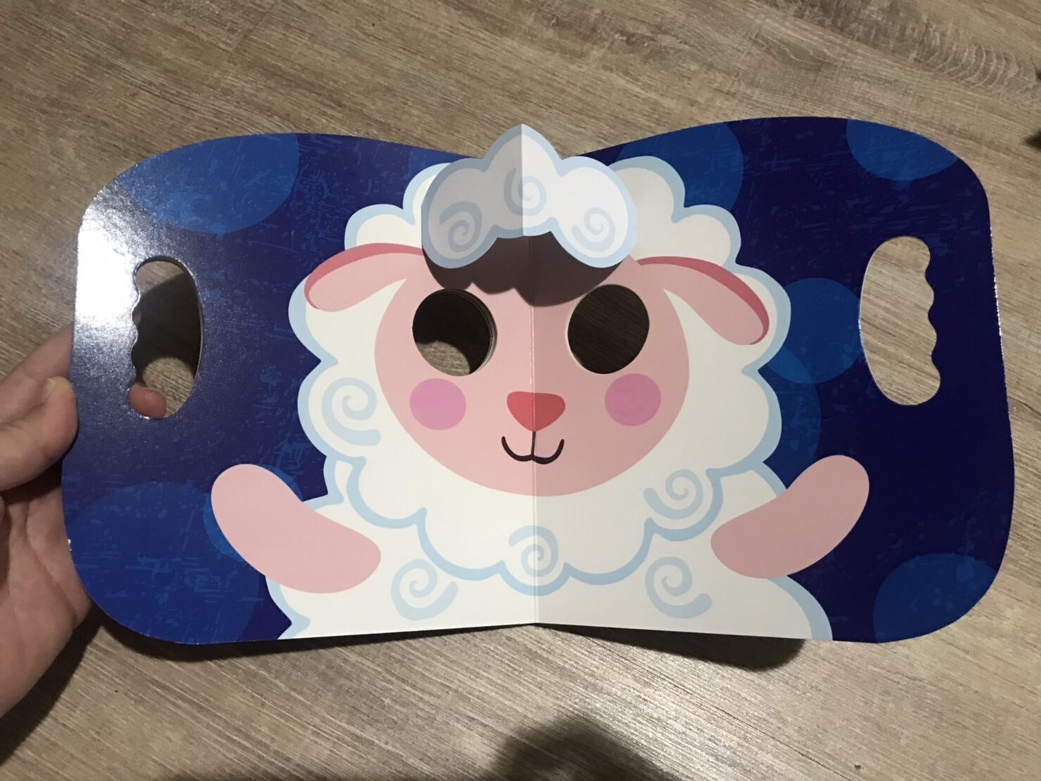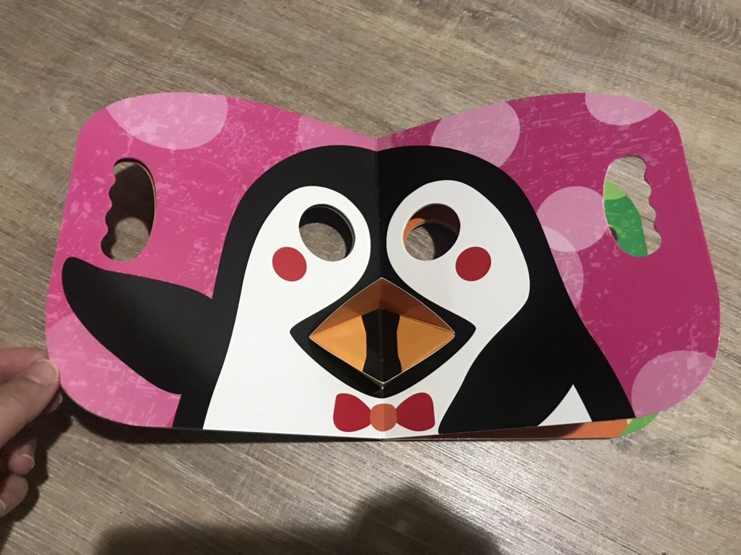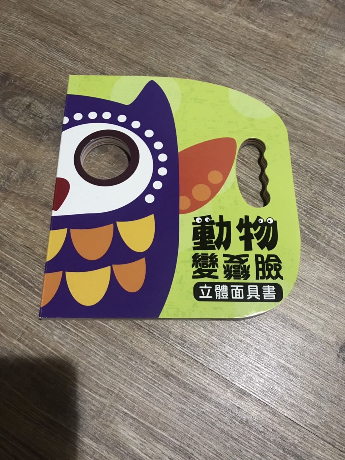 這本書是孕期逛書展購入,書內共有河馬、狐狸、綿羊、企鵝這四種立體動物,每一頁的色彩都不同,畫風簡單顏色鮮豔可以刺激寶寶視力,在眼睛處挖洞讓使用者拿著書扮演立體動物,旁邊設計挖洞把手方便拿著書互動,當時看到這書就想說買來跟寶寶互動應該很好玩,馬上結帳帶走!