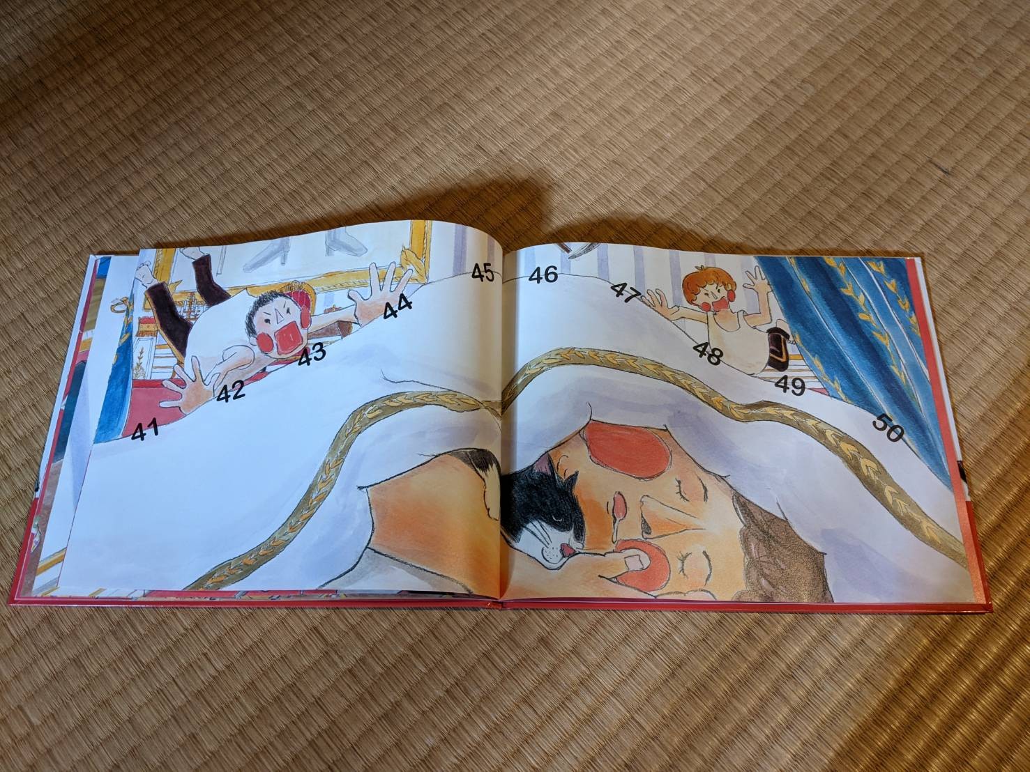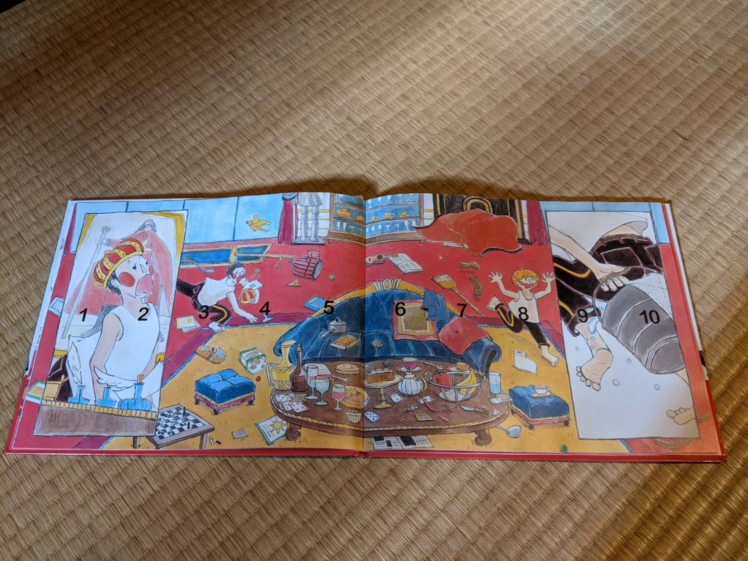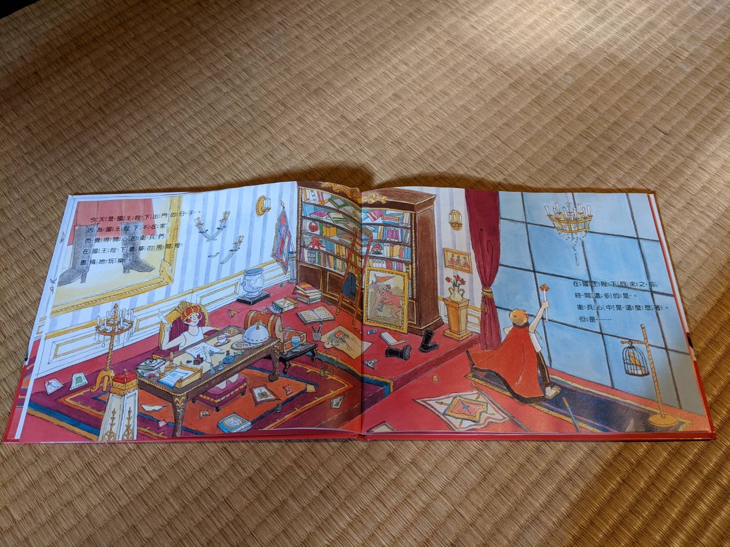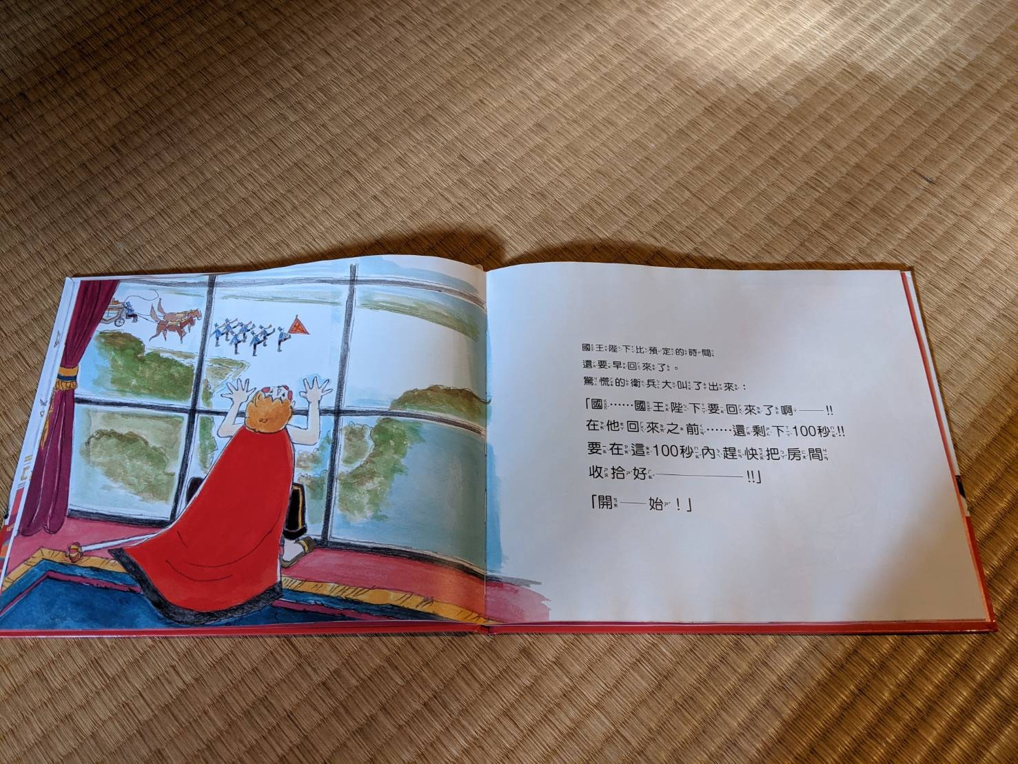 雖然她還無法參透國王快回來的緊張感(是因為爸媽都沒罵過她嗎),但是她現在會自己手指著幾個數字念(最會7和8了),她可能也覺得自己會講故事了,看起來很有成就感。