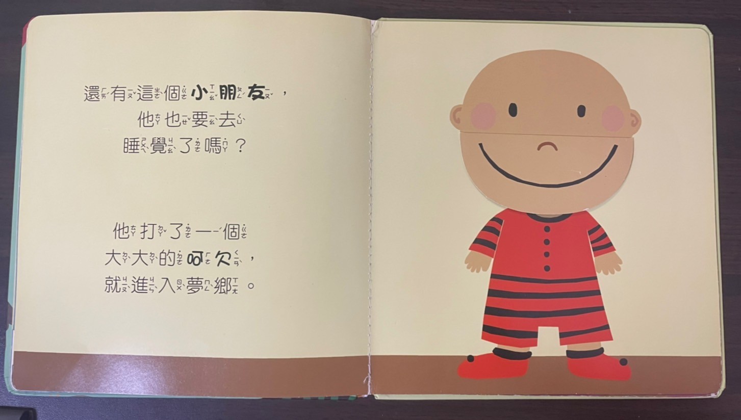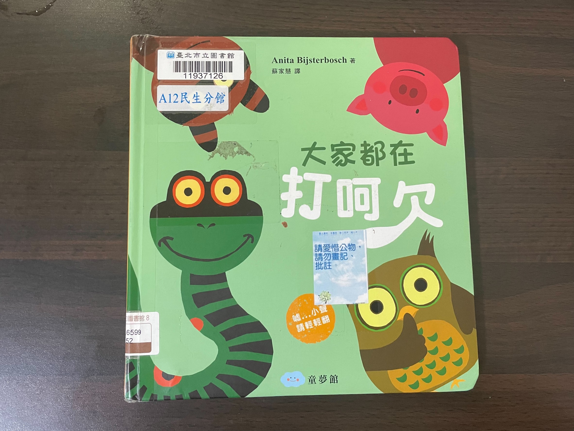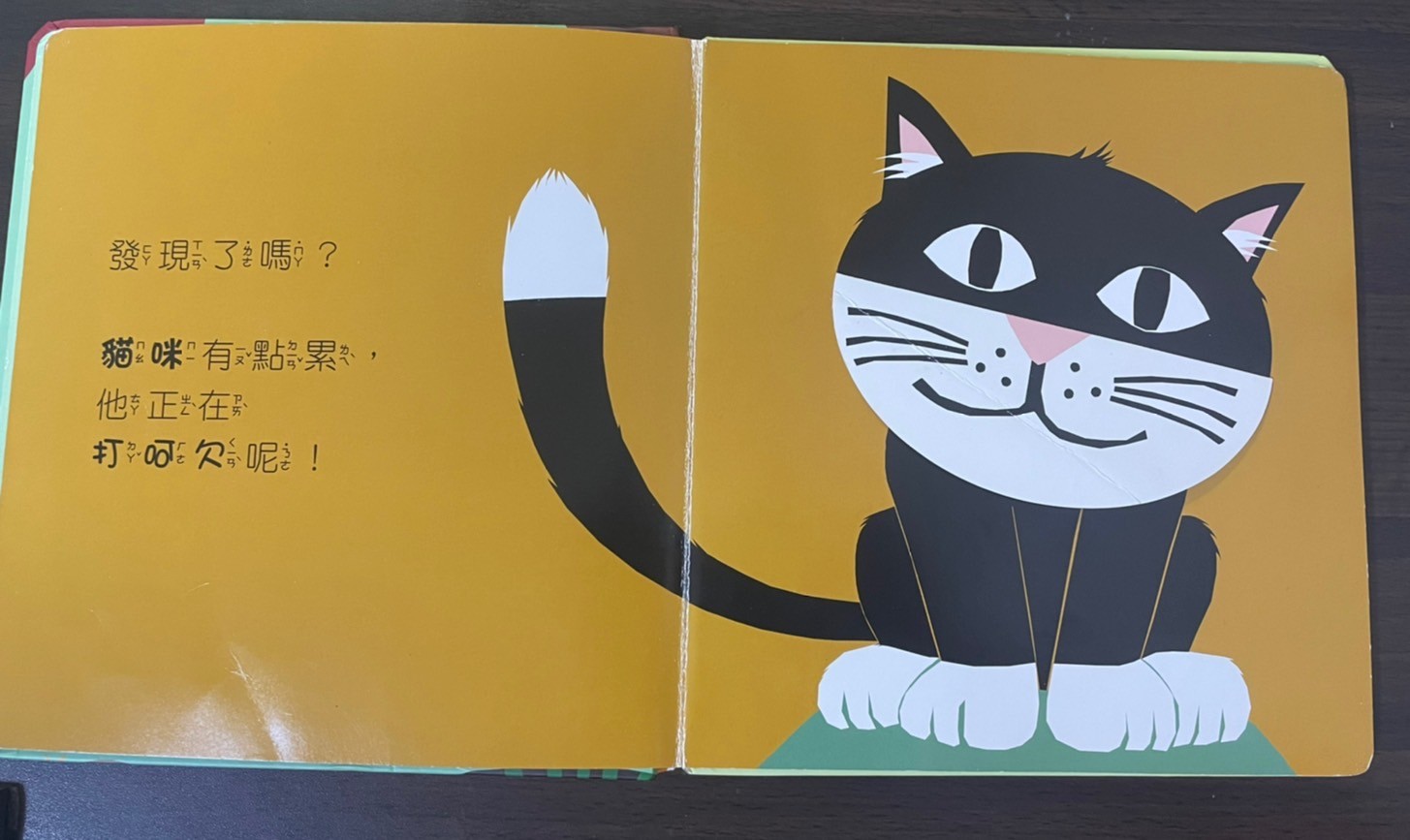 心得:這本是翻翻書,內容就是各種動物在打呵欠、小翻頁就是翻開動物們的嘴巴打呵欠,