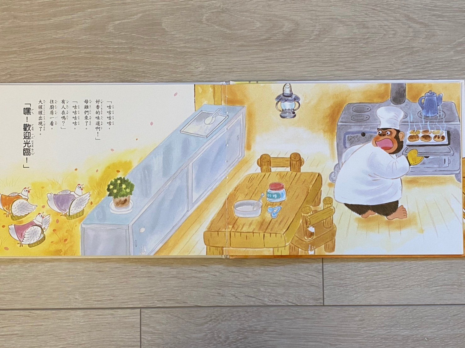我平時念故事滿單調乏味的,但讀到大猩猩的粗體字台詞時也能不自覺的宏亮起來,可以讓寶寶更融入故事情境。