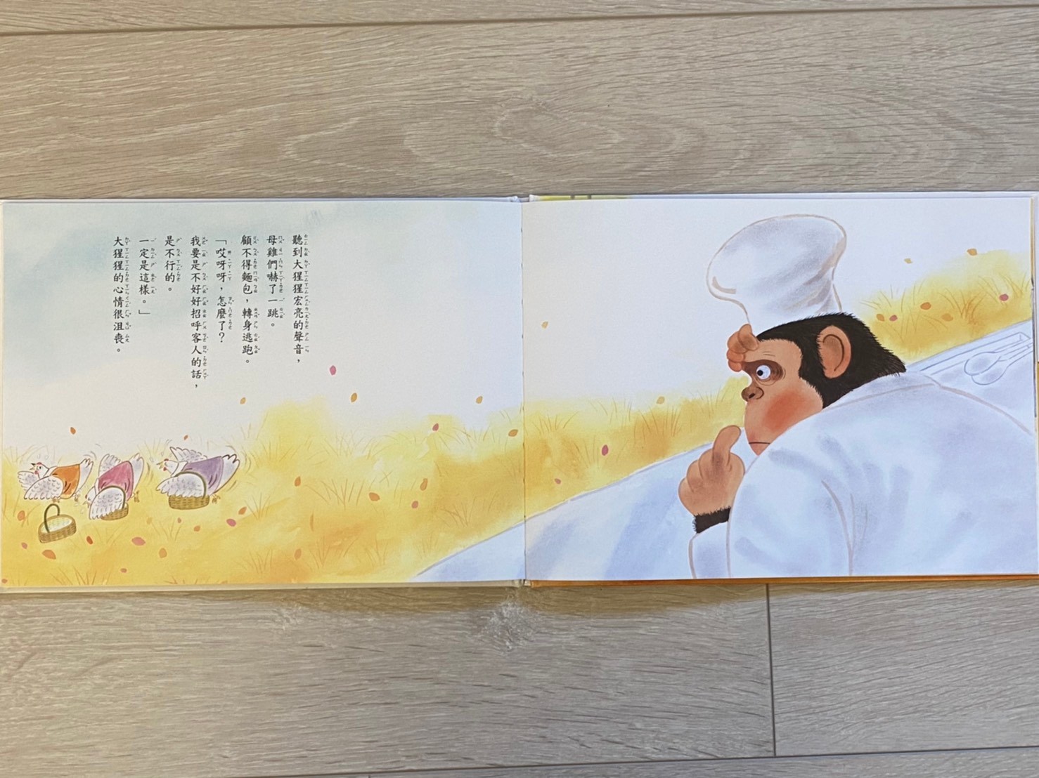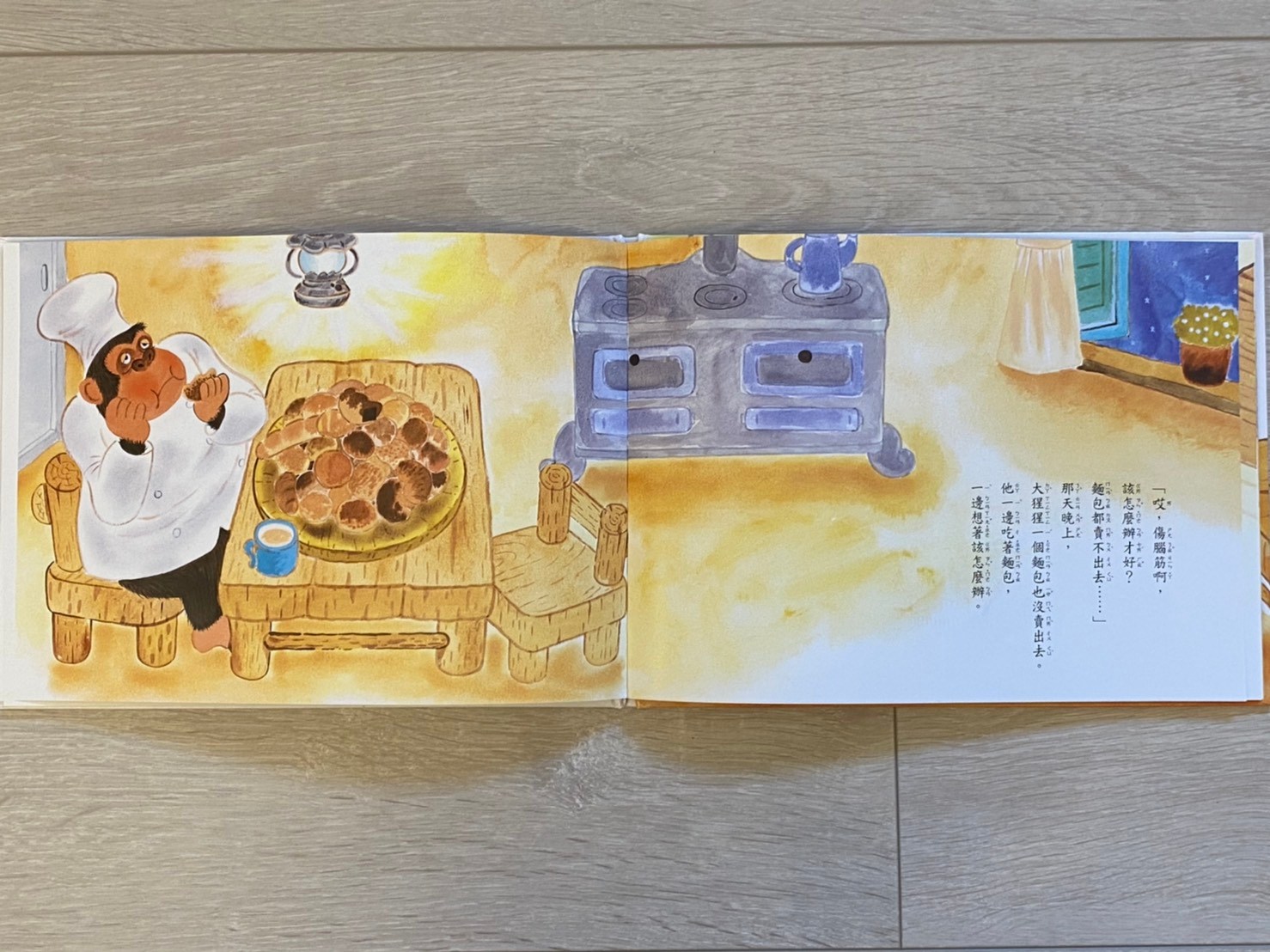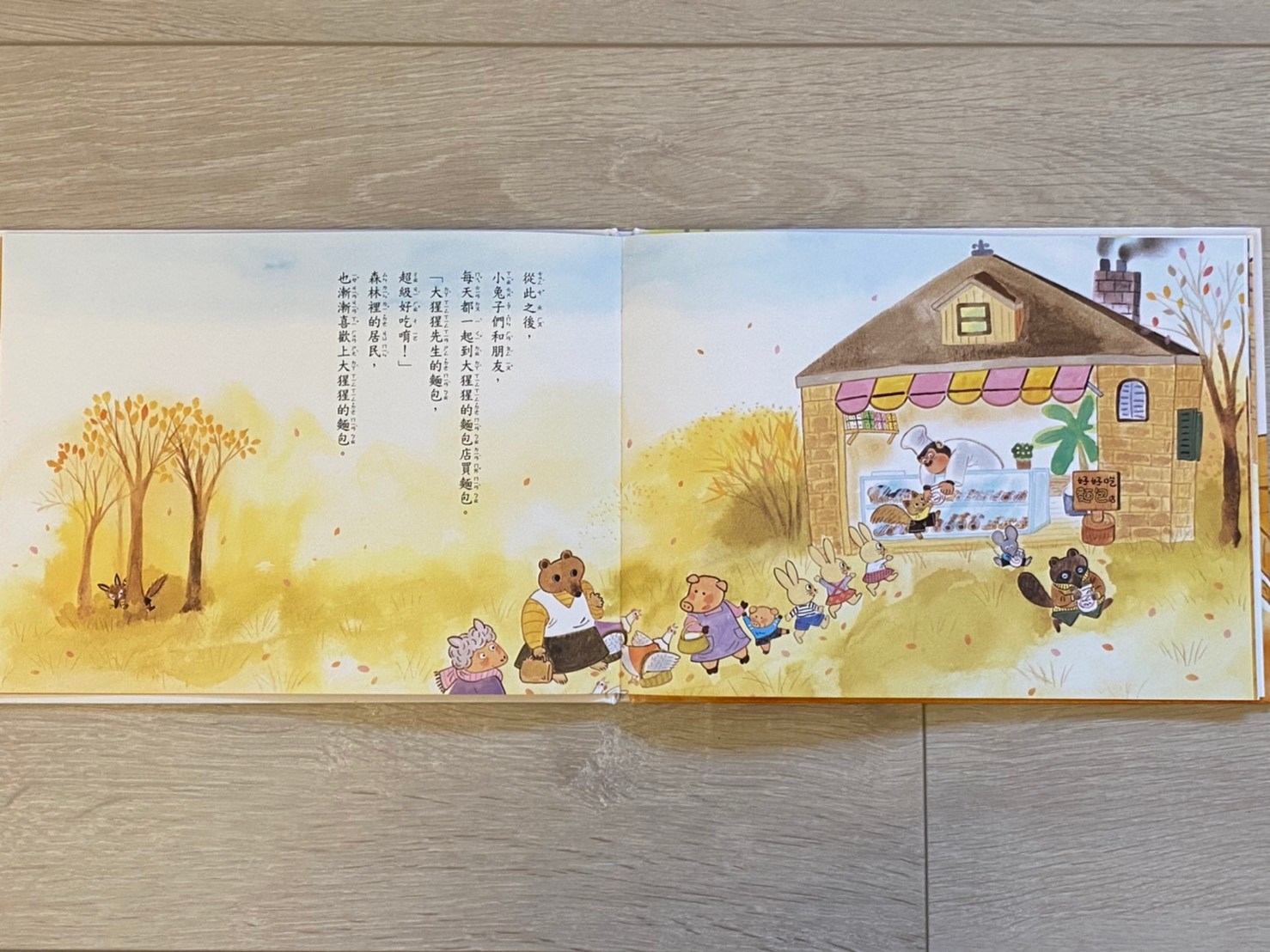 故事的最後,「文字」部分在「小兔子和朋友們時常上門買麵包,森林裡的居民也漸漸喜歡上大猩猩的麵包」這裡結束了。