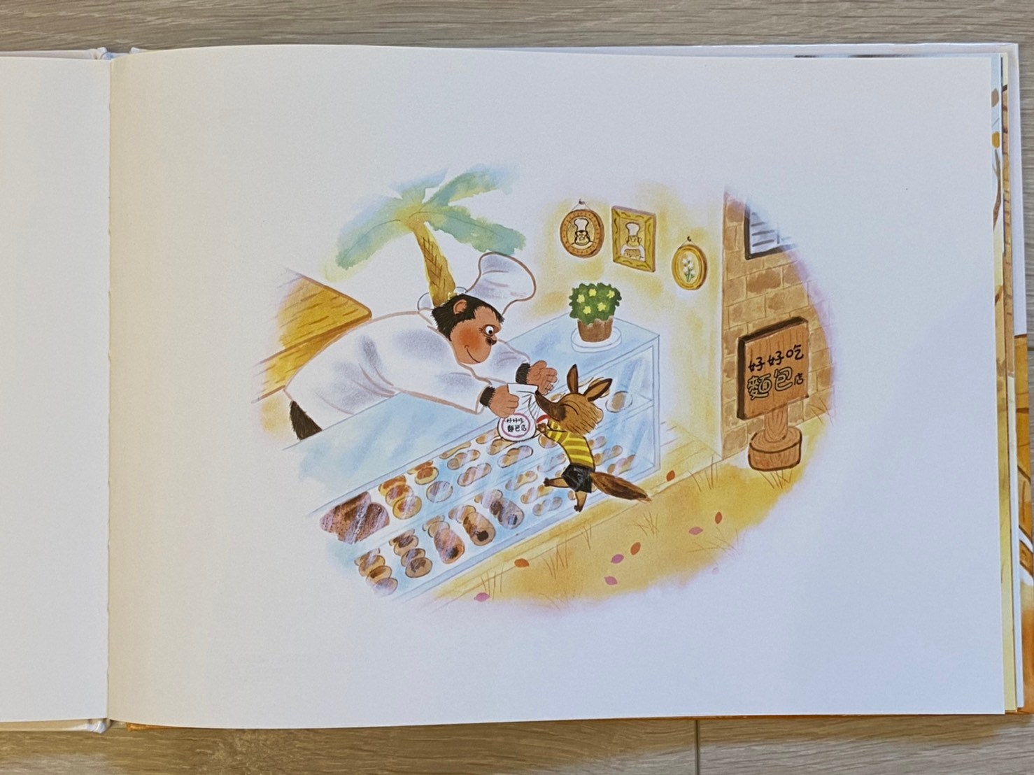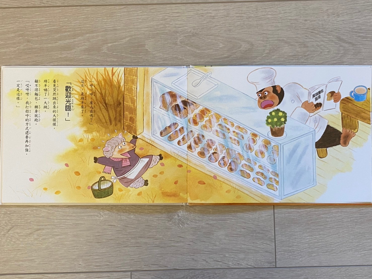 但故事裡的「插圖」卻仍在說故事──那隻插隊小狐狸躲在樹後偷看著!!然後再往下翻一頁,就會發現小狐狸又來買麵包、而且大猩猩也為牠服務喔!(這裡如果家長行有餘力,可以帶領孩子想像牠們的對話內容,一定很有意思!)