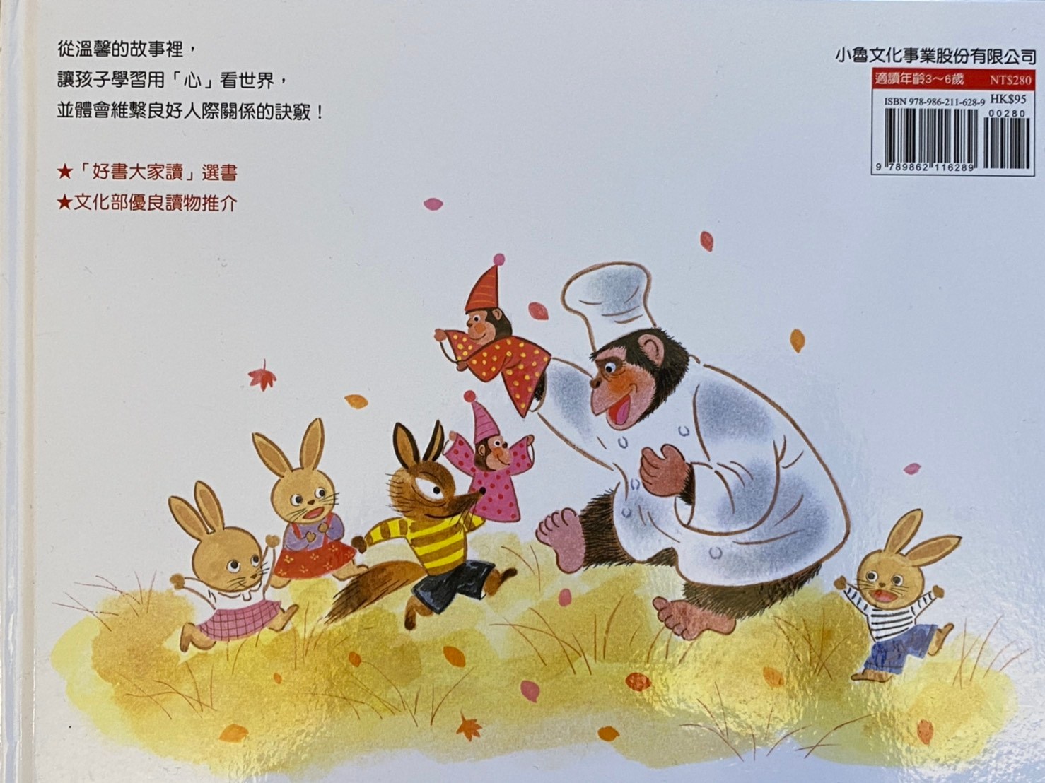 書的封底是大猩猩、小兔子、狐狸玩在一塊,這張插圖像是什麼都沒說,卻也說了很多,充滿了想像空間。