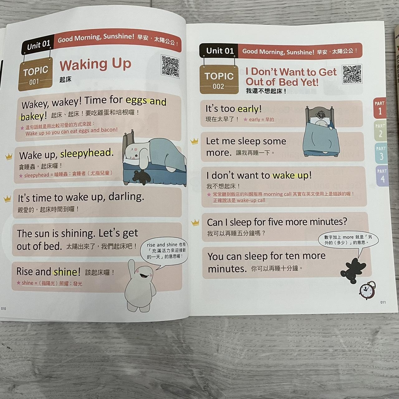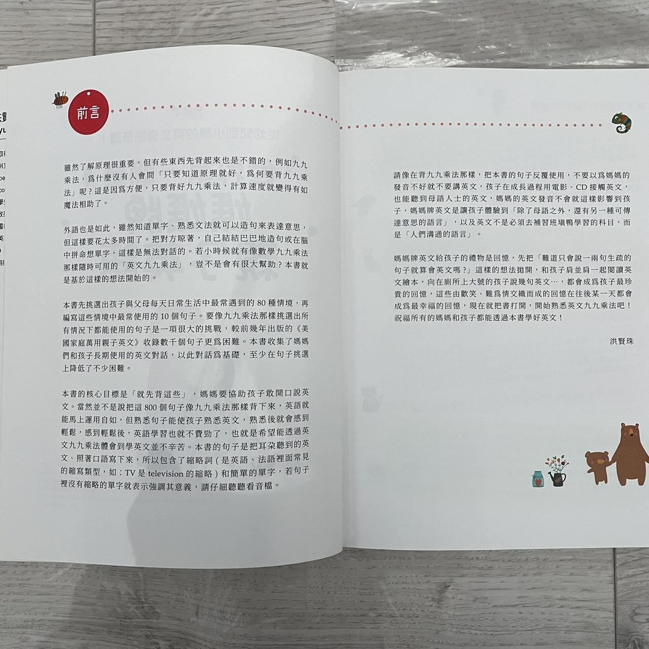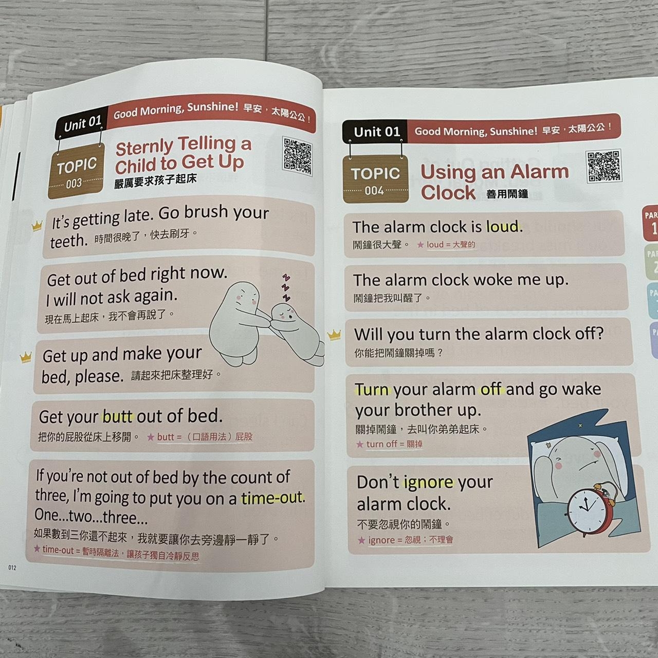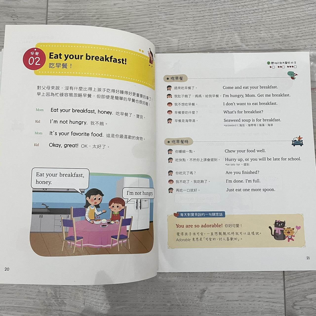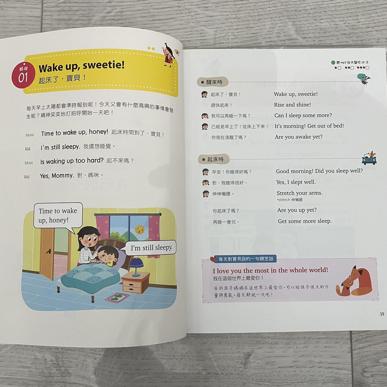 以前工作還有現在全職顧小孩都不太會使用英語,只有唱童謠會用到。英語程度僅限讀和聽,寫和說都無法。一方面是希望以後能給小孩雙語環境,一方面是讓自己可以漸漸能說全英語,所以借了這2本書。這兩本都是由小孩從起床開始一整天作息來編排,都有CD,音檔聽起來都很清楚。第一本是把相同意思的句子列出來,中間會穿插心智圖,這本句子比較多,有些比較長一點點;第二本是會話格式,每個主題後會列一句對寶貝說的親密話,這本比較薄,句子都很短。兩本對我來說,我喜歡第二本,作者前言有提到就像背99乘法一樣,雖然了解原理很重要,但是背起來使用更方便。所以找出最常遇到的80個情境*10句子,背起來使用就會比較輕鬆,最重要的是傳達‘除了母語外,還有另一種可傳達意思的語言’以及’英文不是必須去補習班填鴨學習的科目,而是人們溝通的語言‘。