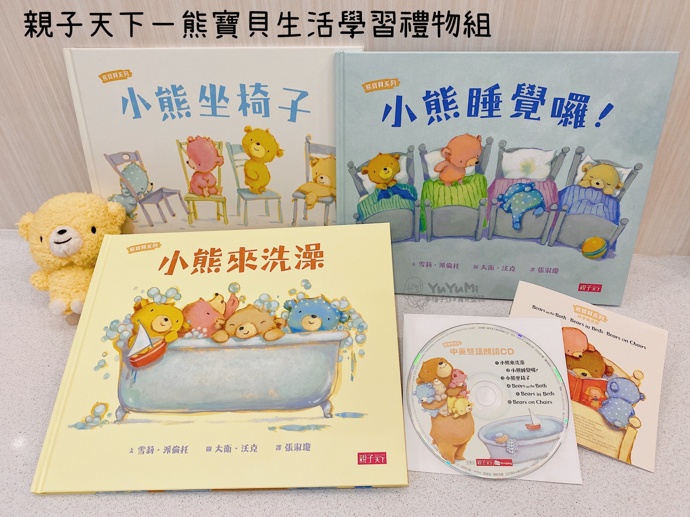 「熊寶貝生活學習禮物組」,內有三本繪本+一片中英文CD+英文手冊+小熊玩偶。