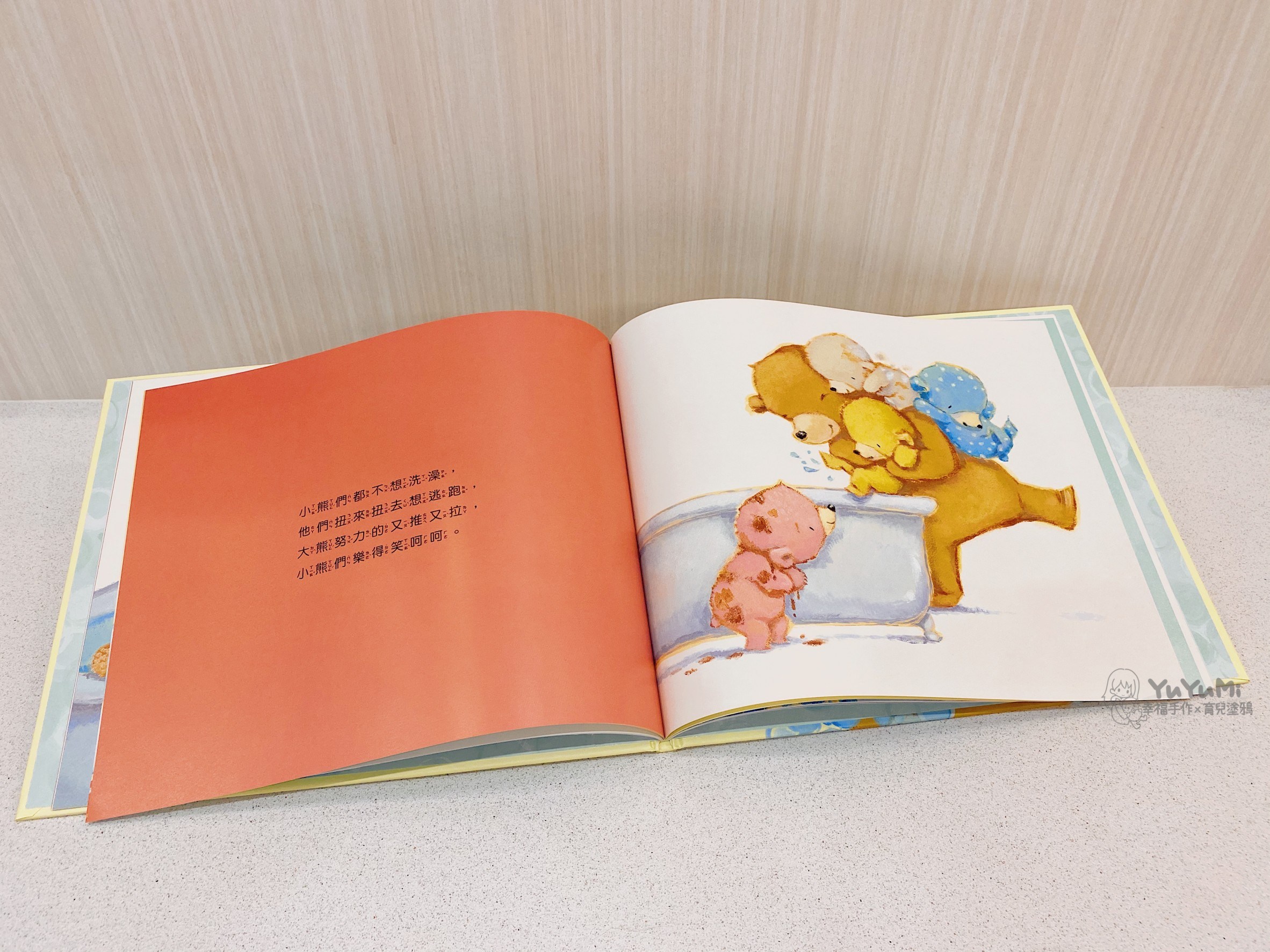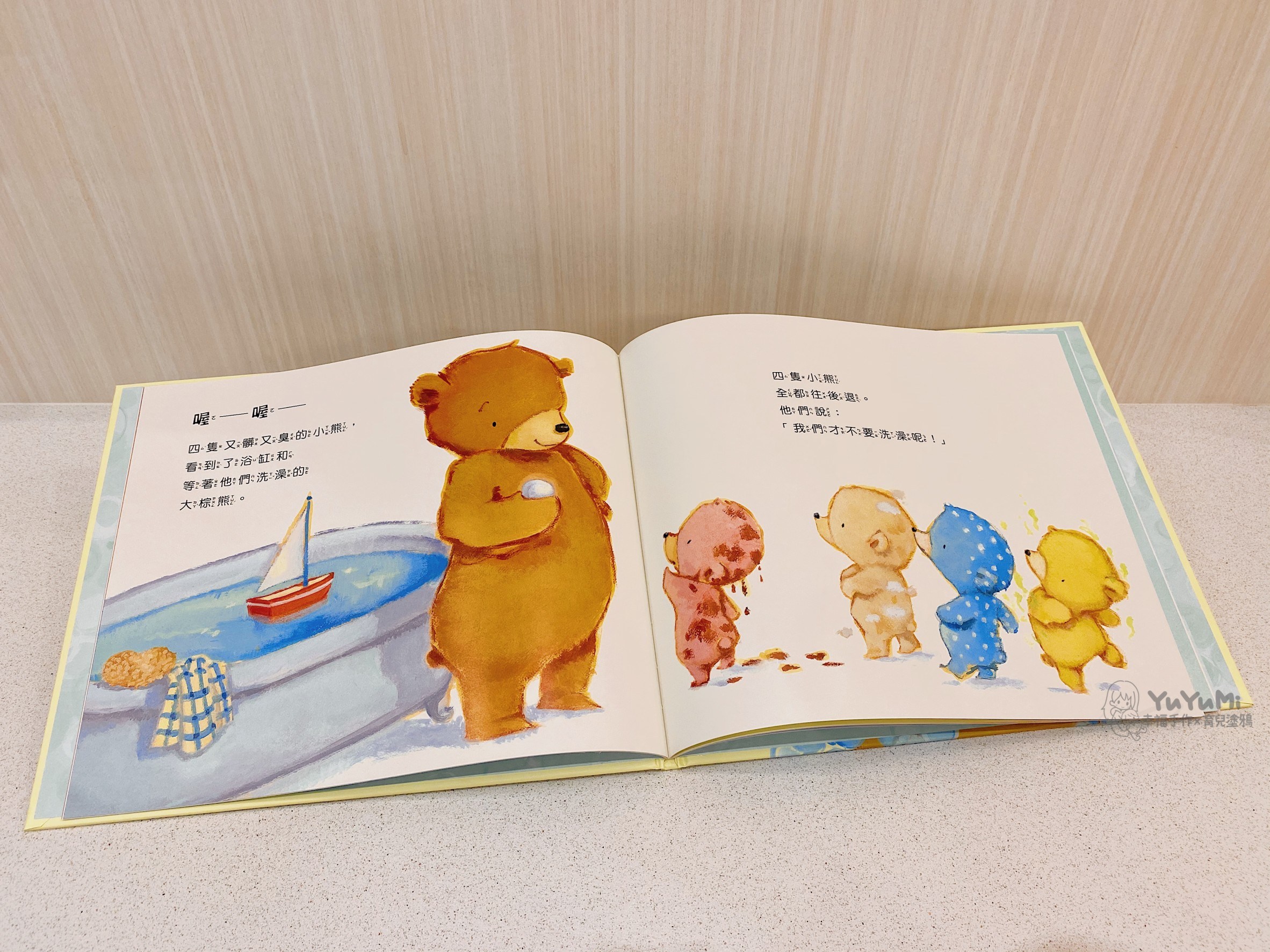 『小熊來洗澡』講述又髒又臭的小熊們不想洗澡時,大棕熊並不是用強迫的,而是親自示範洗澡並樂在其中,引導小熊們自動自發來一起洗澡玩水,讓洗澡這件事變得更有趣。