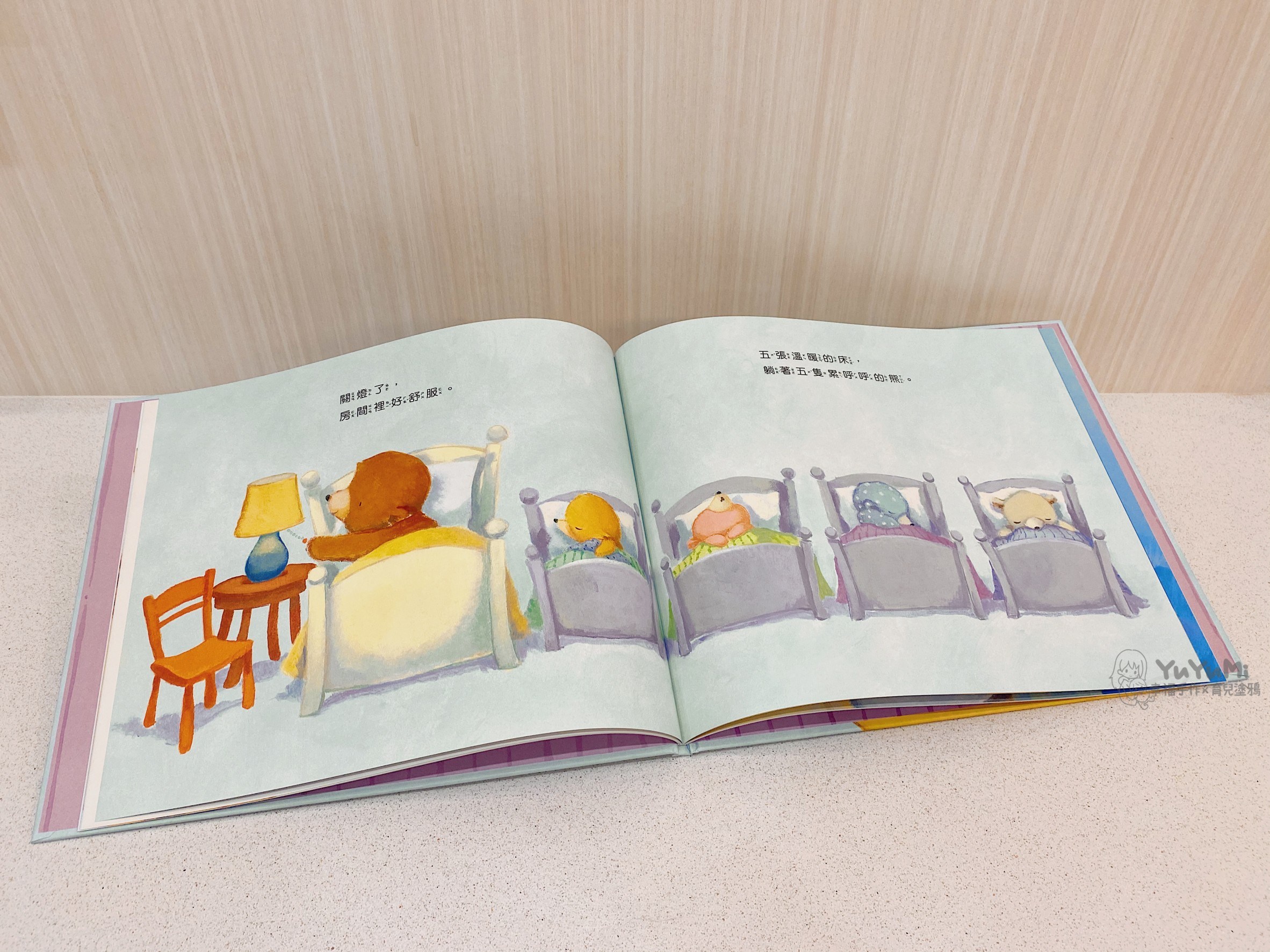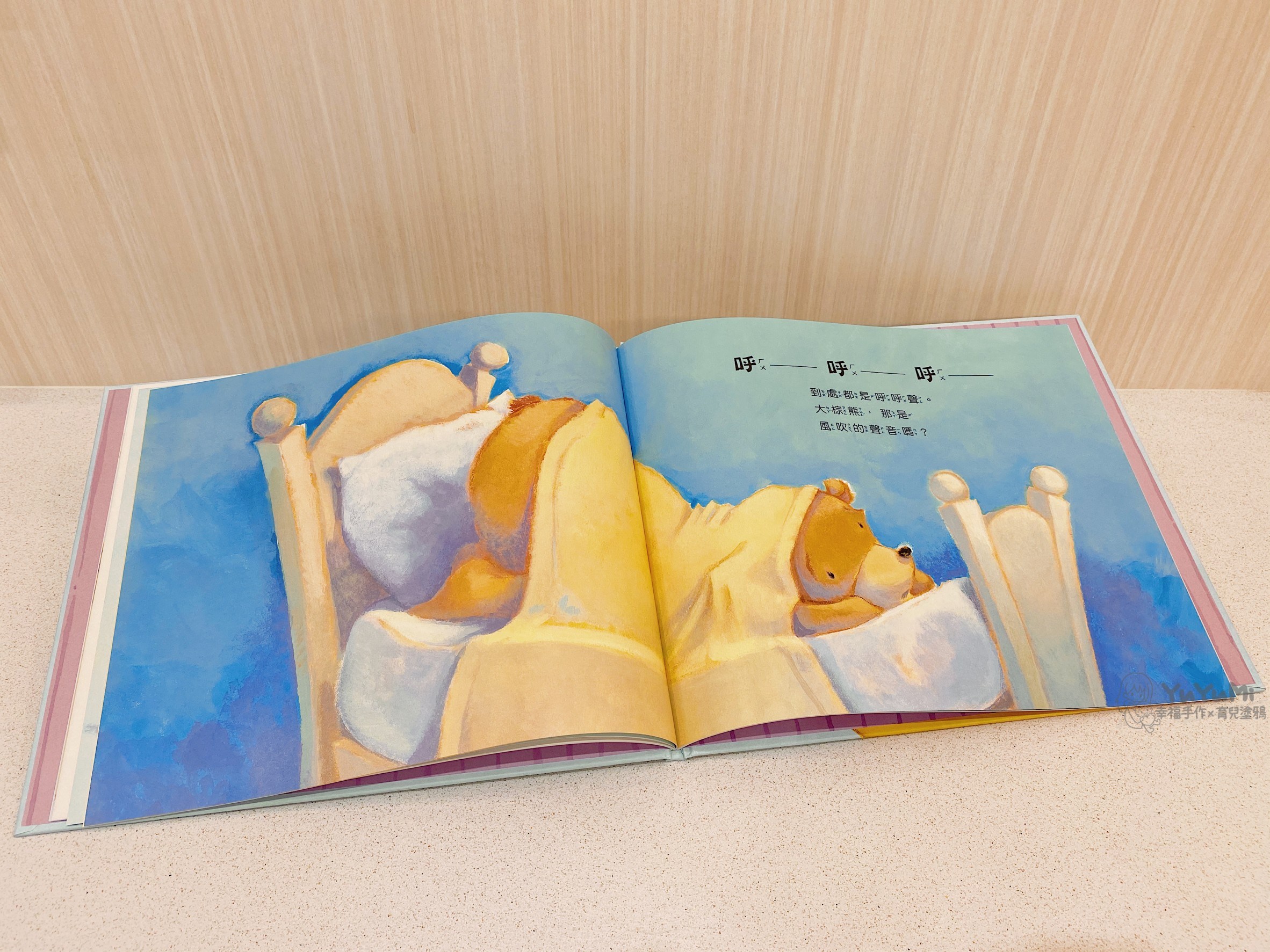 『小熊睡覺囉』敘述睡覺時間到了,大棕熊和小熊們之間的睡前互動,然而半夜突如其來的怪聲,讓大家都很害怕,最後勇敢面對並一起睡著的故事。