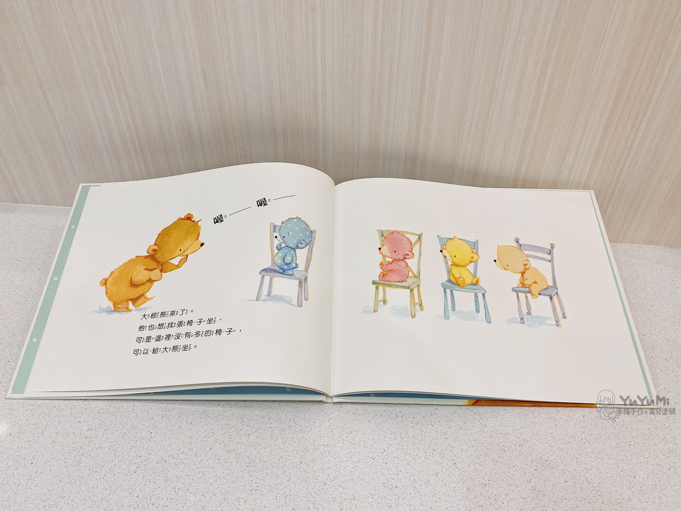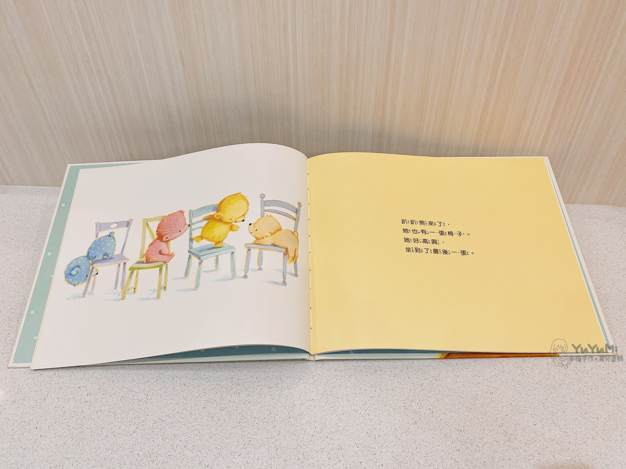 『小熊坐椅子』描述當椅子不夠坐時,小熊們是如何排列組合椅子來試著解決問題,並在最後看見「分享」所帶來的快樂。