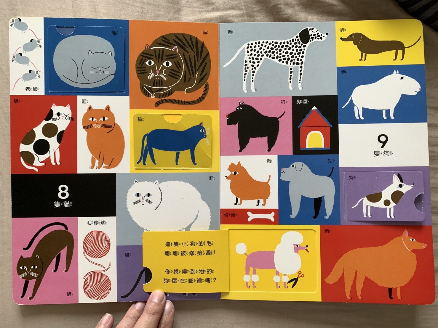 這本書是翻翻書也是找找書,翻頁的部分可能是動物轉變樣貌,或是讓你找其他東西,主要架構是教數1~10的數字。寶寶6m時就入手,但是那時候有點太早,初期只搭配媽媽自嗨的讀字來認識上面圖片,到11m左右寶寶能自己翻,直到現在1y10m能應用初階數數字。非常推薦的原因是真的很耐不會破,它不是很厚的硬頁書,翻起來的部分沒注意可能會有摺痕但是真的扯不破!