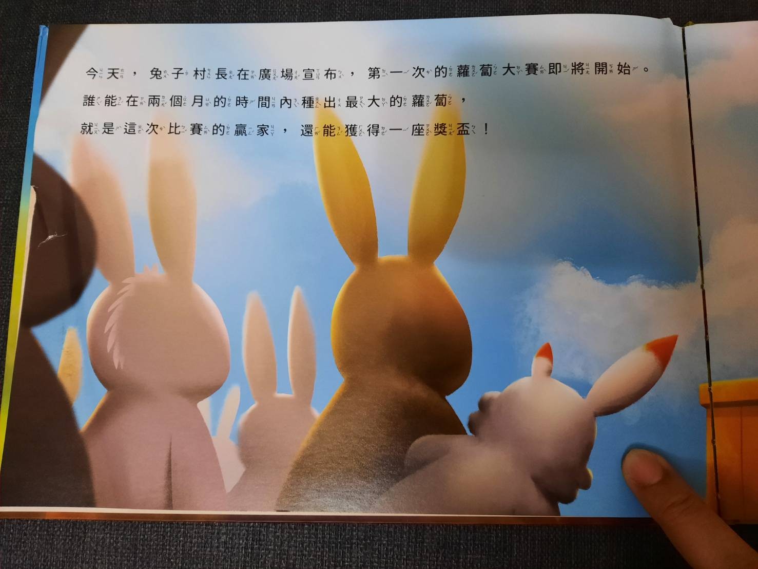 這本是來自叮叮噹活動得到,一取回就露出一邊已破損袋子的書本,大寶就急忙拆開要我講故事,我自己都還沒看完一遍,大寶就一頁一頁搶翻要我講,整個故事講完一副意猶未盡樣,且直說他也要種好大的蘿蔔!