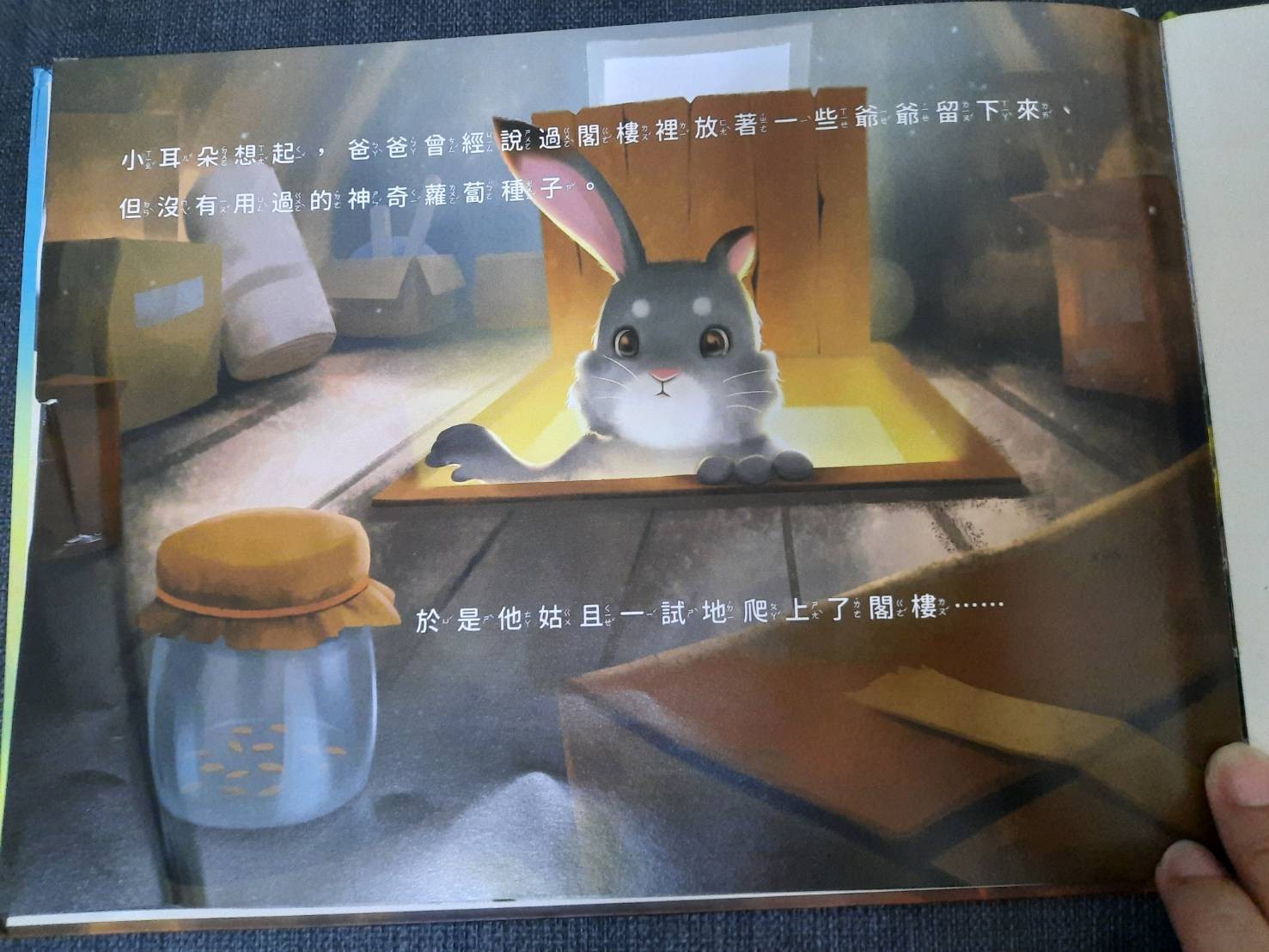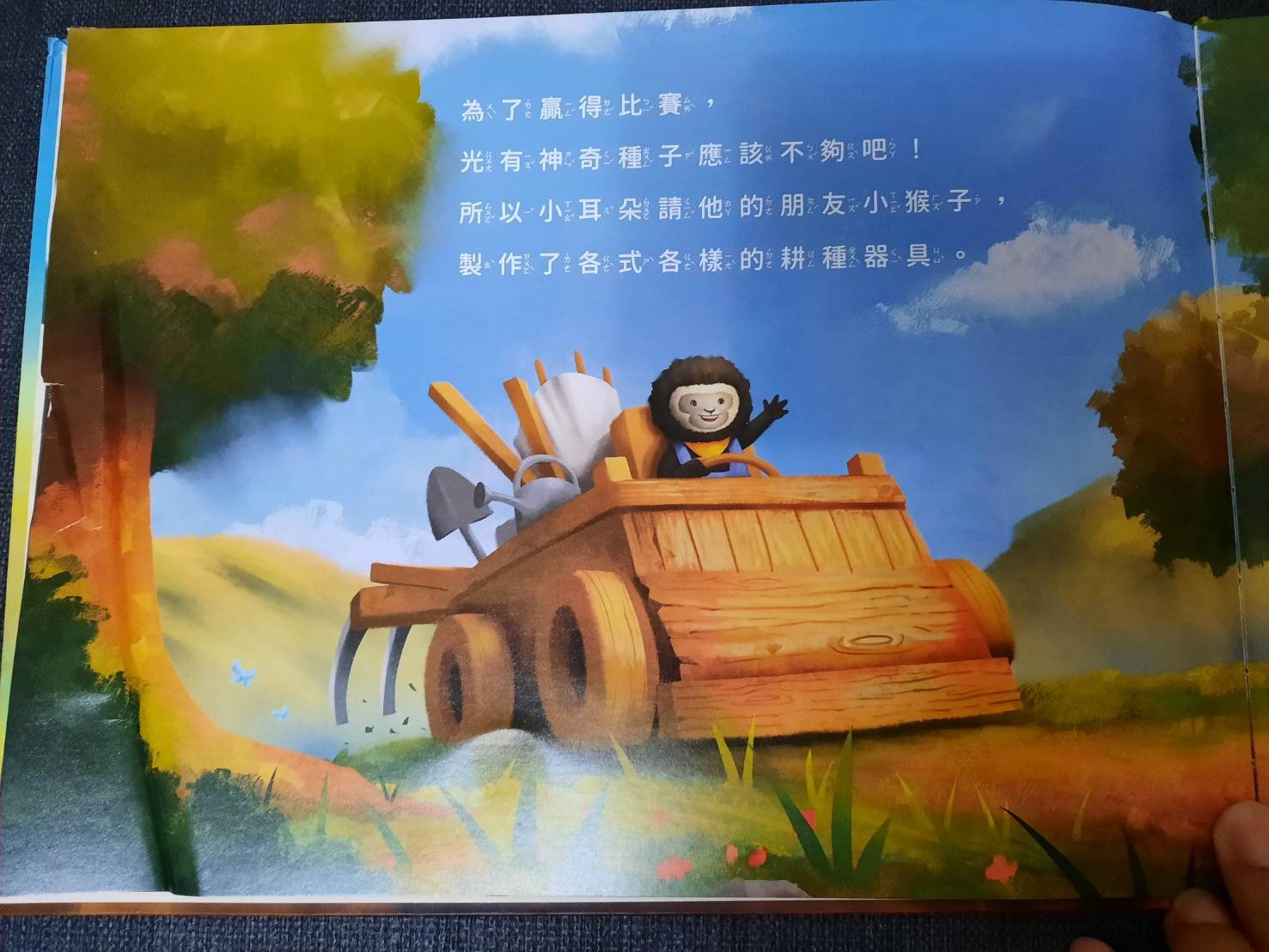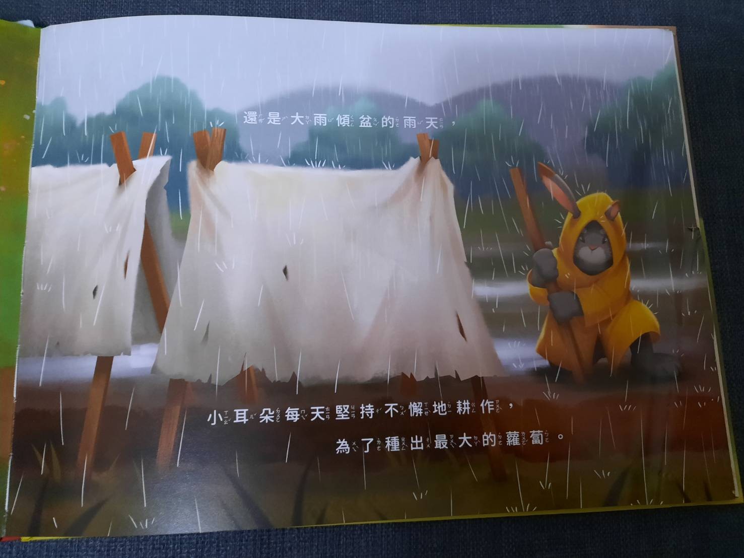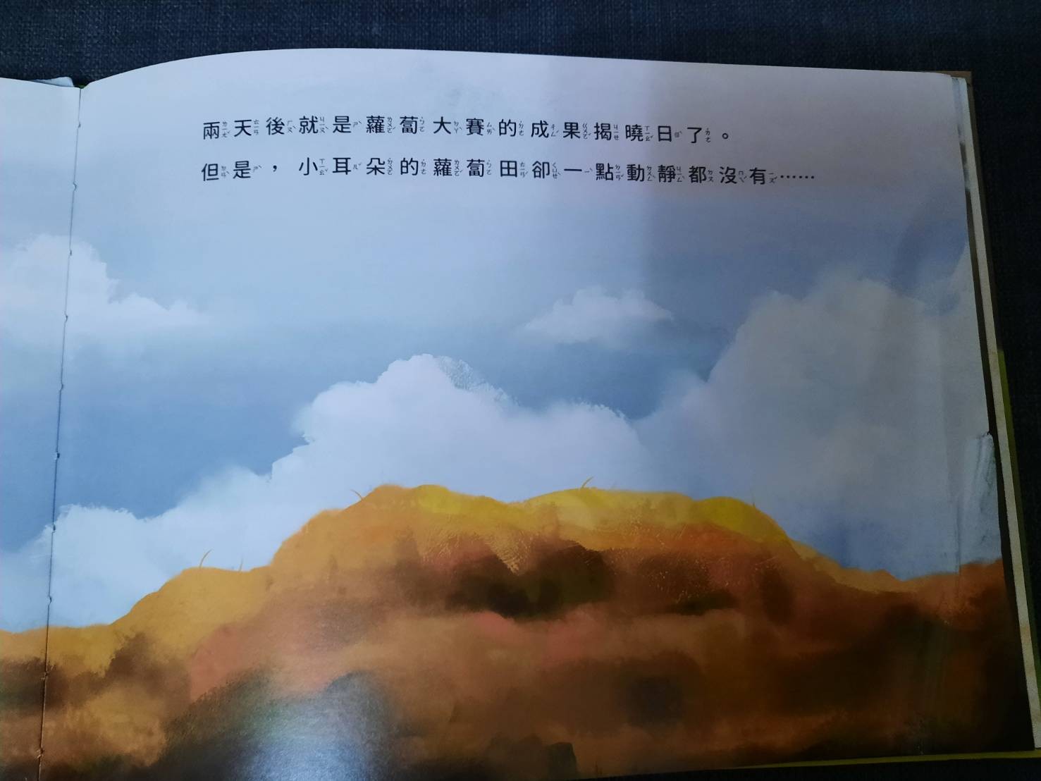 故事中小耳朵的比賽時間到了,辛苦耕種的蘿蔔卻沒有長大,但小耳朵仍堅持繼續耕種,得到超乎想像的豐碩成果。這本書把人生寓意編入故事,對於付出努力卻得不到想要的結果,但我們能快樂享受過程才是最重要。