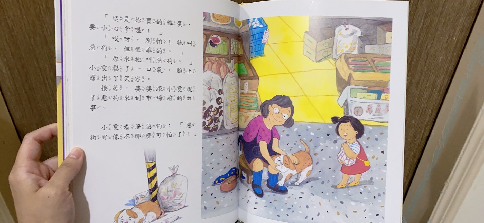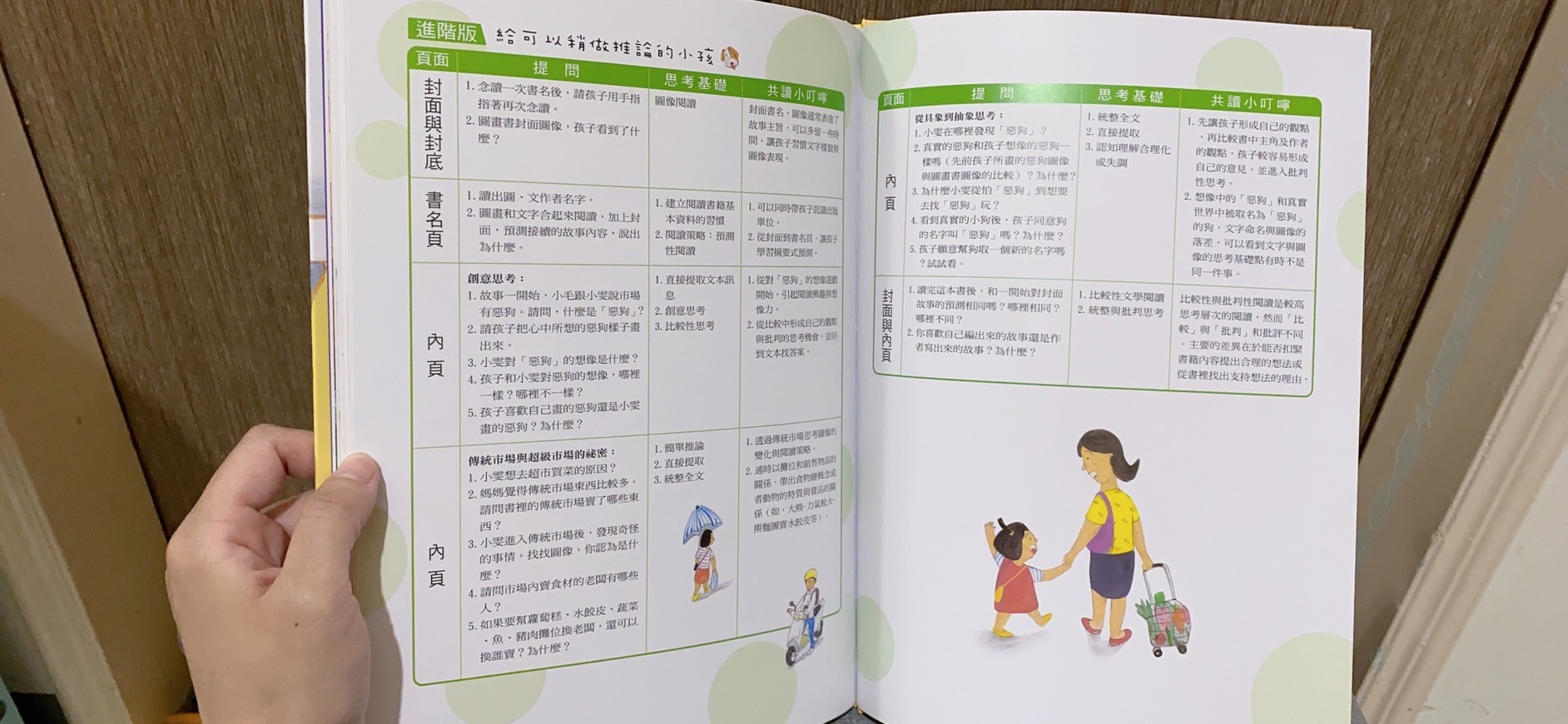 畫風很細膩,也可以藉由繪本討論途中出現的各種攤販,更棒的是不用怕你不會共讀,書的後面教了親子共讀的方法還有分基礎跟進階