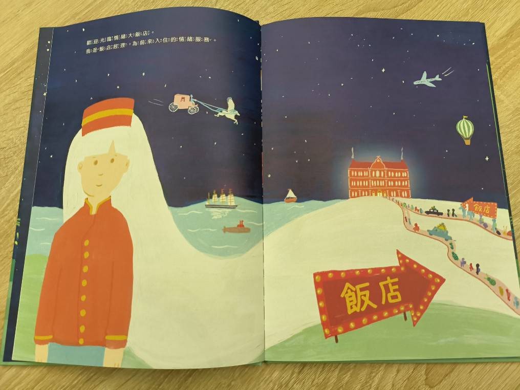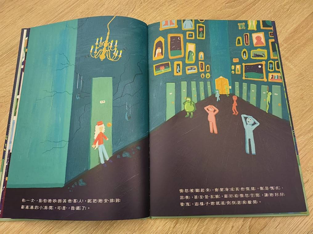 將情緒擬人化讓我聯想到Disney卡通腦筋急轉彎,讓孩子更能將心中的房間好像分了好幾個讓各種情緒入住,不分好壞,不分入住長短時間,讓進住與退房的比喻我很喜歡,最後的平靜、感謝與愛流轉在故事裡和讓孩子慢慢體會的感覺我很喜歡😊