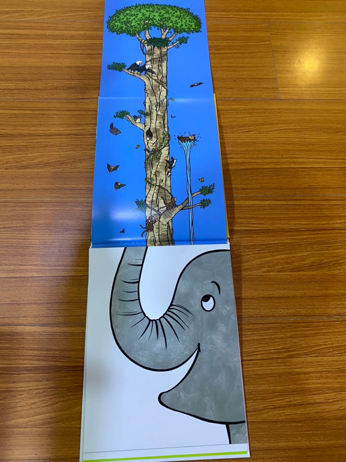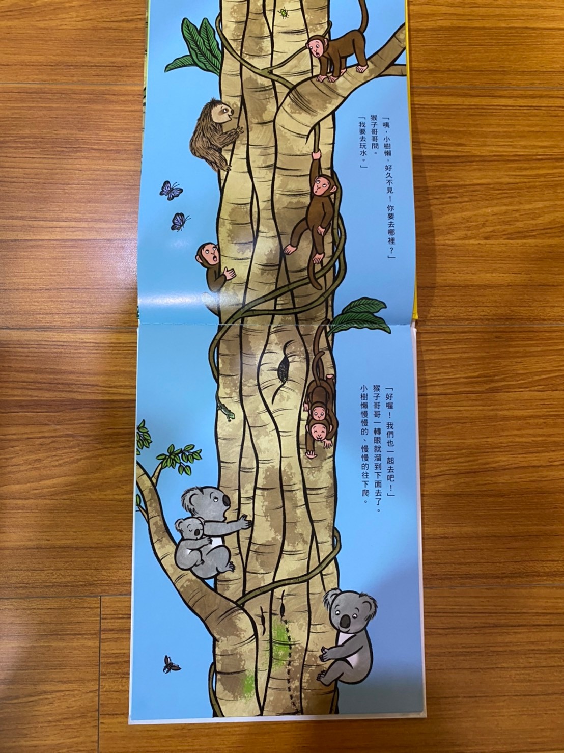 小樹懶住在好高好高的樹上,藉著爬下樹的過程遇到不同的動物,可以介紹孩子樹上的動物都是怎麼移動的,而小樹懶又在這過程發生了什麼小意外,最後大家開心完水後小樹懶得到大象媽媽的幫助可以順利提早回到可愛的家。因為這本書平常衝來衝去的兒子,最近自己走樓梯也會說要像小樹懶慢慢的了!