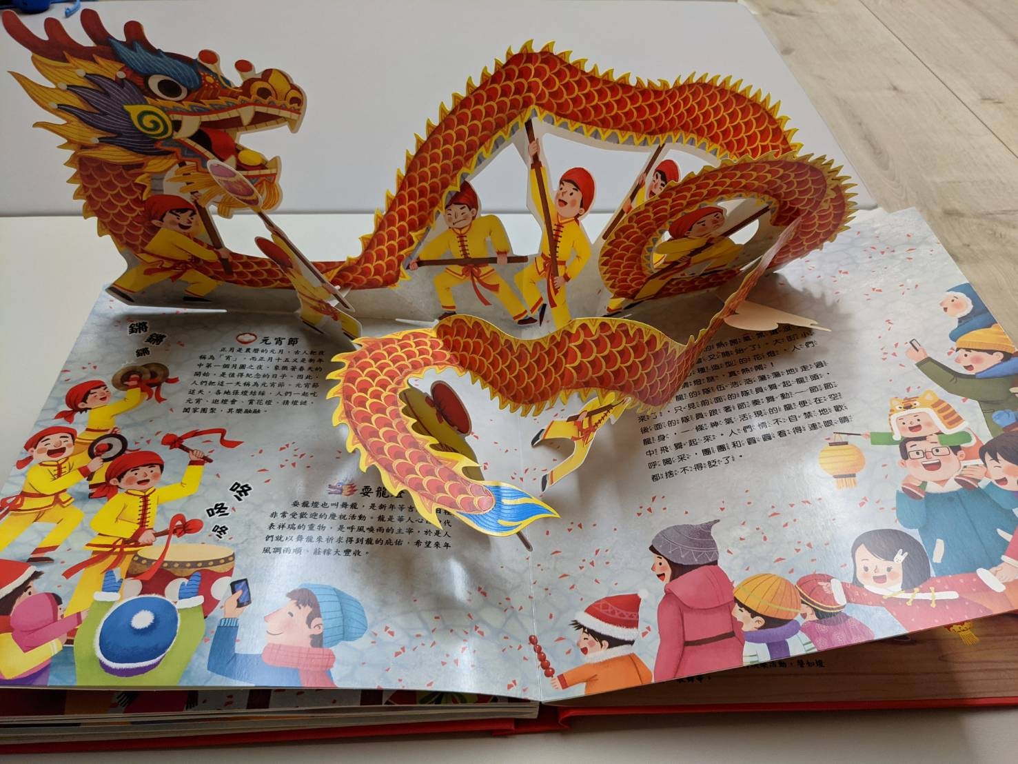 這本書生動活潑的色彩,栩栩如生的立體場景,一打開就非常吸引寶寶(還有爸媽)的視線,尤其翻到舞龍舞獅那一頁,寶寶更是迫不及待想伸手抓來吃以表達她的喜愛XD但因為媽媽自己太喜歡這本書,實在還捨不得讓寶寶自己翻頁,趁過年前要再多共讀幾次,讓寶寶提早感受人生中第一個過年:)