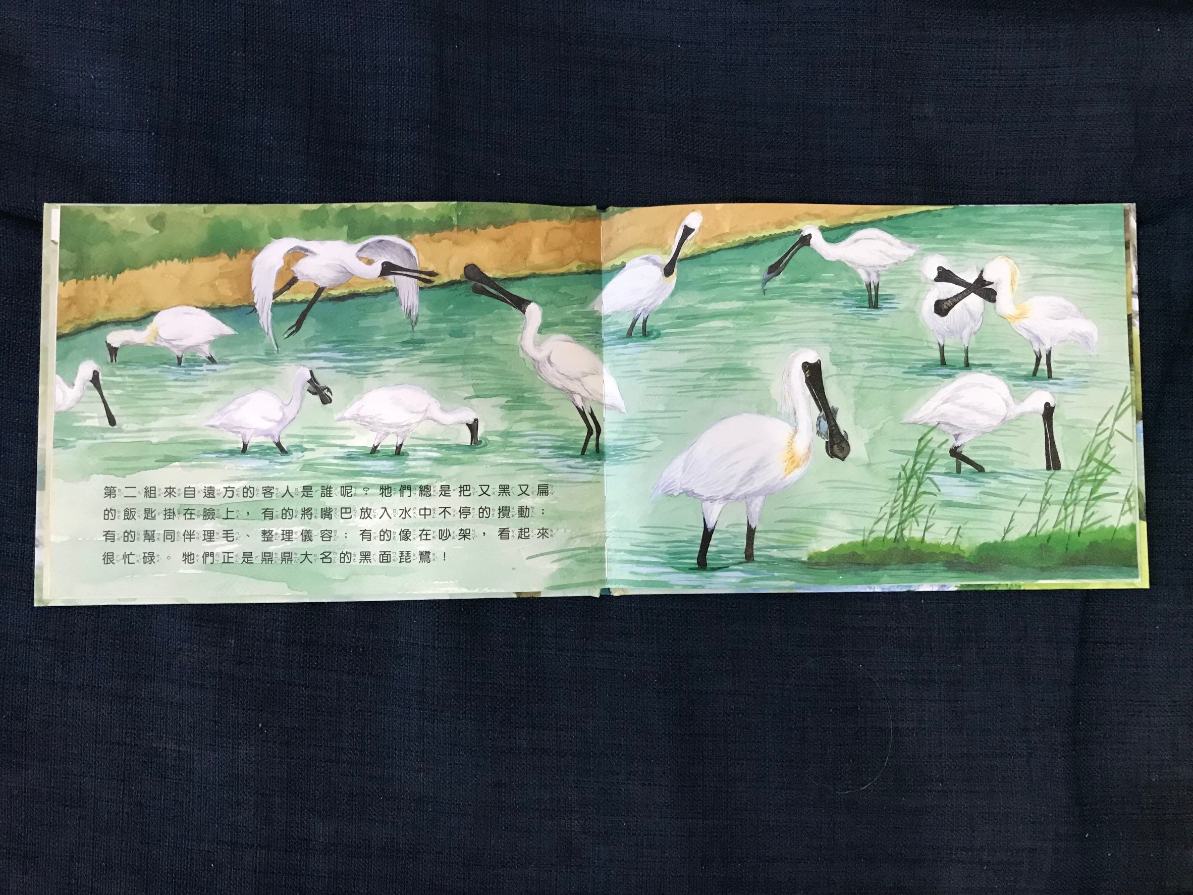 這本書介紹了出沒在台灣不同類型濕地的鳥類、並且繪出了不同嘴型的鳥類的覓食方式與喜歡吃的食物,