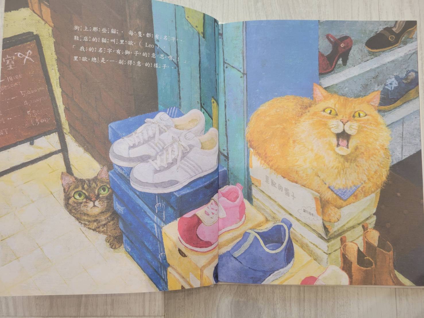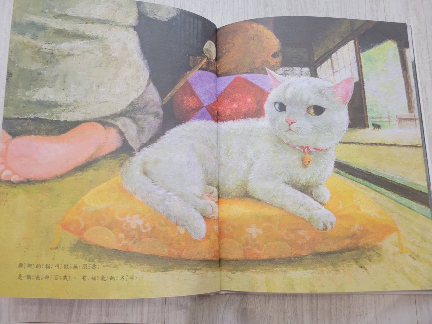 女兒很難得第一次看就翻完一整本。我沒有按照內文講,大概講了一下這是什麼顏色的貓。孩子看到橘貓,還說是獅子,跟內文不謀而合 看到白貓說要抱抱她。我猜可能是上禮拜抱了一隻白色的大狗,看到白貓也想抱一下?