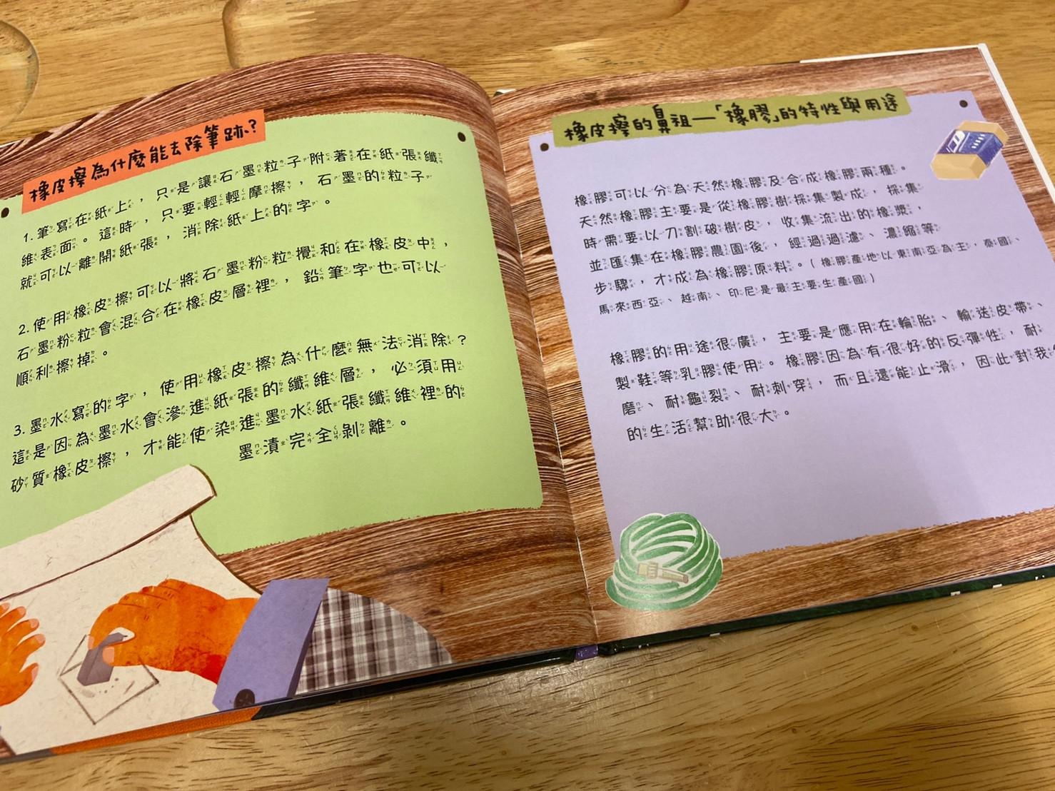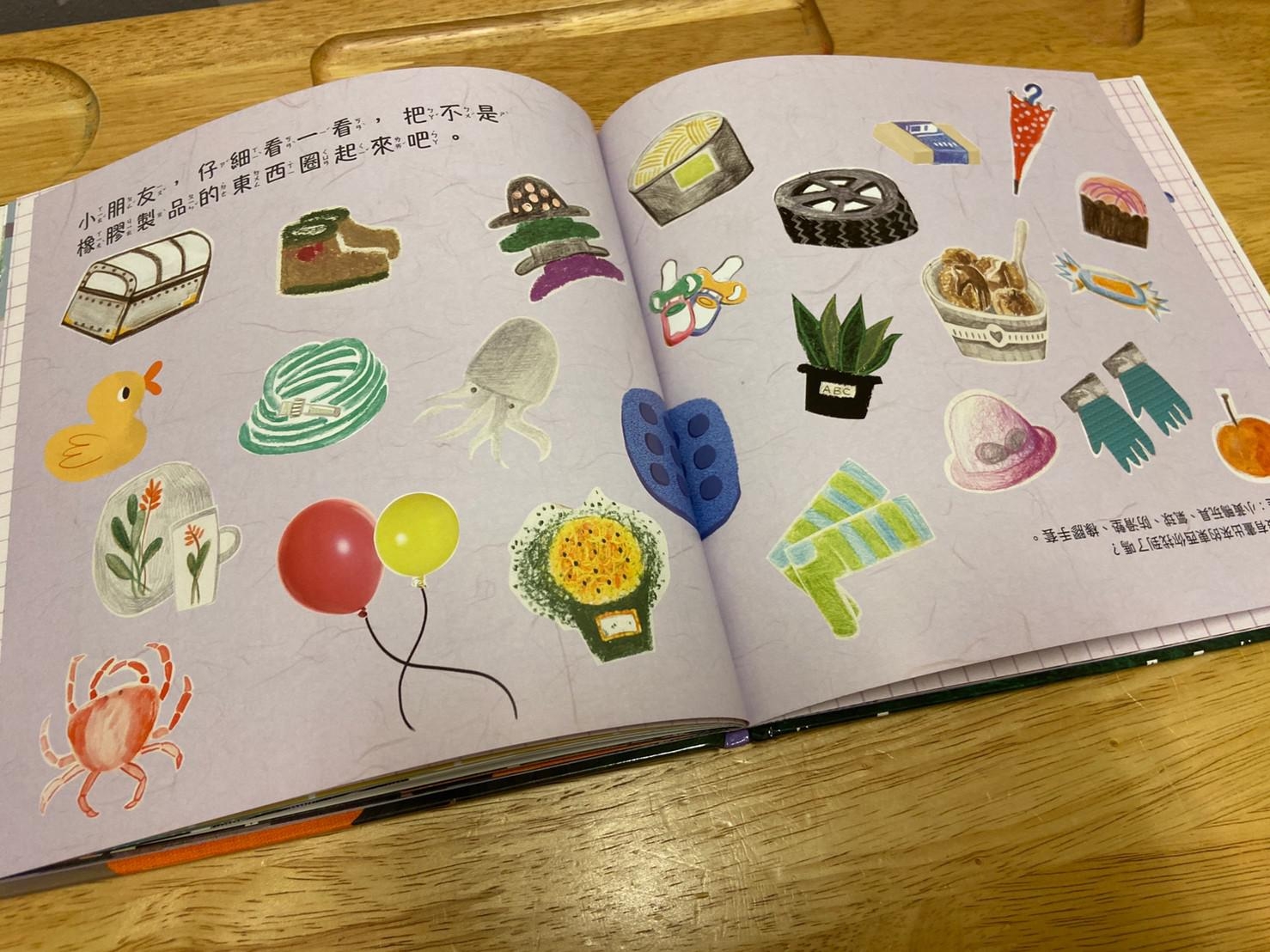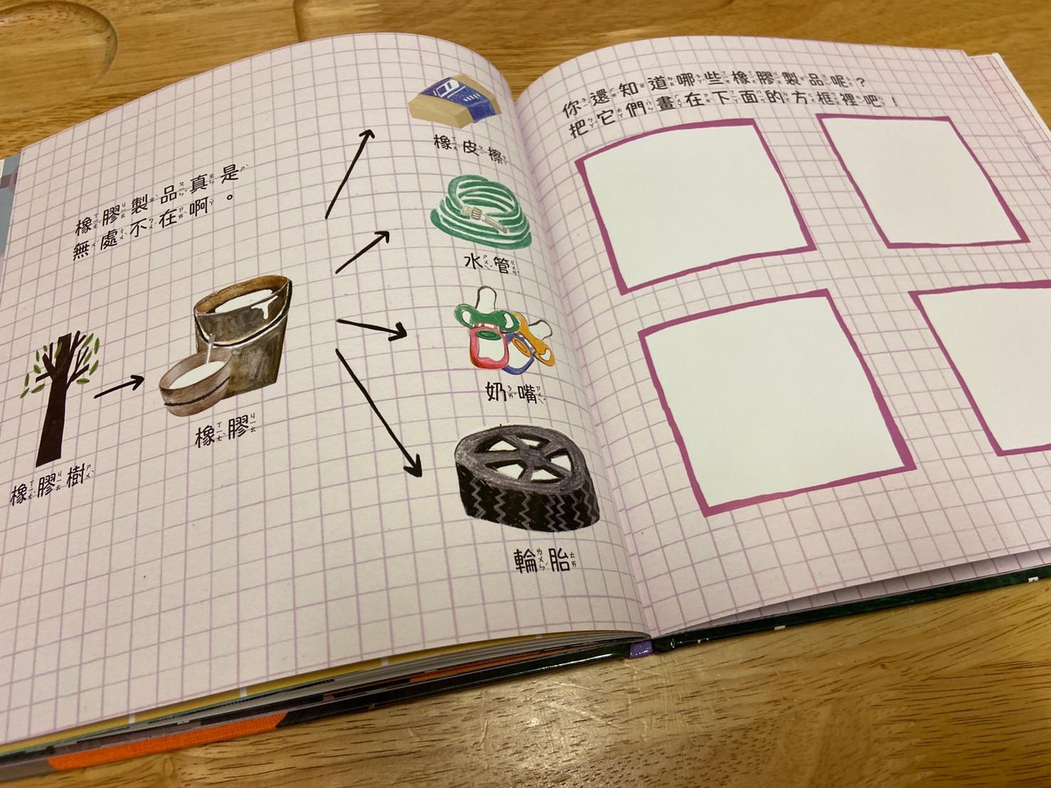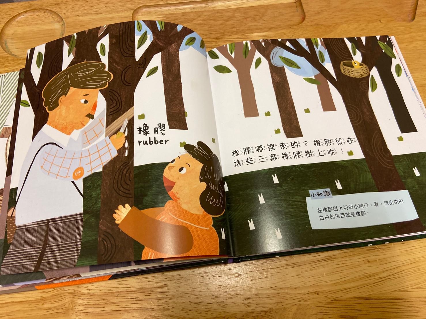 從小孩最常接觸到的橡皮擦開始做延伸,帶出橡皮擦的製作過程和原料,再從原料橡膠樹的汁液延伸介紹到其他再製品,書的後面請小朋友舉一反三列出生活中其他的橡膠製品,書裡面還有其他相關於橡膠的發現、橡皮擦的發現…等相關補充。