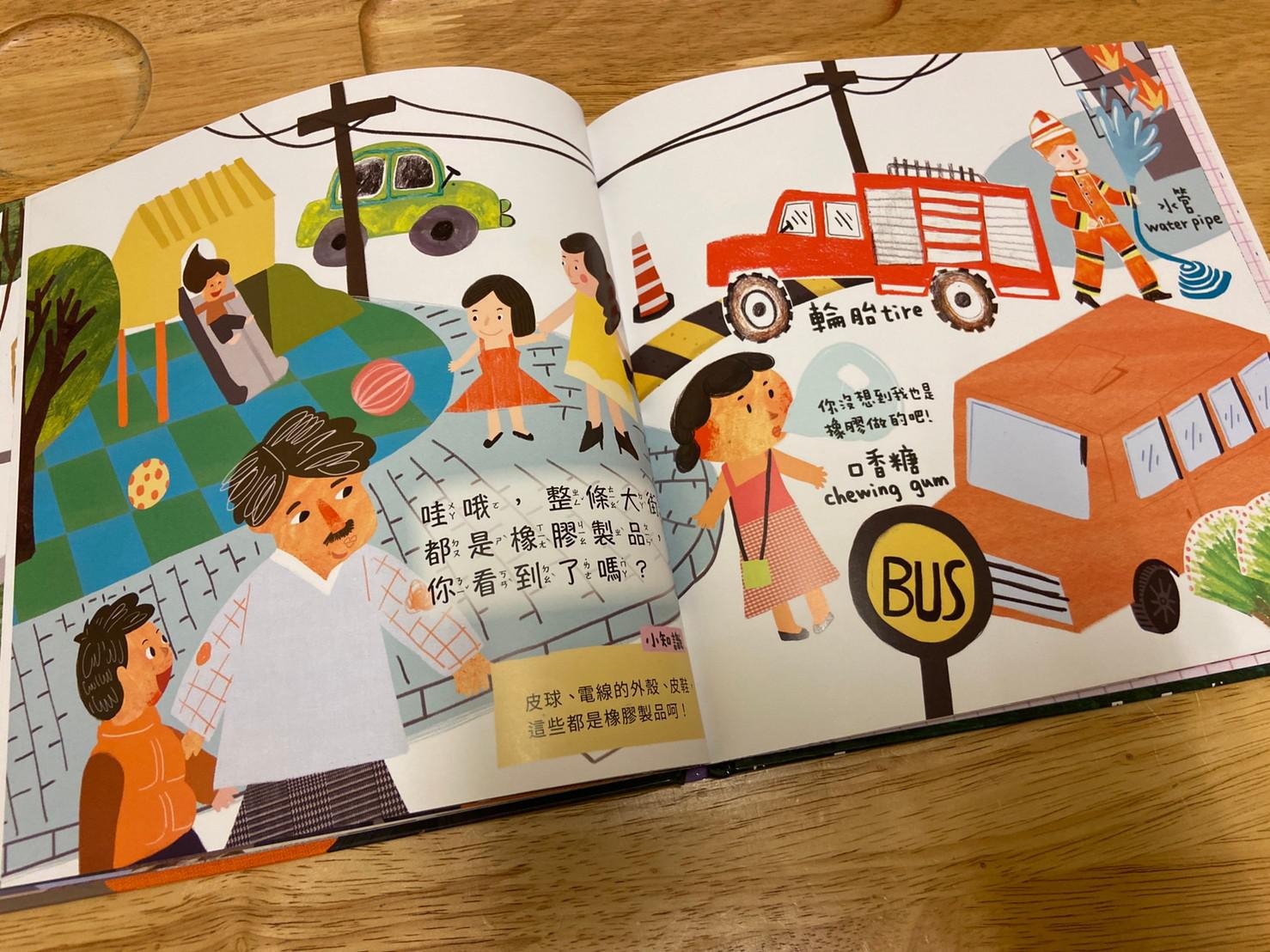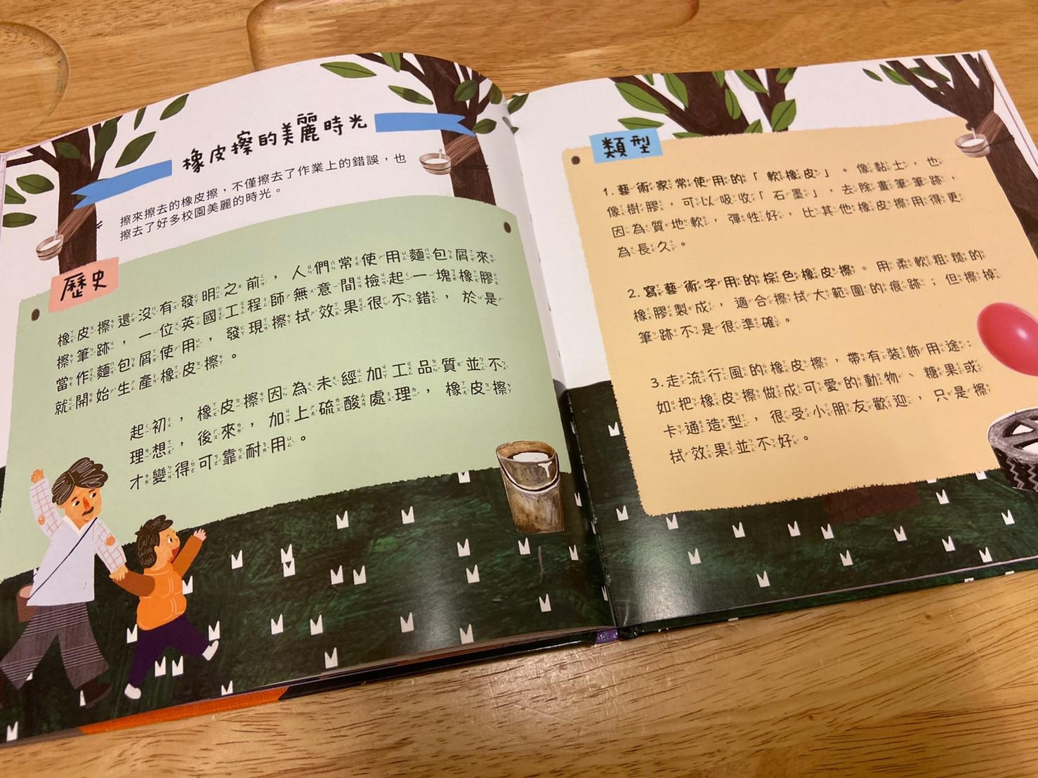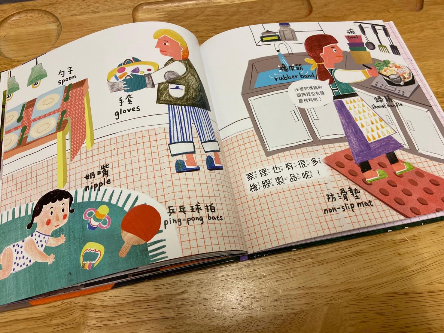 從小孩最常接觸到的橡皮擦開始做延伸,帶出橡皮擦的製作過程和原料,再從原料橡膠樹的汁液延伸介紹到其他再製品,書的後面請小朋友舉一反三列出生活中其他的橡膠製品,書裡面還有其他相關於橡膠的發現、橡皮擦的發現…等相關補充。