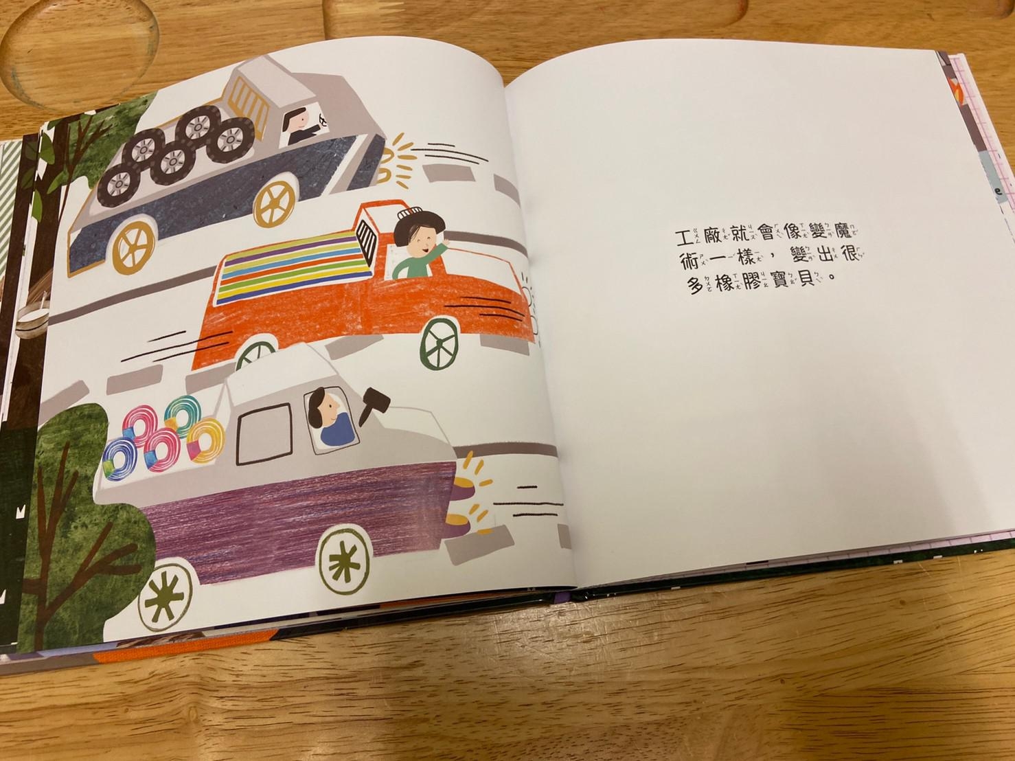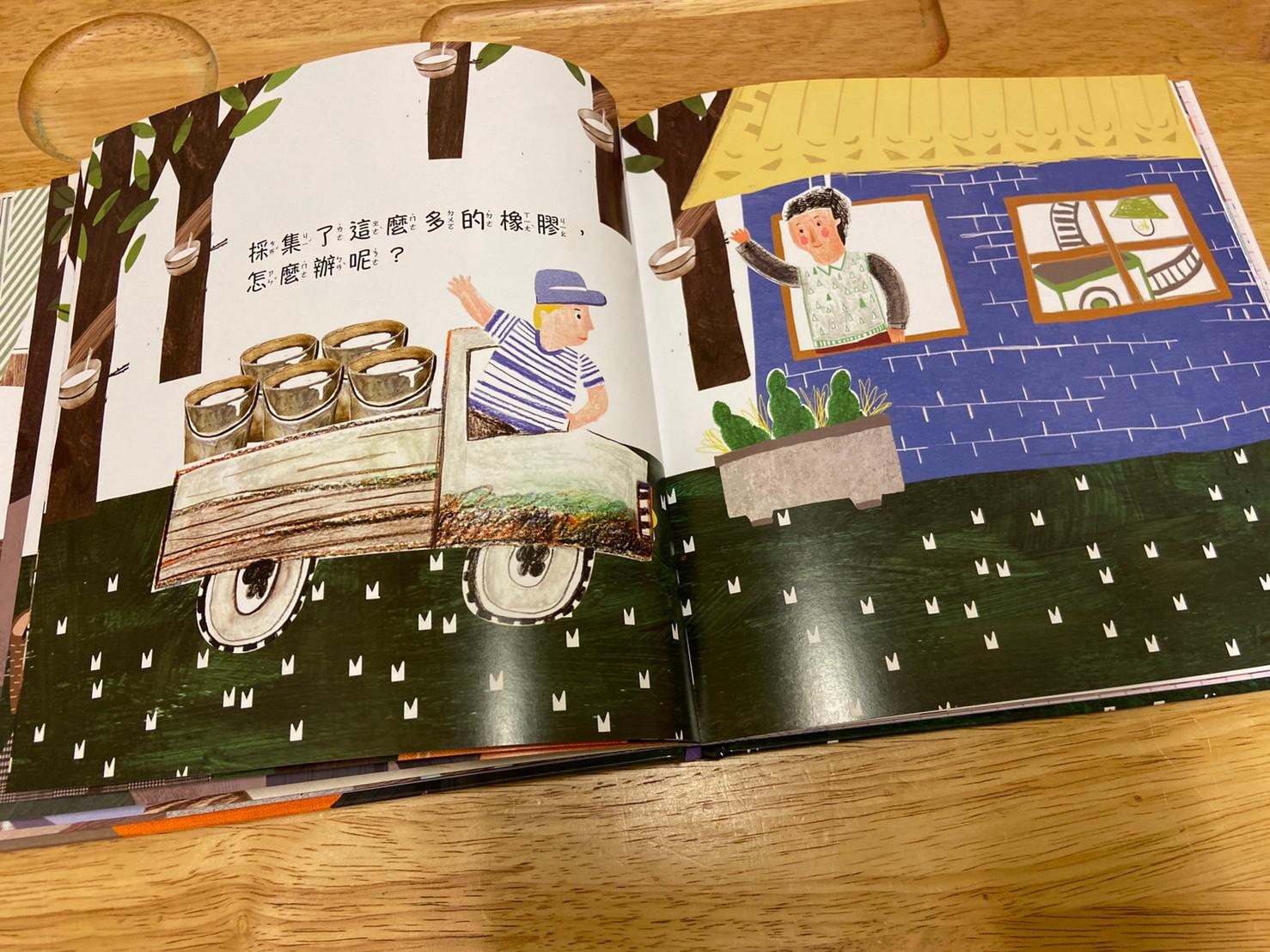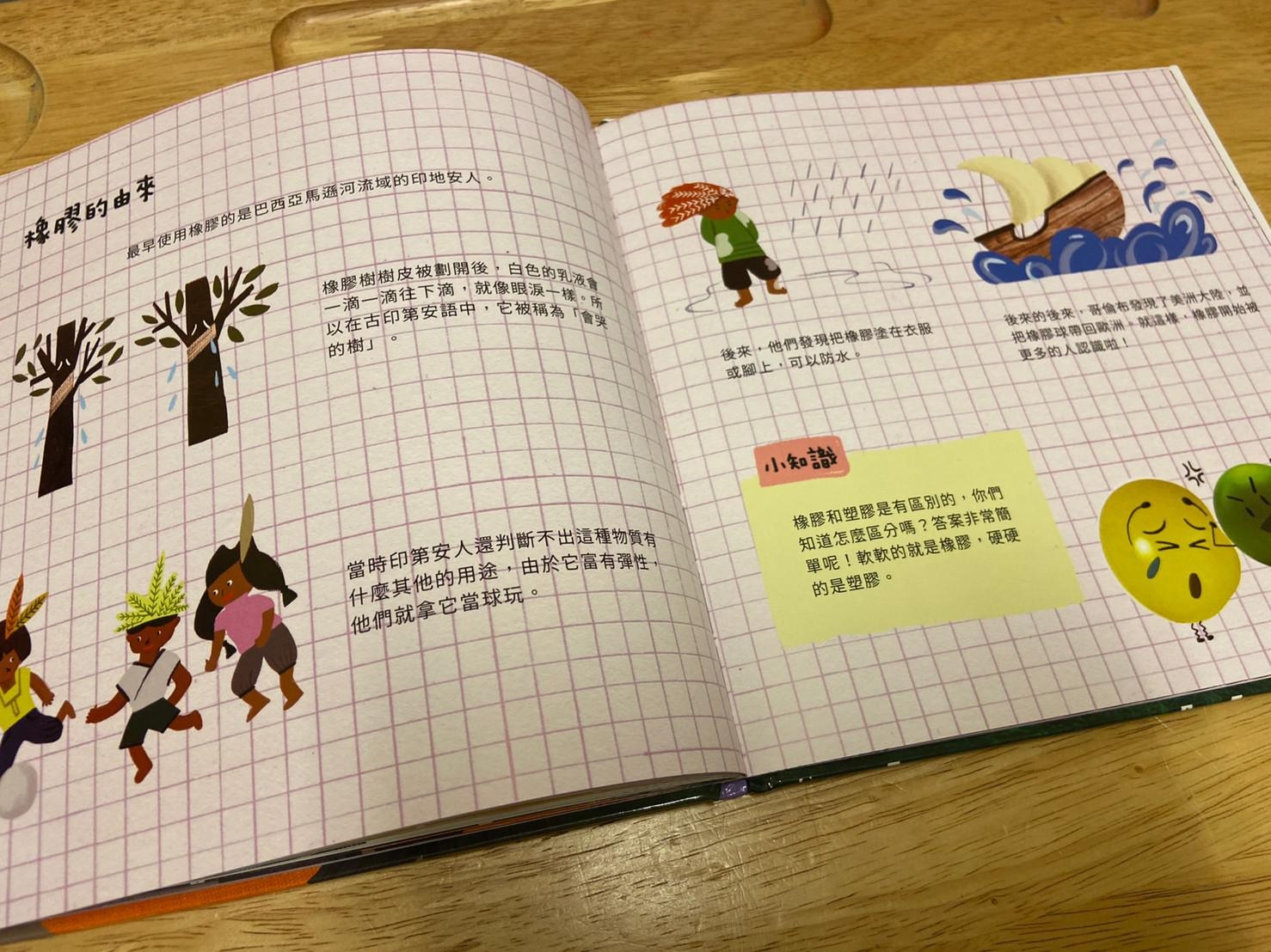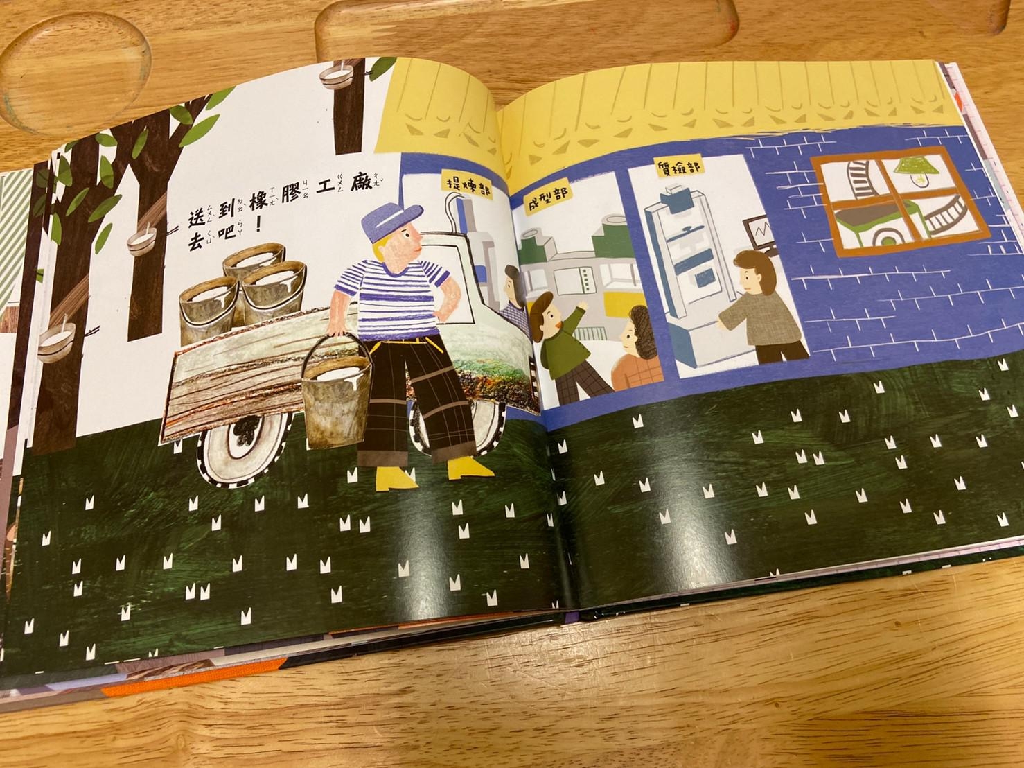 從小孩最常接觸到的橡皮擦開始做延伸,帶出橡皮擦的製作過程和原料,再從原料橡膠樹的汁液延伸介紹到其他再製品,書的後面請小朋友舉一反三列出生活中其他的橡膠製品,書裡面還有其他相關於橡膠的發現、橡皮擦的發現…等相關補充。