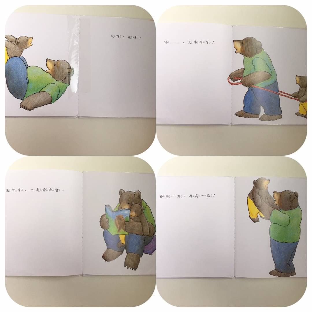最一開始購入這本書時,是希望爸爸可以陪寶寶共讀,內容很簡單,有一些互動可以跟寶寶一起做,尤其是裡面的「飛高高」寶寶很喜歡玩~直到現在一歲十個月也很喜歡~一開始共讀時是寶寶10個月,直到現在繪本裡的動作都可以互動的很好囉!