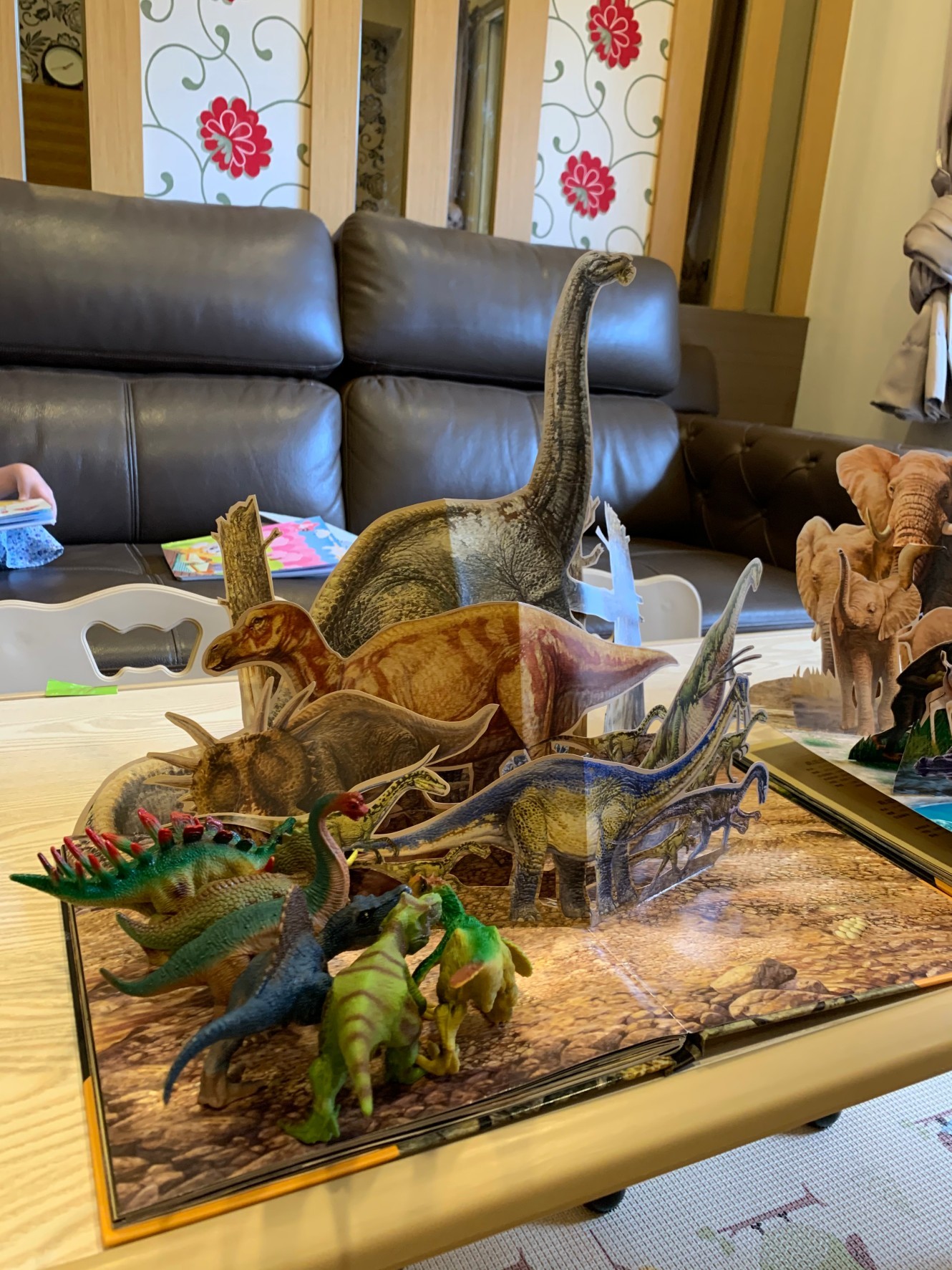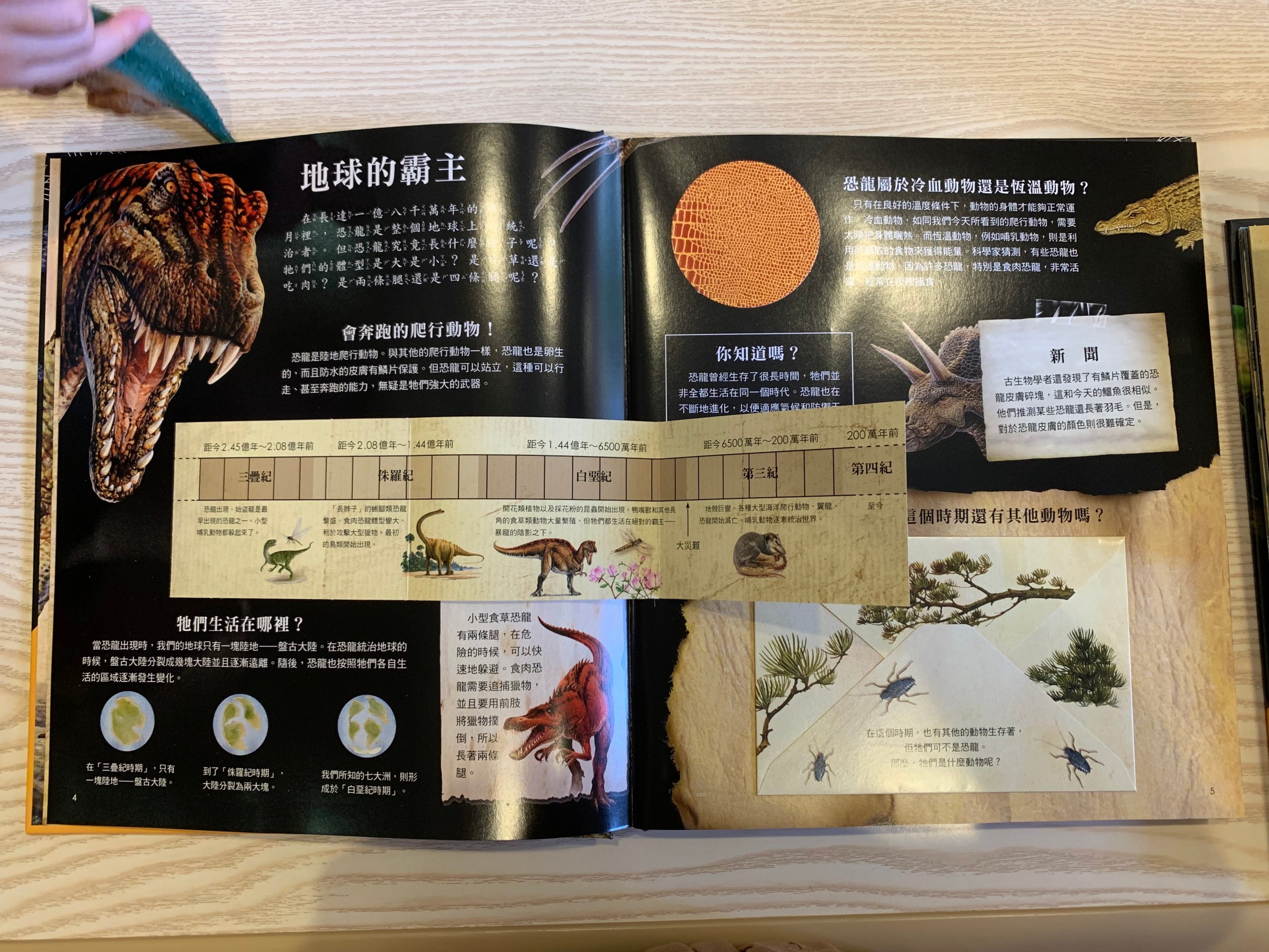 我兒子還拿恐龍模型放在立體頁的恐龍旁邊,實在很可愛。