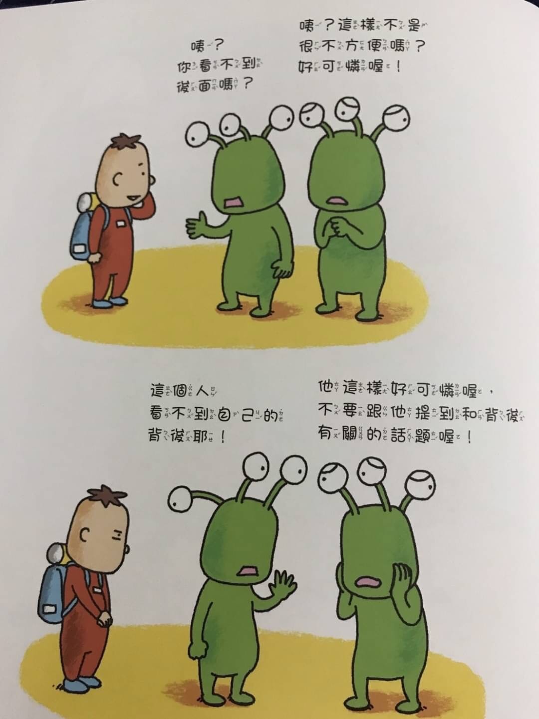 透過此繪本讓孩子理解什麼是「同理心」,當孩子能站在別人的角度去思考他人的處境與行為時,才能學會尊重、包容與真切的關心他人。