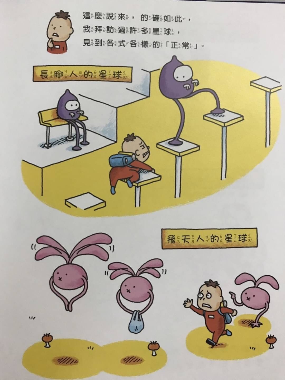 主角拜訪不同的星球,看到各種長相不同的外星人,漸漸理解每個人因為生心理的不同對於生活環境和感受也有不同。