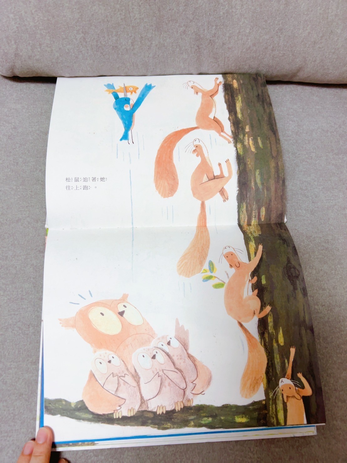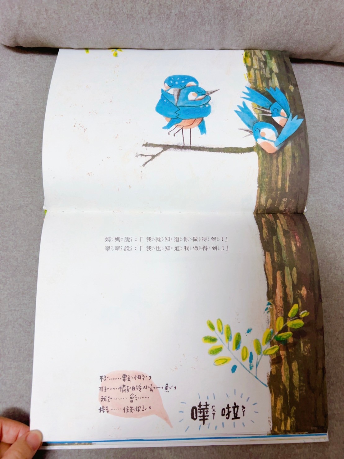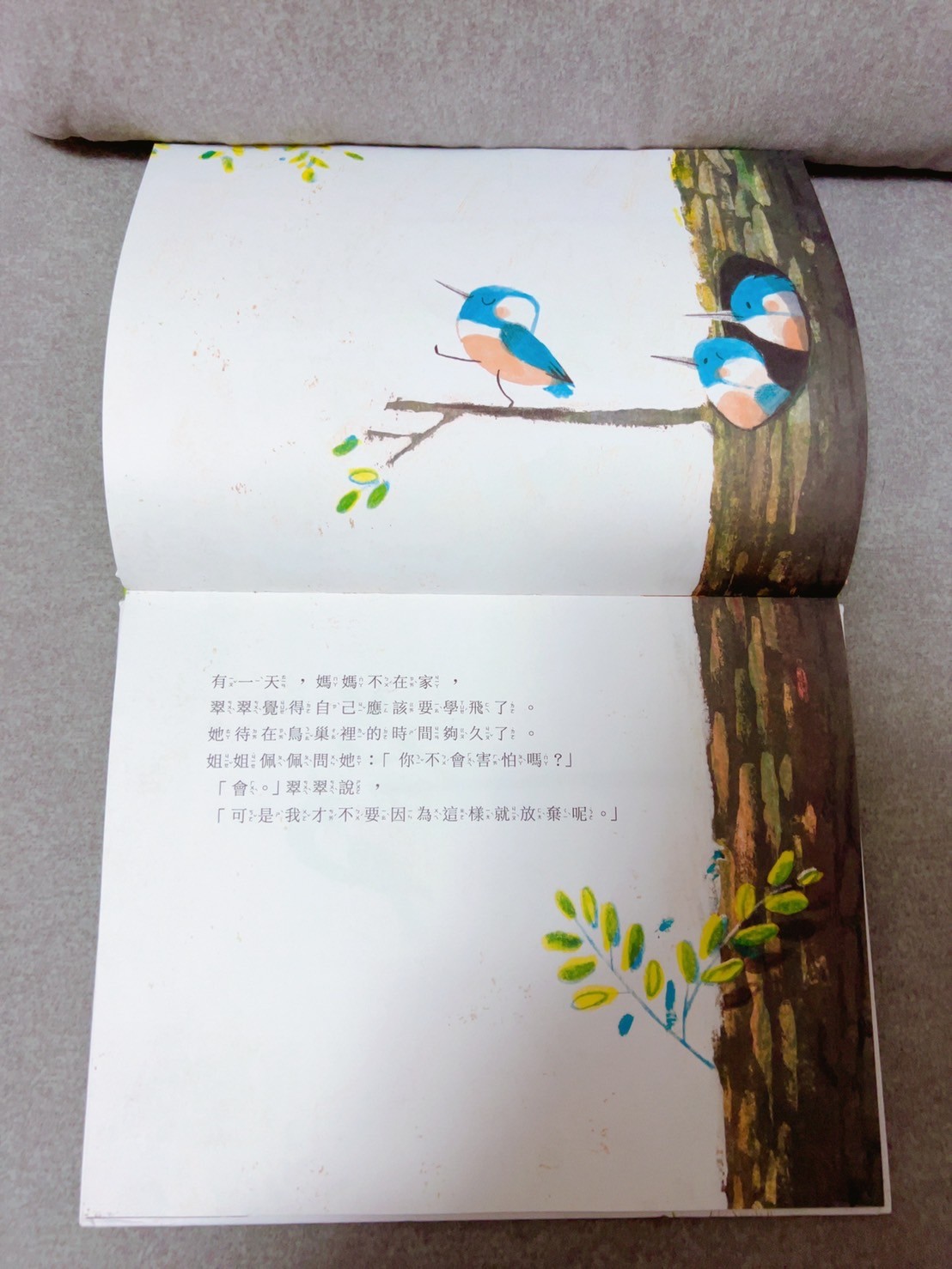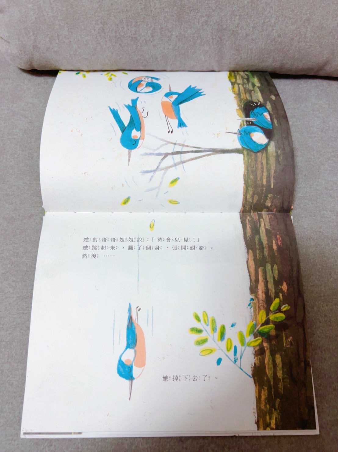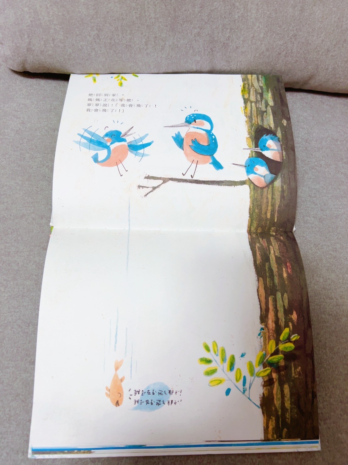 書的主角是一隻叫做翠翠的小鳥想要學會飛,鳥從樹枝上勇敢的往下一跳!途中樹上的動物們都試著要救翠翠,但翠翠還是一路掉到了水中