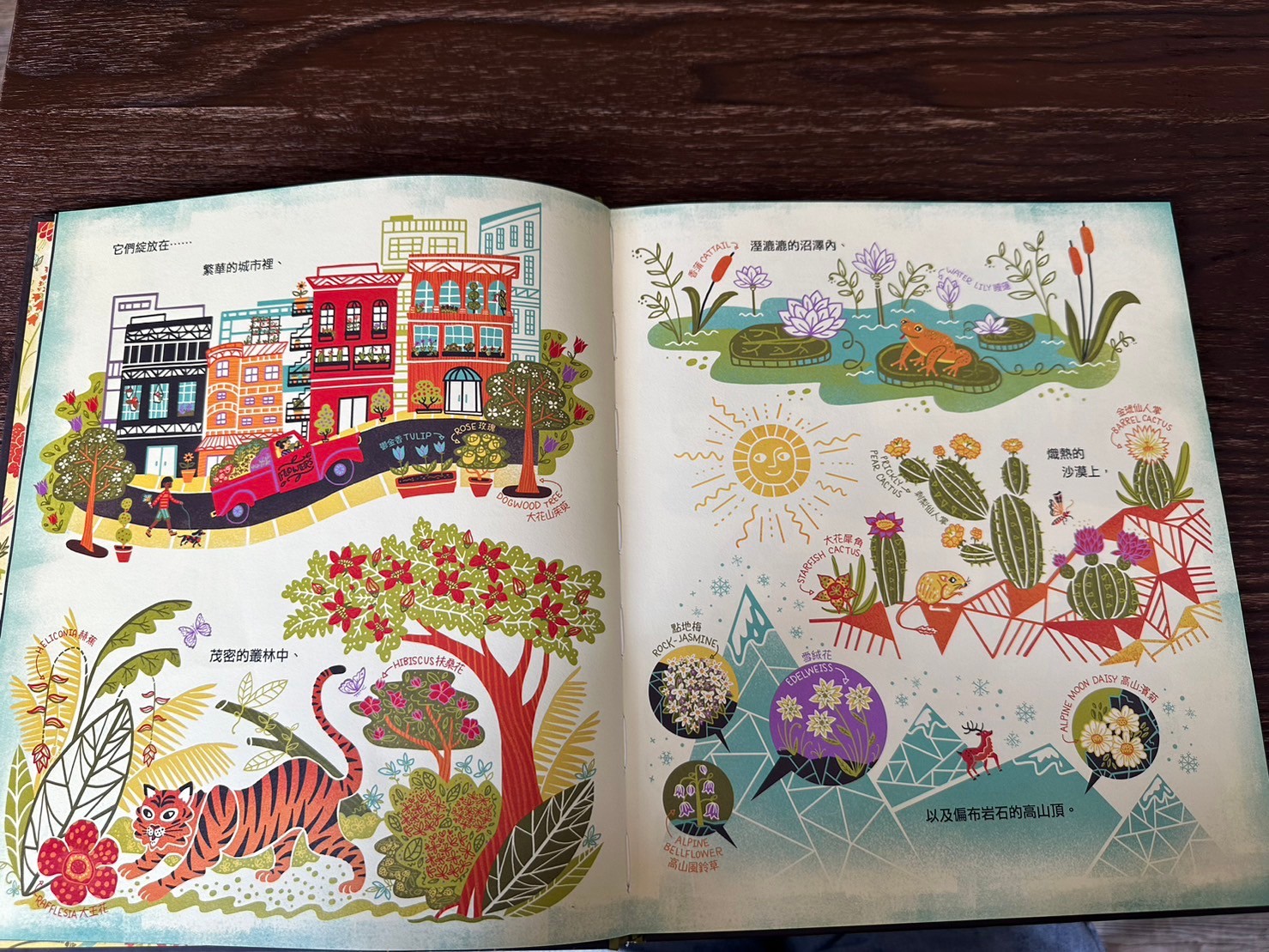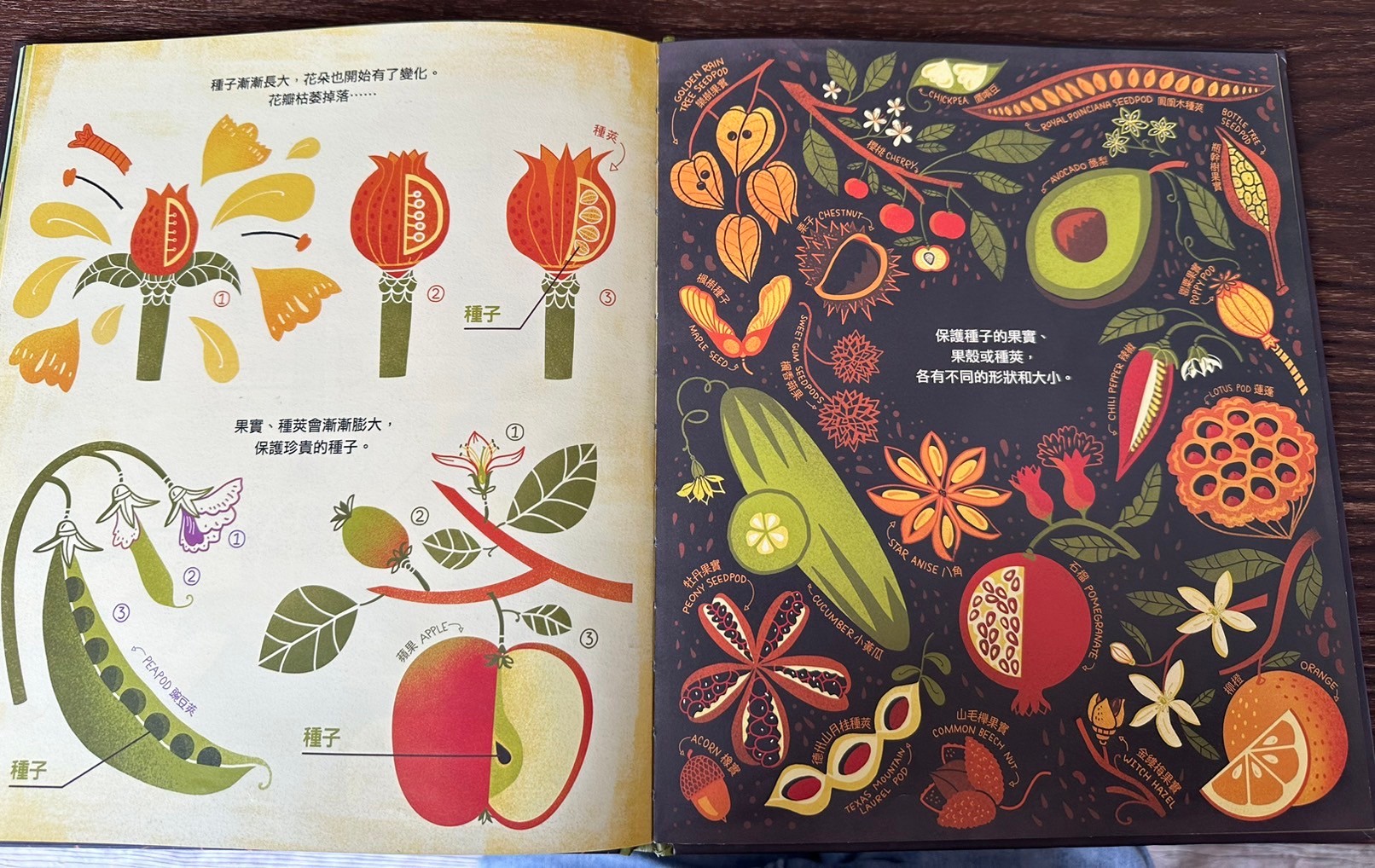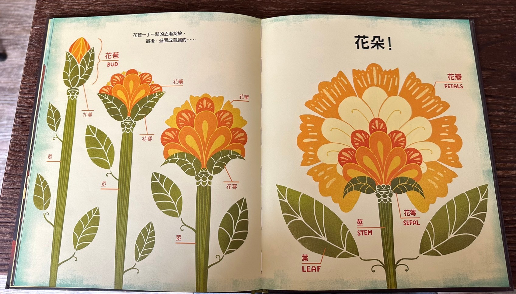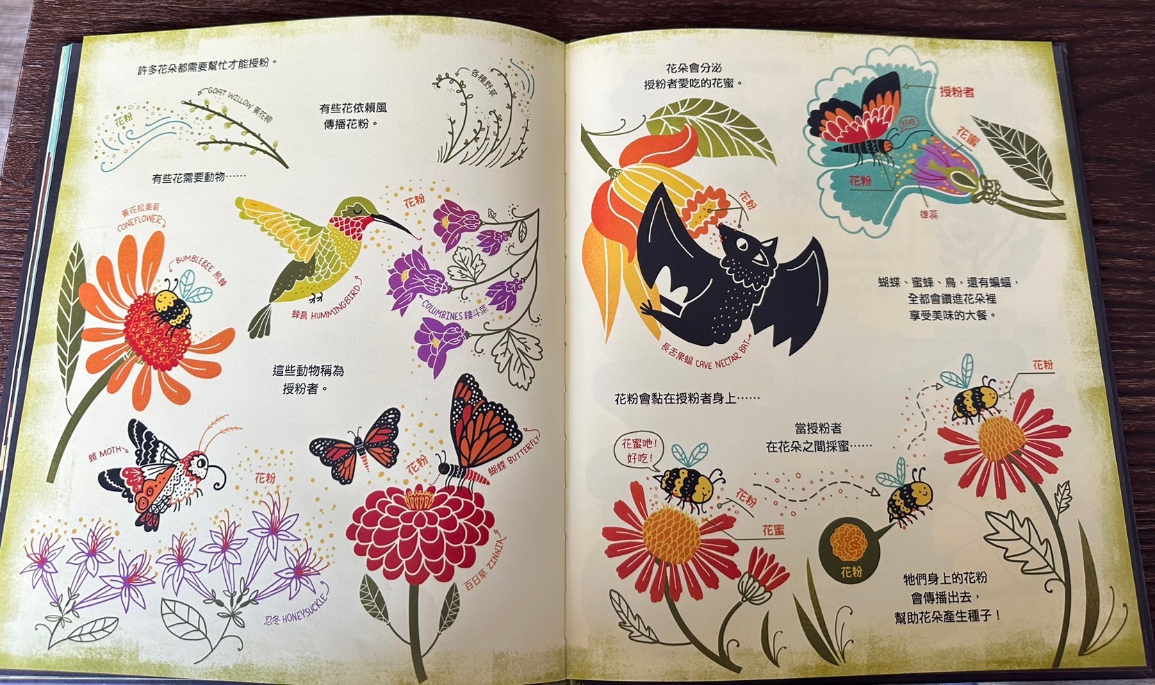 心得:3月初我們辦了一個花農結合花藝的課程,意外得知原來百合花六片看似花瓣的構造其實是3片花瓣+3片花萼,媽媽自己在高中就非常喜歡生物課堂上關於花的那個章節,所以我找了一下有沒有關於花的繪本,家中竟然翻了半天只有1-2本,而且內容相對比較淺一點,所以搜尋到了這本,剛好圖書館有就立刻借了,翻開內容覺得這本就是我想要的內容!而且圖畫的好可愛!我還立刻搜尋作者,借了其他作品,今天終於跟莎莎一起讀完,這本書內容比較難一點,但是圖案跟內容真的非常適合做延伸,我跟爸爸自己很喜歡喔!把花朵授粉的內容畫的很詳細也很可愛!