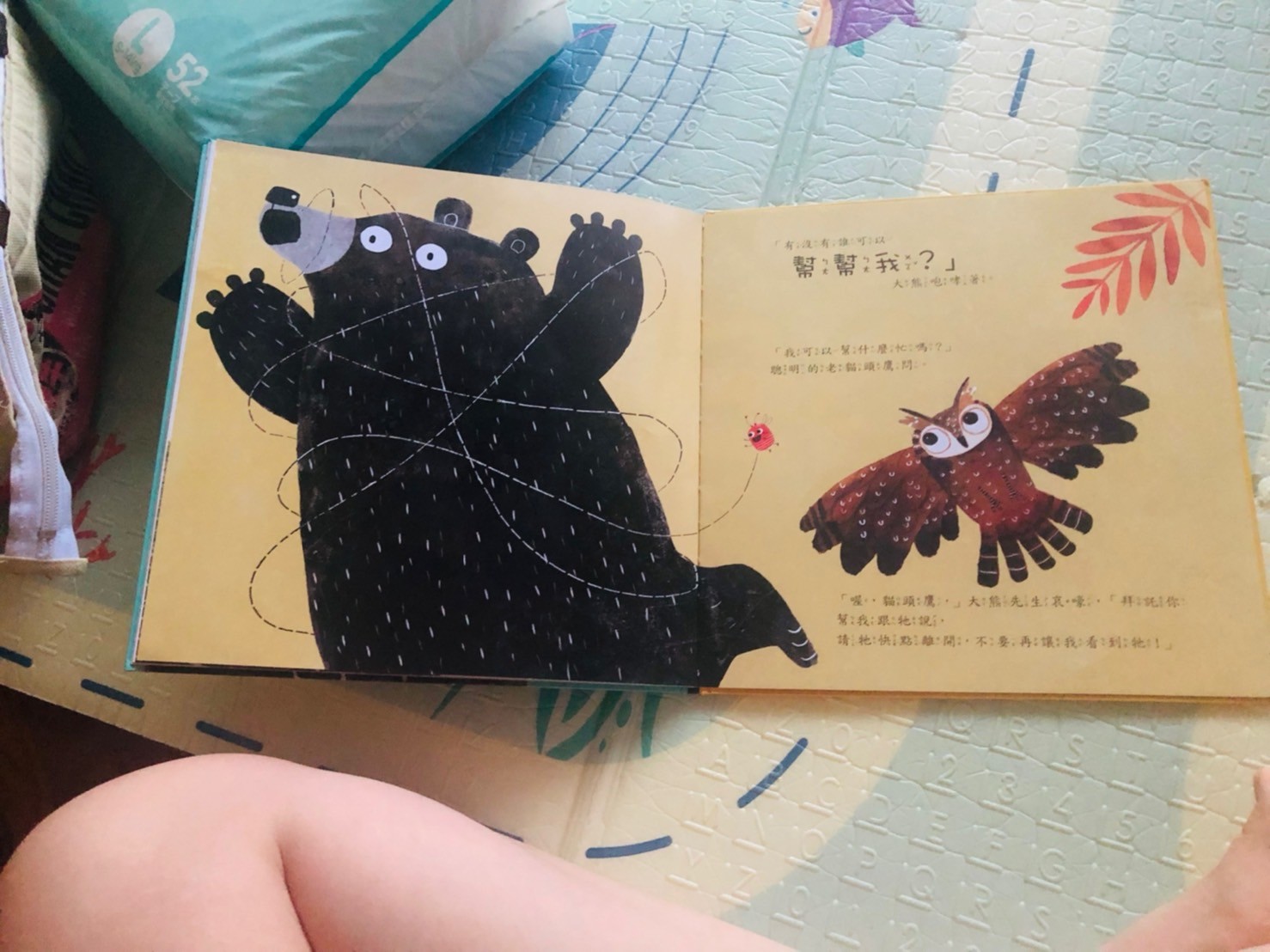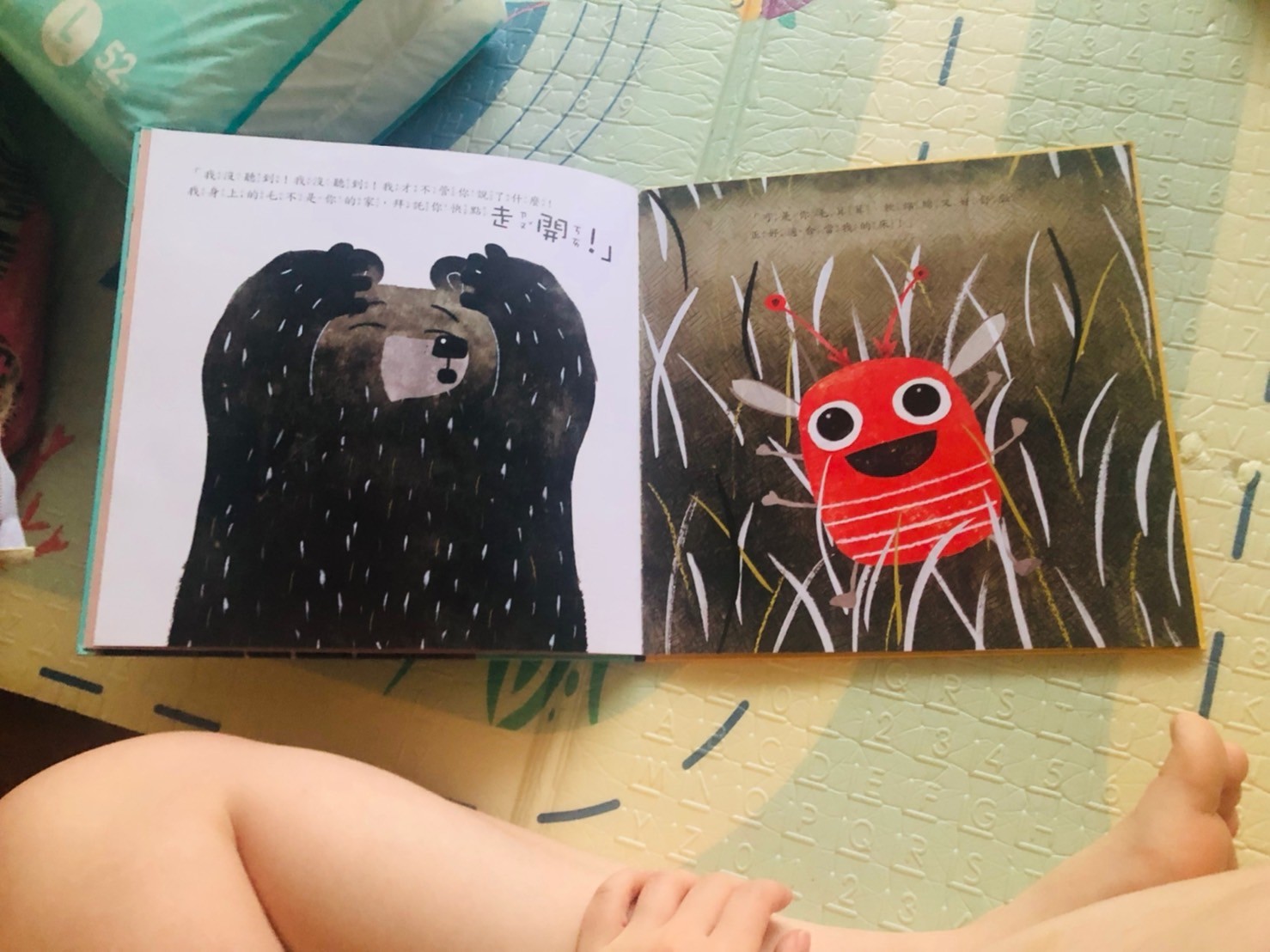 心得:當初買了一套三本 大約是8m的時候買的,三本一直都不太買單,冷落到大約1y3m突然很愛這本《蟲出沒!熊小心》,兩天會點名一次,故事情節是一隻小蟲很愛大熊想要在大熊身上睡覺,大熊很生氣但是也好好跟小蟲說不要吵他,小蟲很堅持要住在大熊身上,最後貓頭鷹介紹小蟲給樹懶,事件和平落幕,寶寶最愛的一段就是小蟲不停地煩大熊,大熊也不斷的表達自己的想法這一段,可能覺得蟲蟲飛來飛去很好玩? 或是她可能有類似的感受?