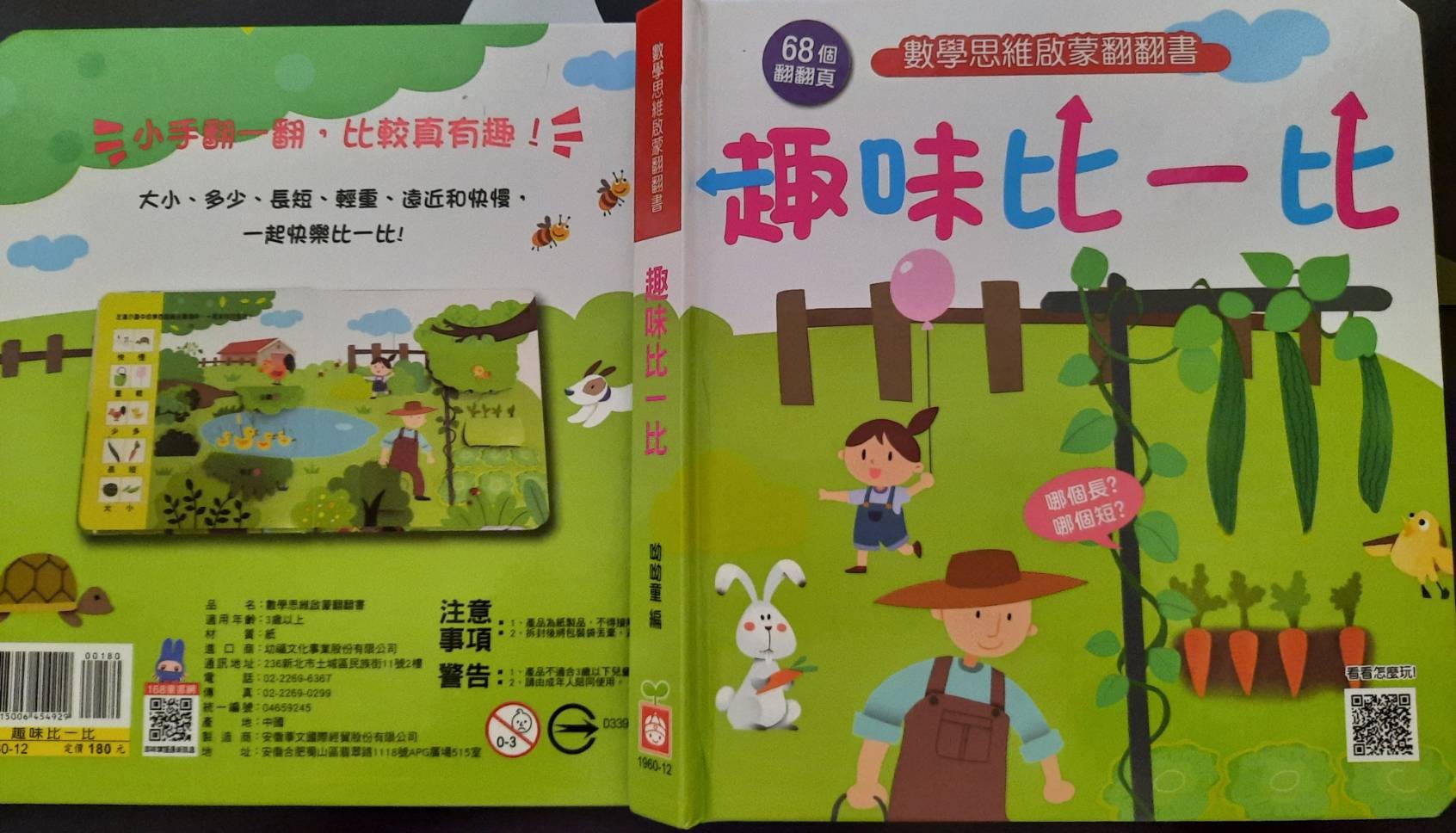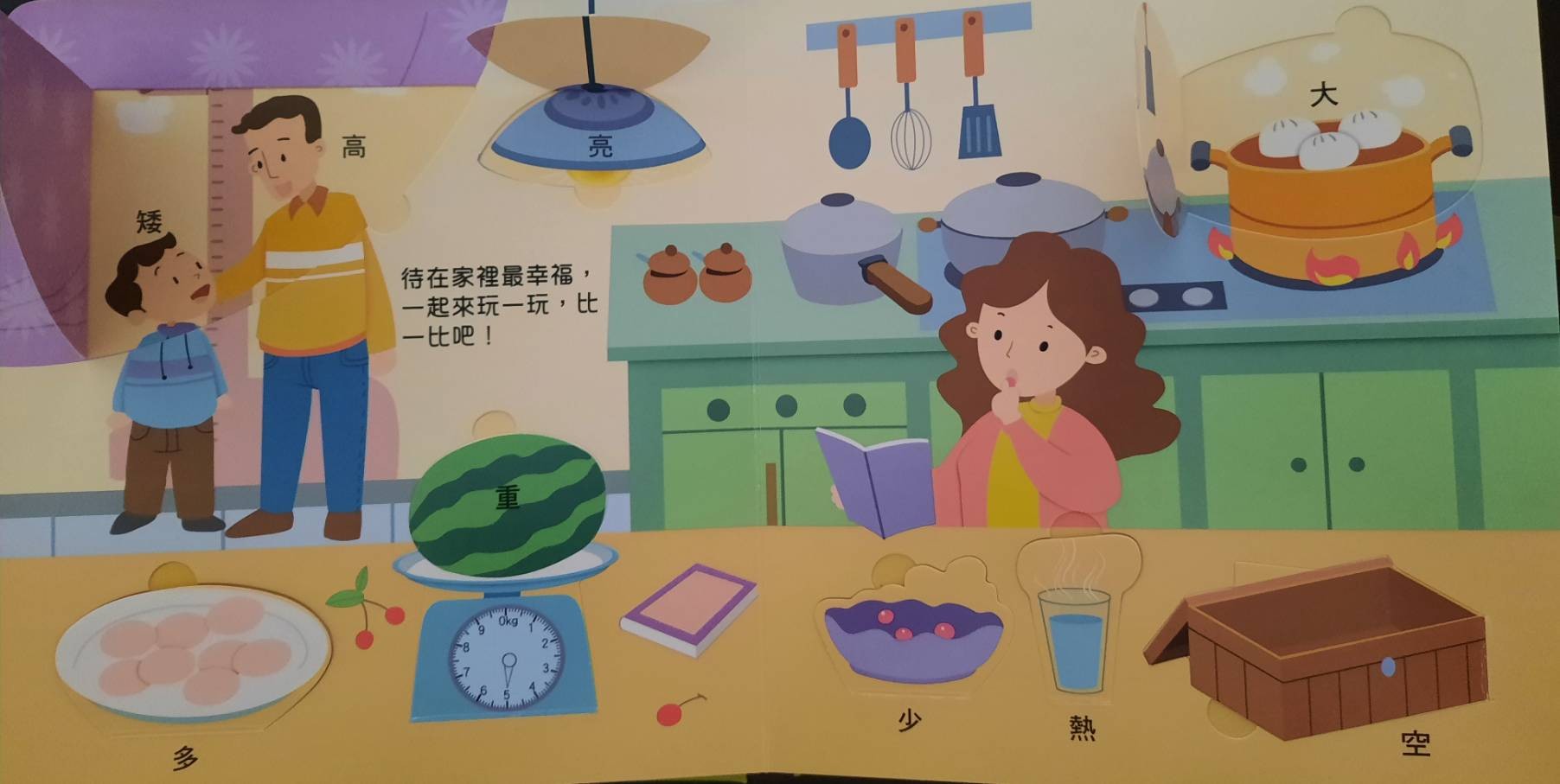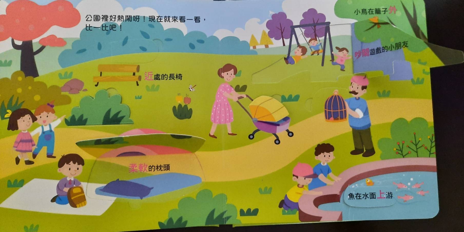 這本書有著 大小、多少、長短、輕重、遠近、快慢的比一比,每頁的內容帶入不同場景動物園.農場.廚房.公園.校園的比較,利用翻翻書來答出答案,當翻起後 也能配合到場景,算是很細膩的一本書,大寶在問答 對於 輕重 遠近 會搞不清楚,平時利用數字概念.擺放距離 慢慢答錯機率變少。而這本也能當成小寶的場景故事書,只是每次媽媽我都講的不一樣xd