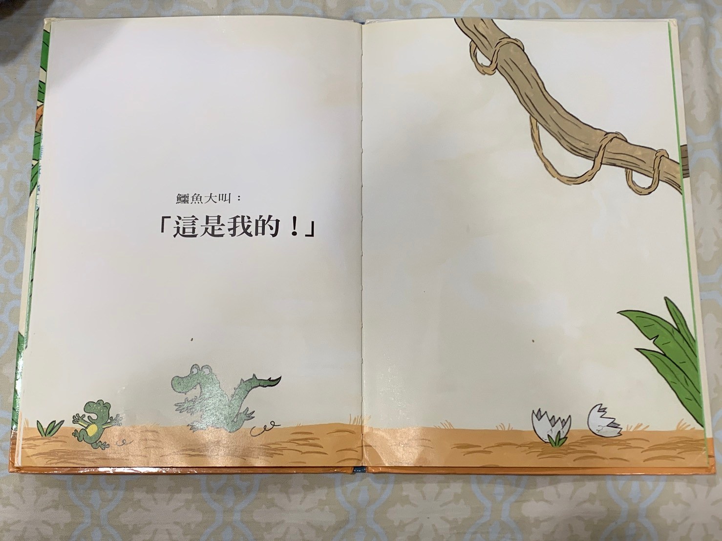 青蛙開心的說蛋終於是我的時刻,蛋裂開跑出一隻小鱷魚追著青蛙大叫「這是我的!」。
