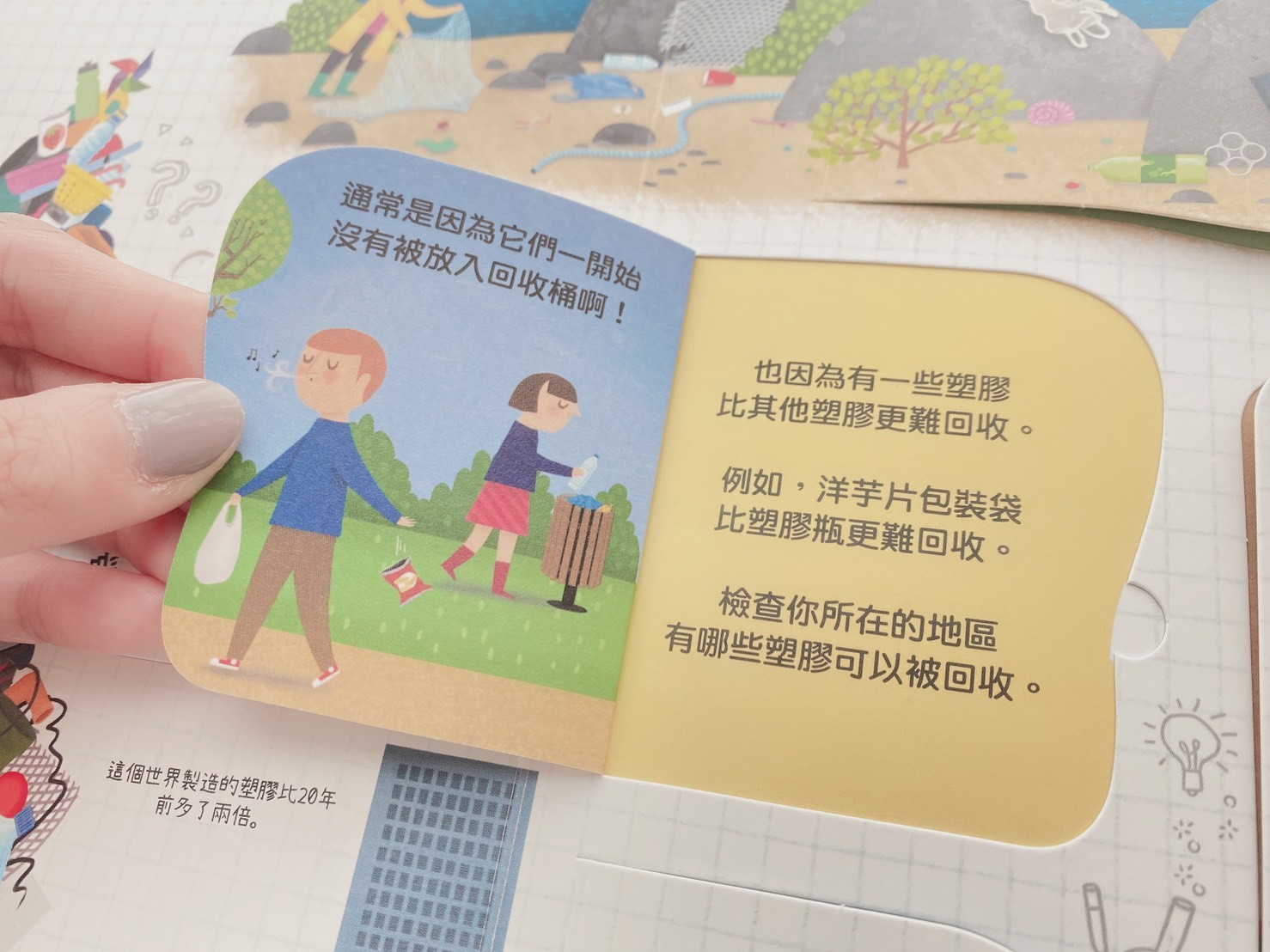 從漩漩開始會想要自己丟垃圾後,變開始教導孩子如何妥善作分類,才發現原來自己懂得塑膠相關知識也很少!看了這本之後透過提問、翻頁,對於塑膠的發明和意義更加了解如何看待塑膠影響人類生活,也能更珍惜地球並且妥善資源回收、永續利用。