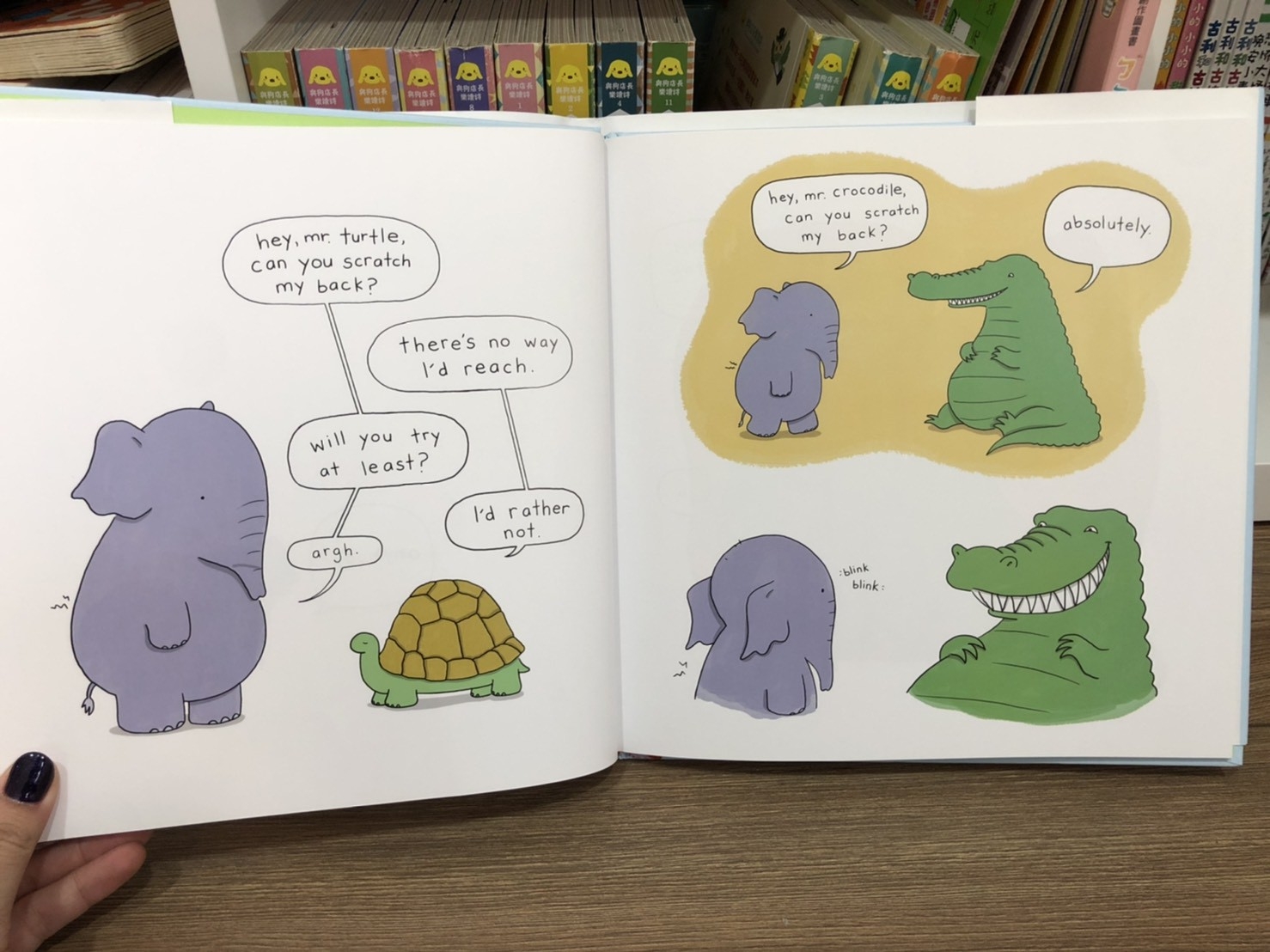 這本書是喬喬只聽一次就記憶深刻的一本書,繪本的主角就是一隻背很癢的大象,到處尋求其他動物幫忙他抓背,結果鱷魚嘴角邪惡的微笑、小蛇熱情但是卻沒有手、兔子搞不清楚狀況的幫忙,結果大象繞了一圈還是沒抓到癢