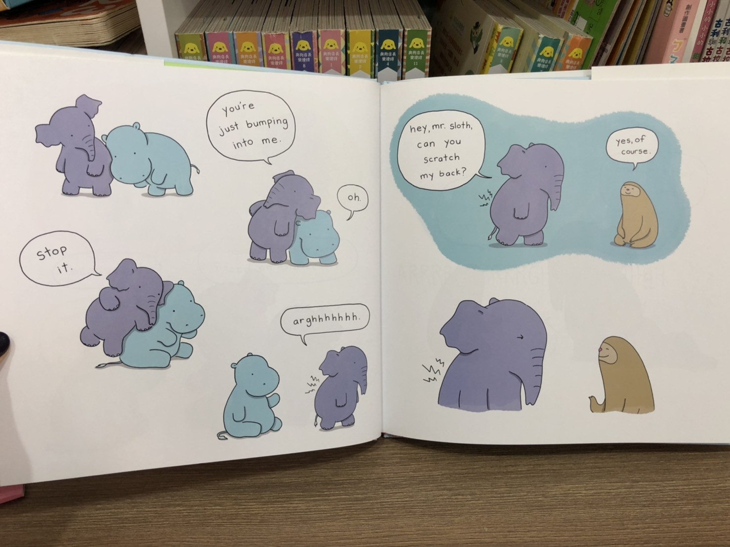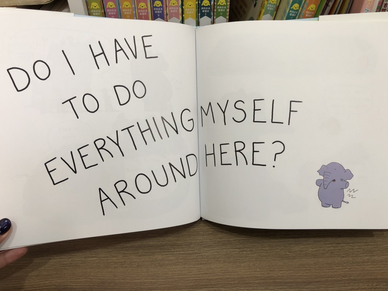 最後出現了一種動物,讓大象得以解決他的需求,但是大象卻「用完就丟」,我還記得喬喬一看到這頁,馬上轉頭跟我說「媽媽,這樣不對耶,要跟人家說謝謝啊」這反應也讓人會心一笑呢!