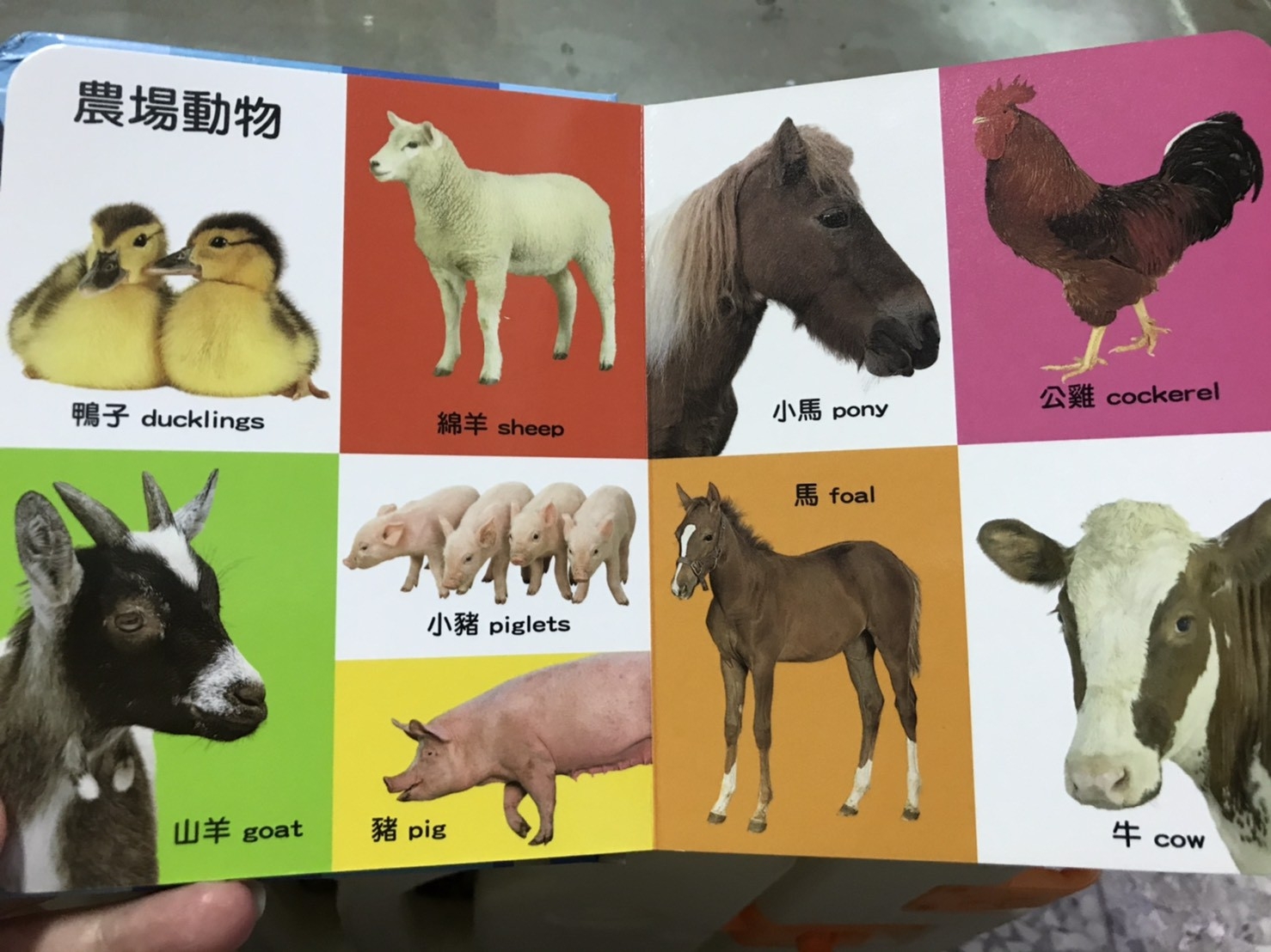 100種動物區分為農場動物、極地動物、寵物的多種類,除了真實圖片搭配中文外,還有動物的英文,教學學習上父母也可以順便學習(確實有的我自己都不知道那動物的英文)!