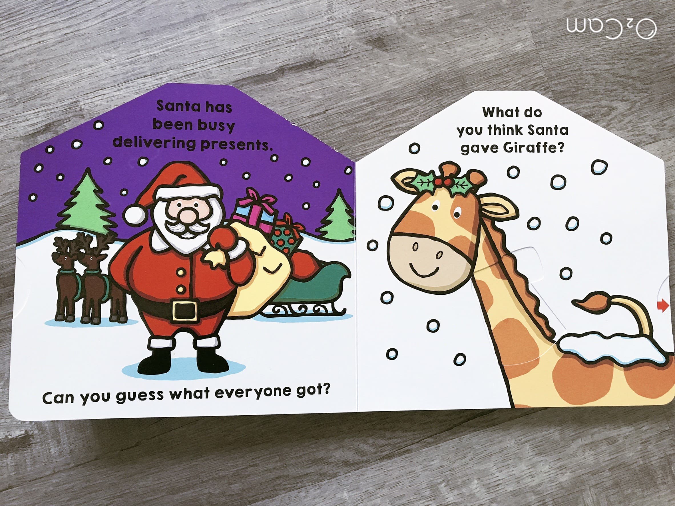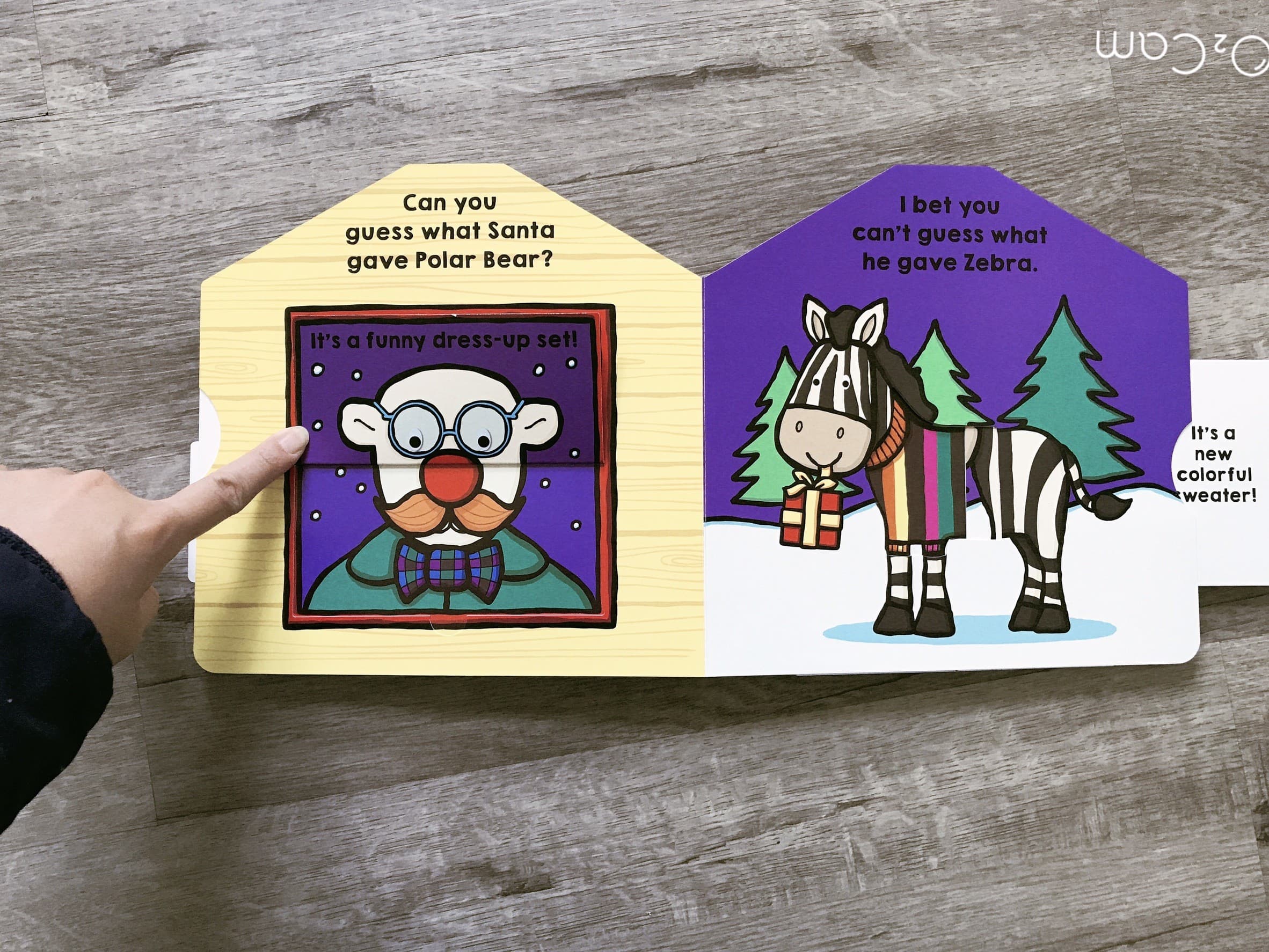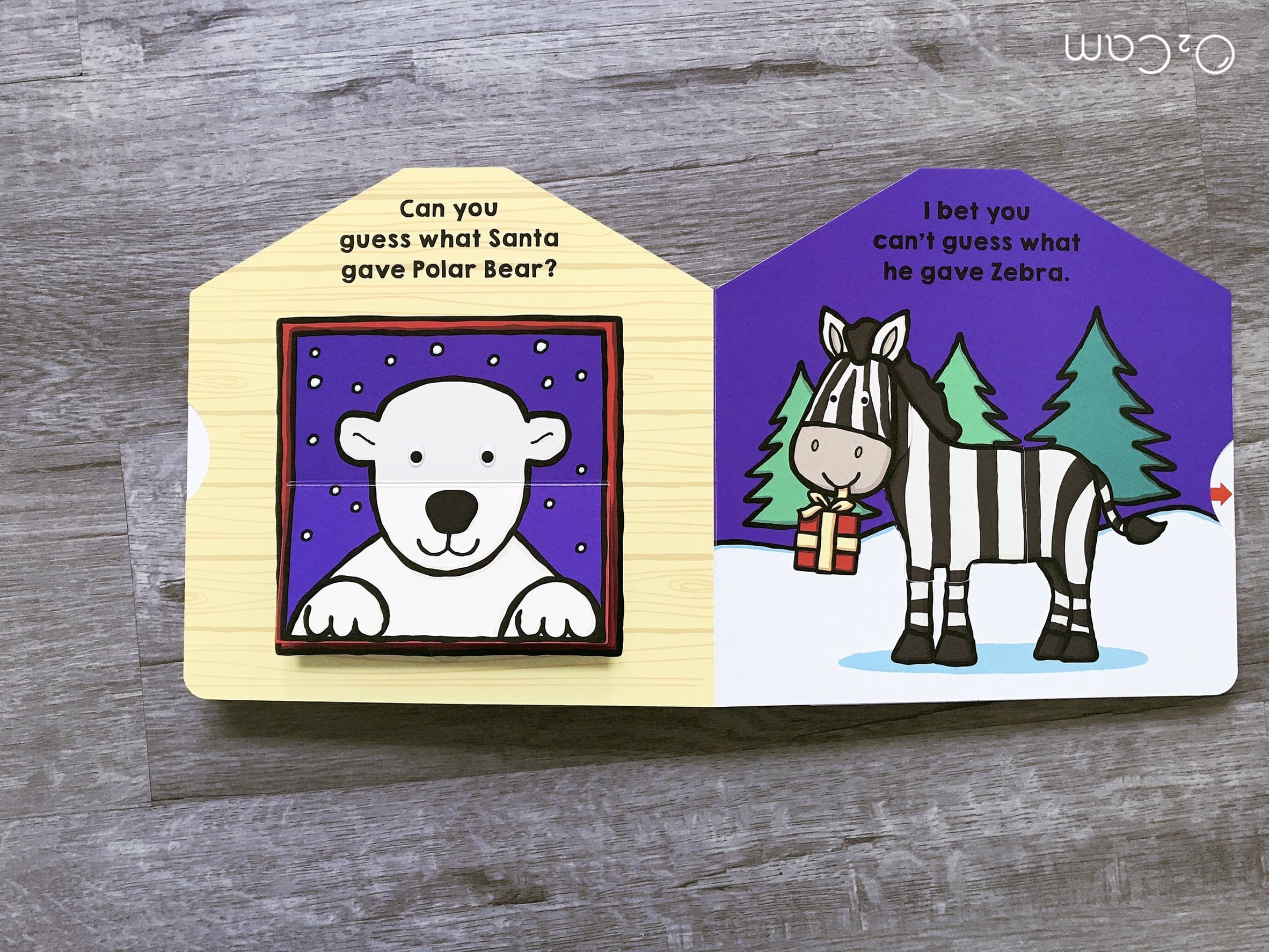 這本是當初特價時被可愛的畫風吸引購入,是本有趣的互動硬頁翻翻書,也是從比較少見的聖誕禮物角度切入,幫聖誕老公公發給每個小動物禮物,每個小動物收到的禮物其實都挺幽默的,邊看每個小動物禮物邊笑,每一頁都有好玩有趣的設計,掀開河馬、猴子的肚子,拉開長頸鹿背上的鬃毛,每個翻頁、拉頁都是一個大驚奇,閃亮亮的結尾更能吸引寶貝的目光。彷彿參加尋寶遊戲一般,透過顏色明亮、對比強烈的圖畫,尋找自己最喜歡的禮物。