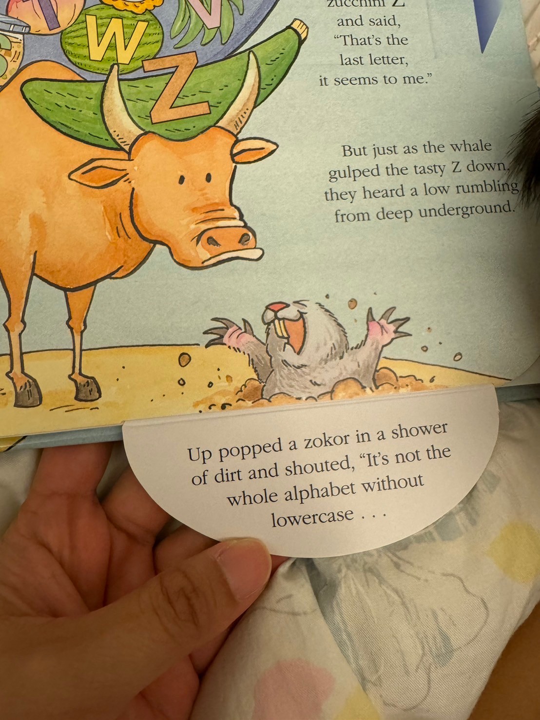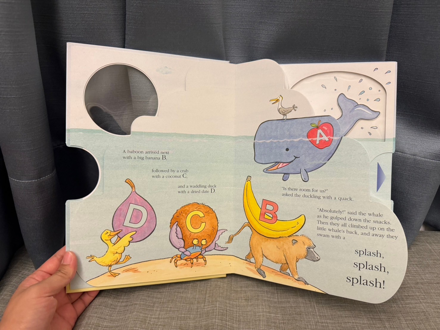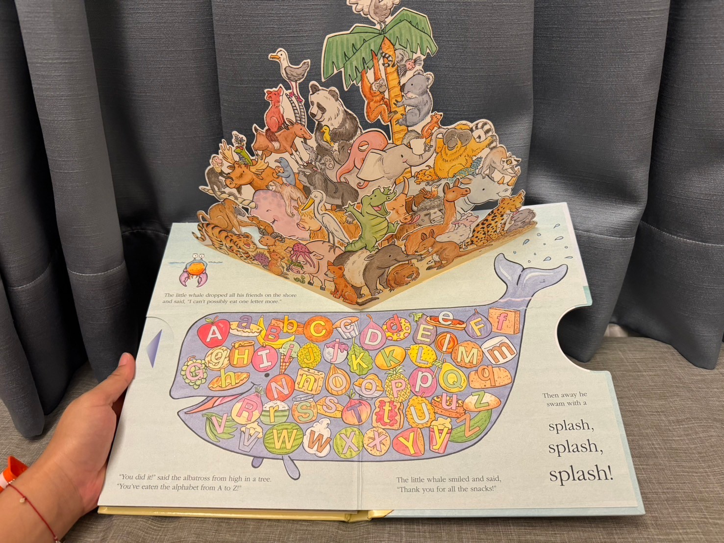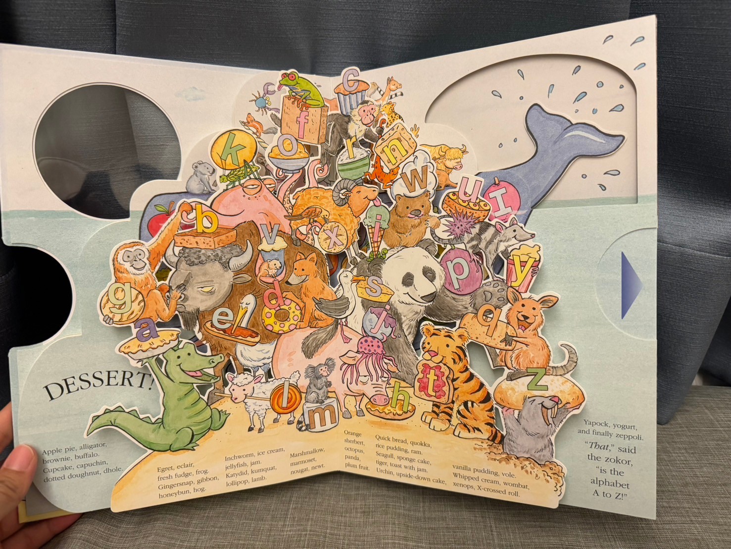 他在說一隻小鯨魚餓了,可以吃字母A-Z,於是由各個字母開頭的動物拿著那個字母的東西來給他吃,可以換來讓他們去鯨魚的背上